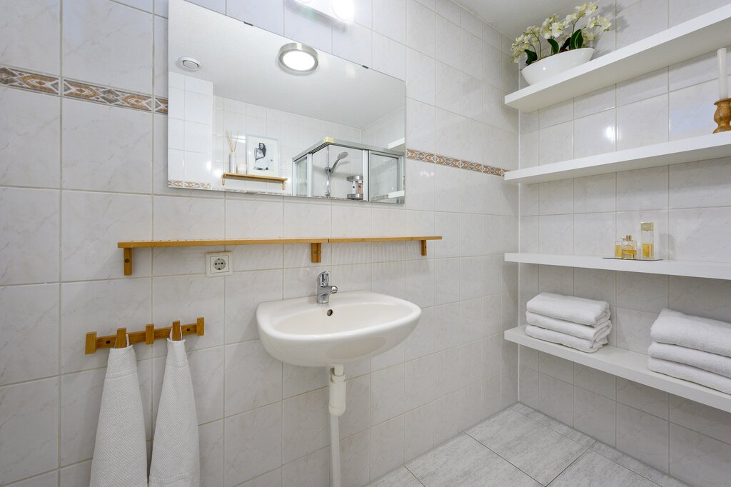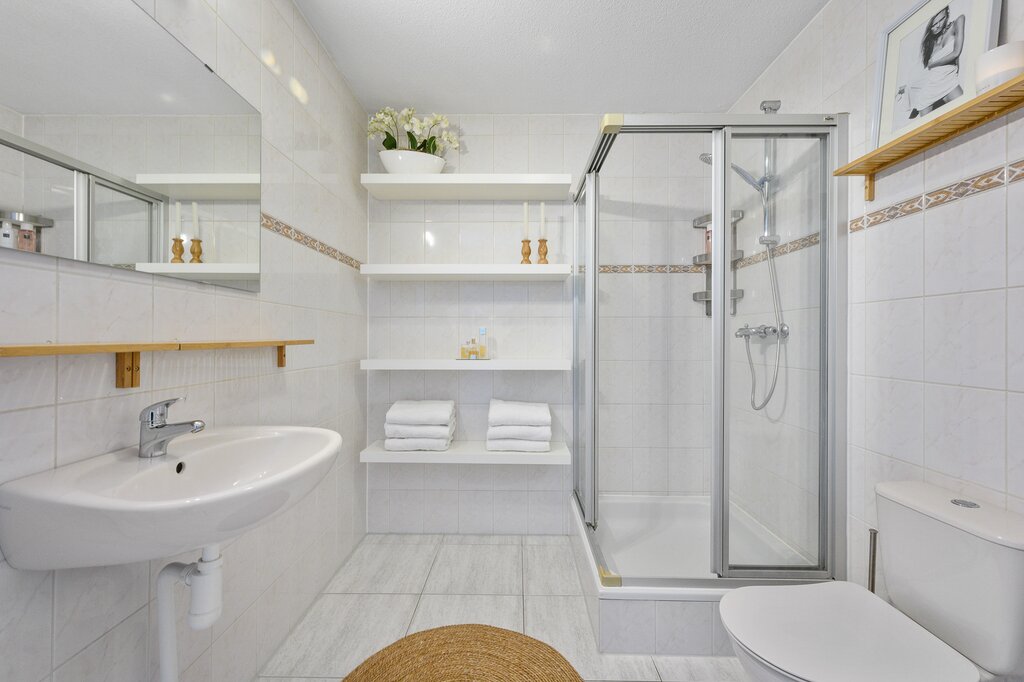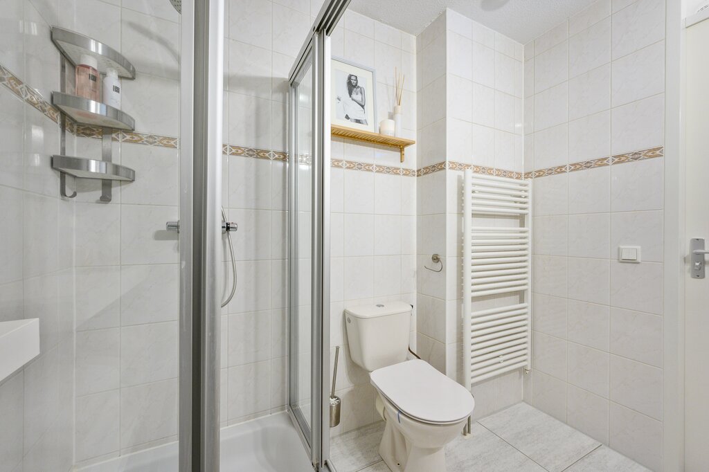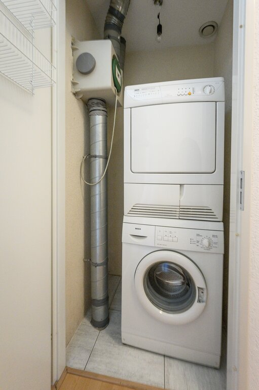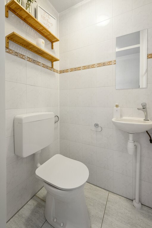 First floor layout: landing with two spacious bedrooms. The spacious bathroom has a shower cabin, a second toilet, a sink and a design radiator. The laundry room is equipped with storage space and offers space for a washing machine and dryer.