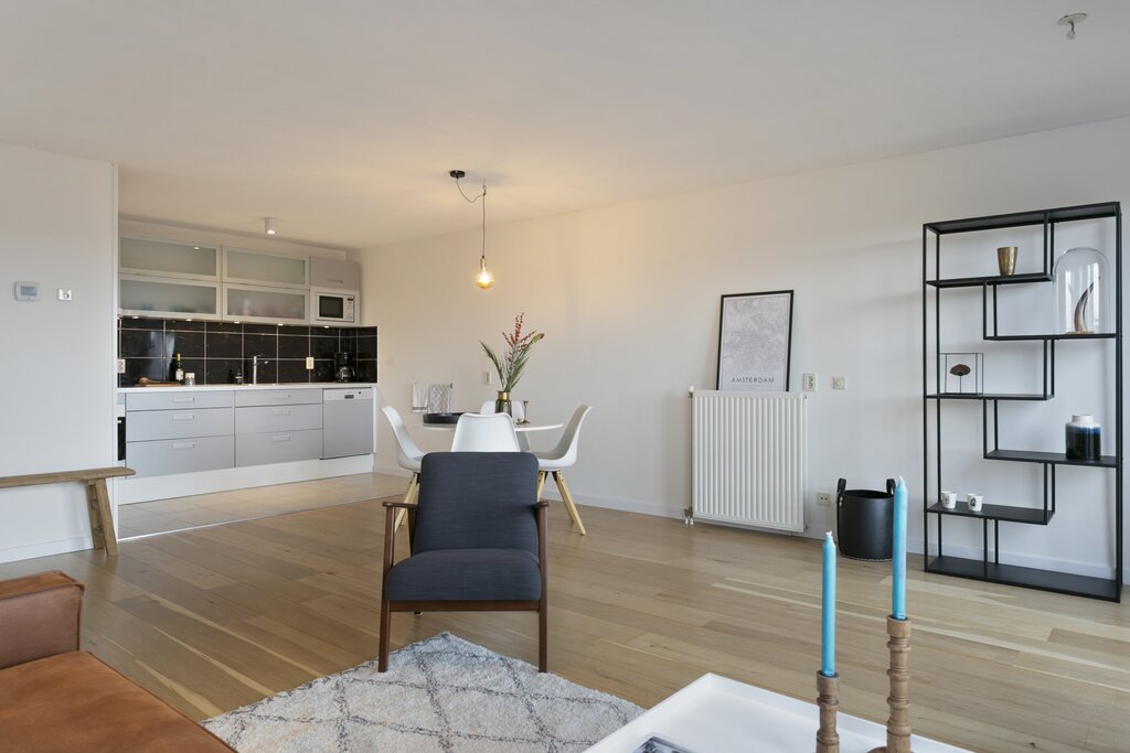 Entree/hal, toilet met fonteintje, badkamer met ligbad, inloop douche en wastafel, woonkamer met Frans balkon op het zuid westen, open keuken, berging met wasmachineaansluiting, twee ruime slaapkamers.