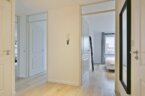 Entrance/hall, separate toilet with sink, bathroom with bathtub, walk-in shower and washbasin, living room with French balcony facing southwest, open kitchen, storage room with washing machine connection, and two spacious bedrooms.