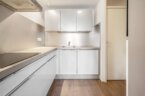 The open kitchen has a modern L-shaped layout with two built-in cabinets and various integrated appliances. There is also a practical indoor storage room with connections for a washing machine and dryer.