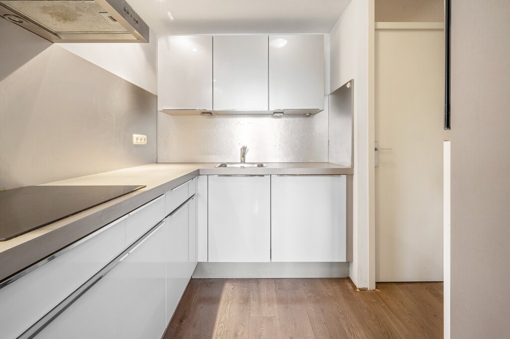 De open keuken is uitgevoerd met een moderne L-vormige keukenopstelling en twee vaste kasten voorzien van diverse inbouw apparatuur. Praktische Inpandige berging met aansluiting voor de wasmachine en droger.