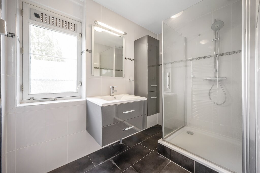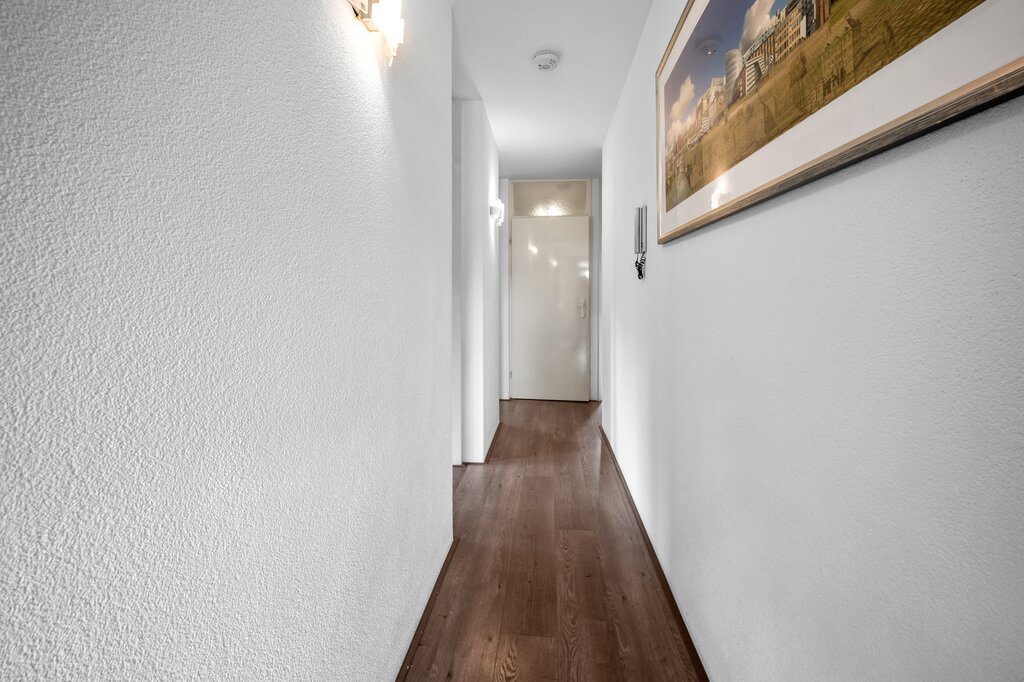 Entrance hall with a meter cupboard and a floating toilet with a small sink. At the end of the hall, you will find the well-maintained bathroom, equipped with a shower cabin, a washbasin cabinet, and additional storage space.