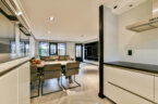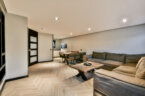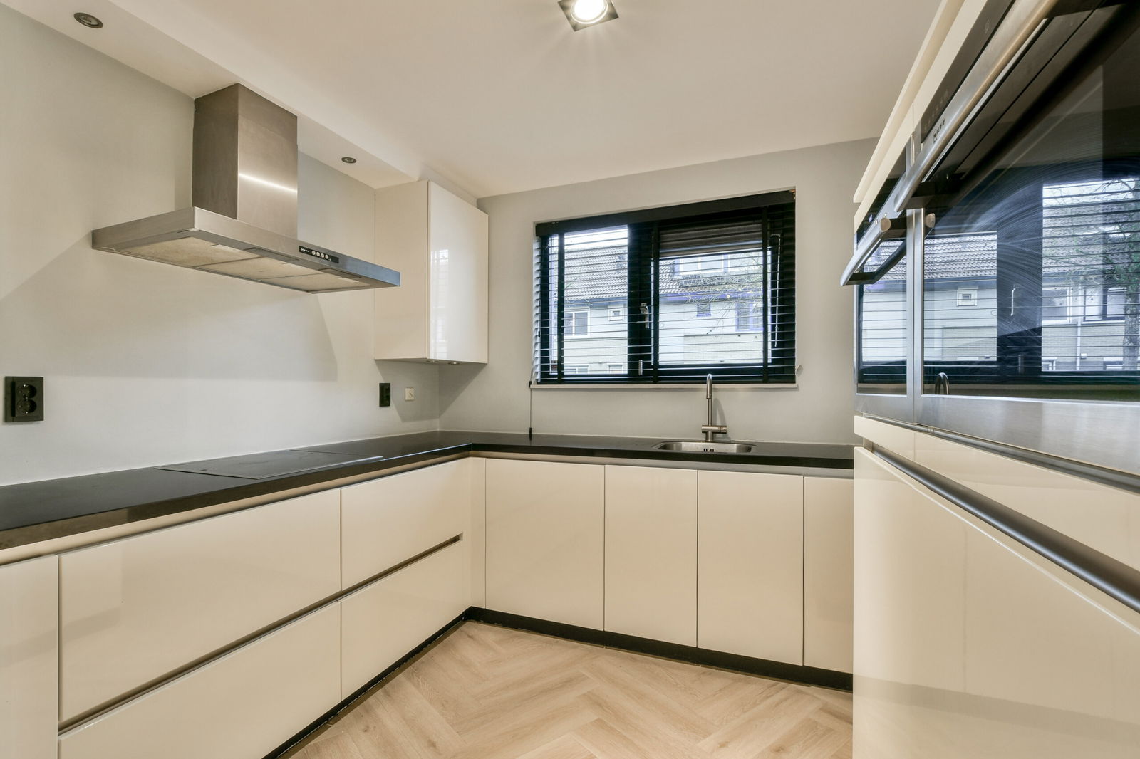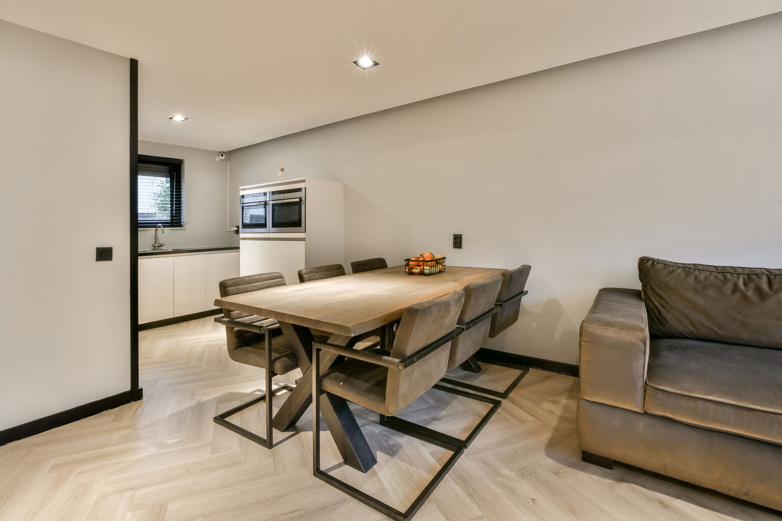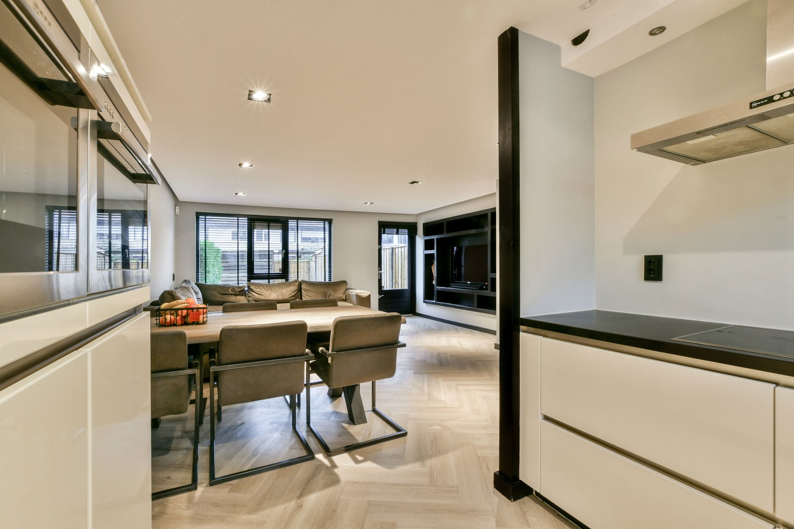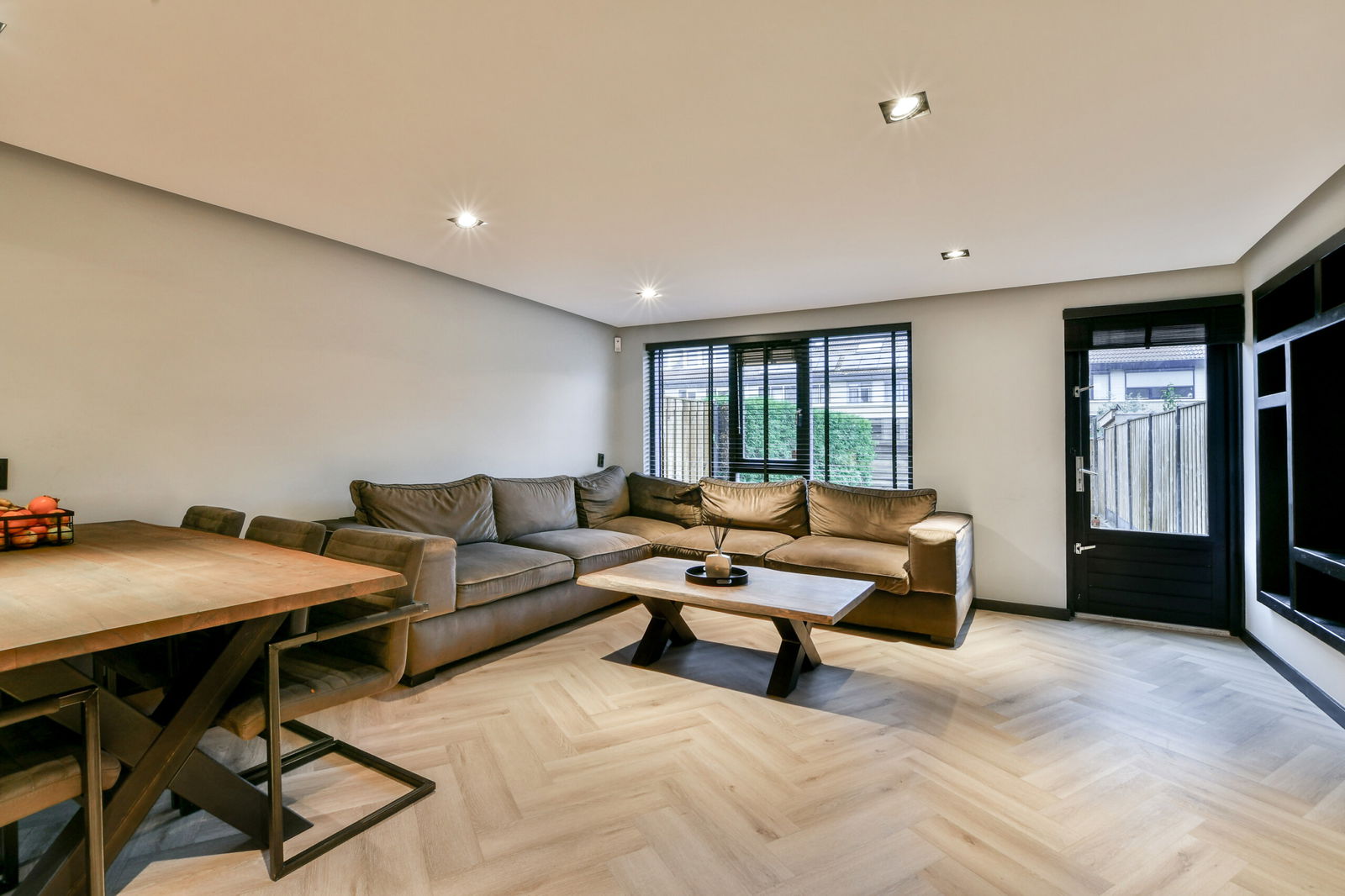 Upon entering, you step into the hall with a wardrobe, meter cupboard and the renewed ground-floor toilet. The bright and beautifully finished living room features a herringbone laminate floor with underfloor heating, recessed spotlights and plenty of natural light. A storage cupboard under the stairs provides additional space. At the front of the house is the open kitchen, equipped with a refrigerator, freezer, oven, microwave, dishwasher, induction hob, extractor, spacious drawers and an elegant composite worktop.