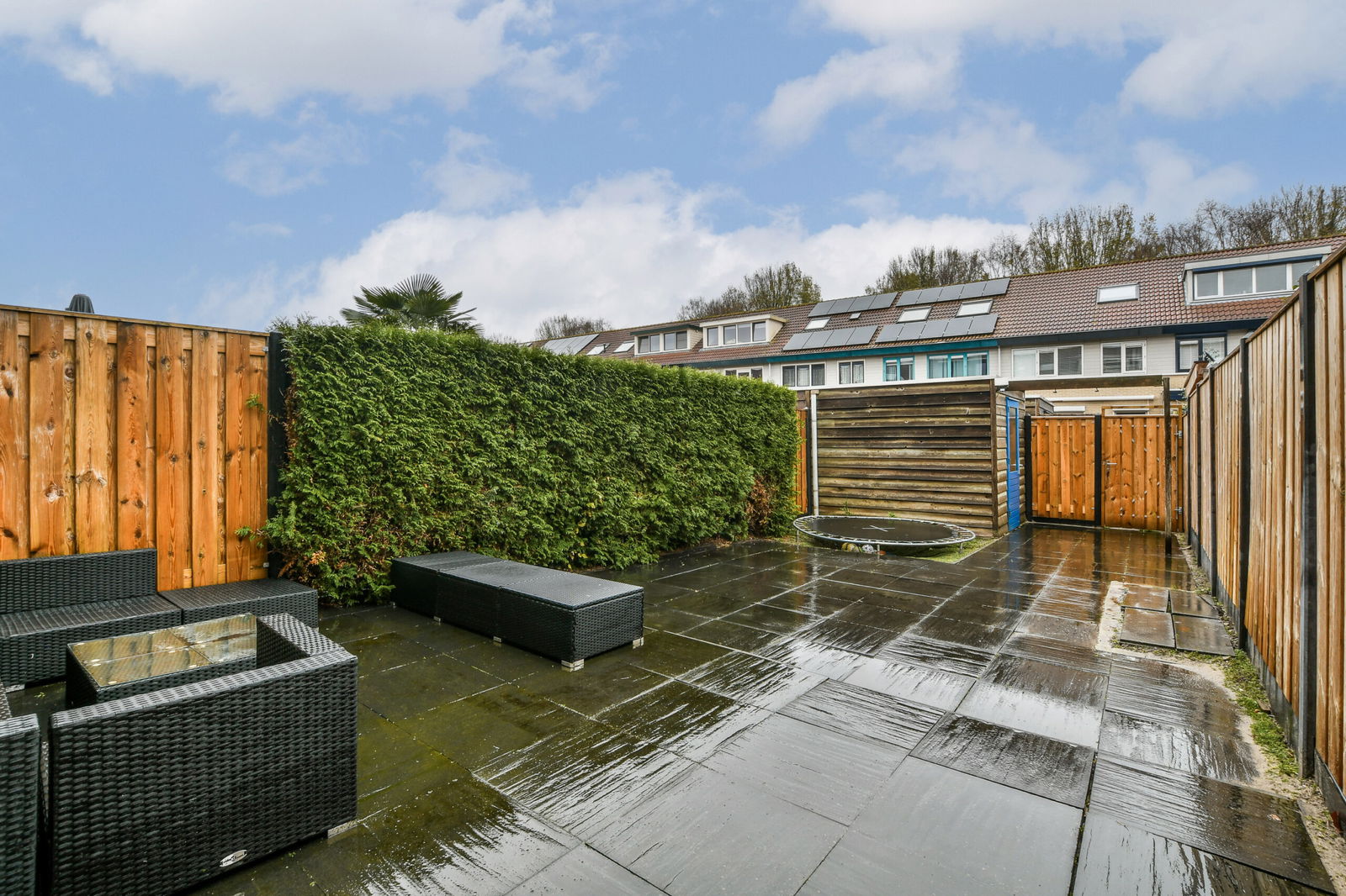 De achtertuin is verzorgd aangelegd met sierbestrating en een buitenkraan. Het is een heerlijke leeftuin, gelegen op het noordwesten, en beschikt over een houten berging die is voorzien van elektra.