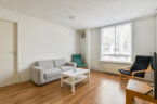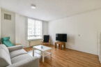 The spacious living room is situated at the front of the apartment and features large windows that allow for plenty of natural light. From the hall, you walk through to the kitchen, which is fitted with a neat kitchen unit and freestanding appliances. The rear balcony gives access, via a spiral staircase, to the private garden – a wonderful place to sit outside and relax.