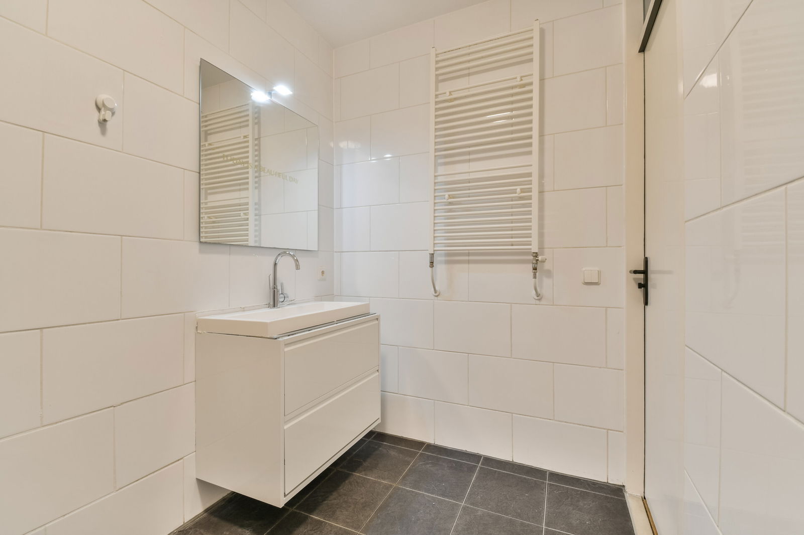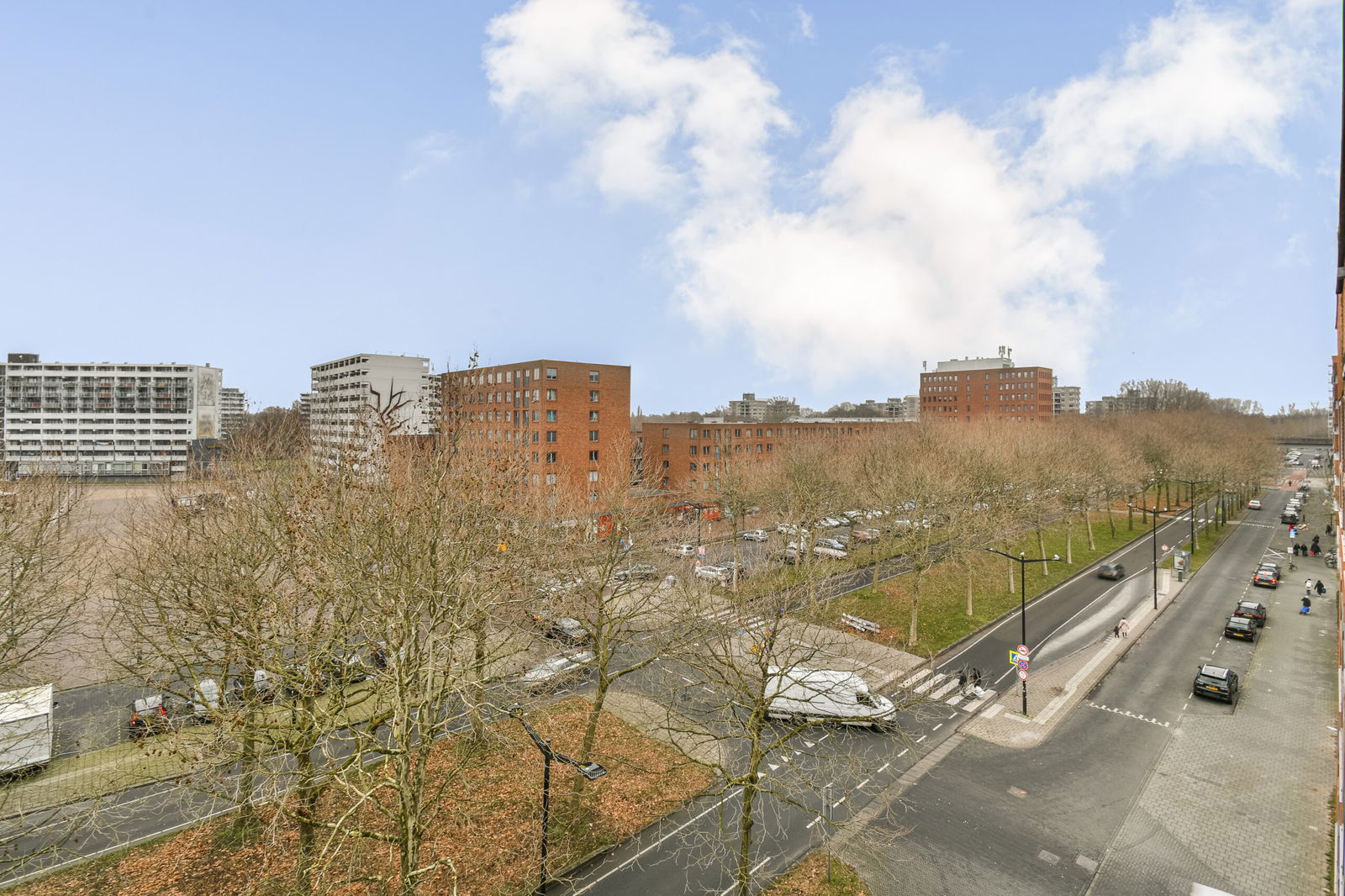 De afgesloten entree geeft toegang tot het algemene trappenhuis en de lift, die beide leiden naar de vijfde verdieping. Bij de voordeur bevindt zich een fijn terras waar je rustig buiten kunt zitten.