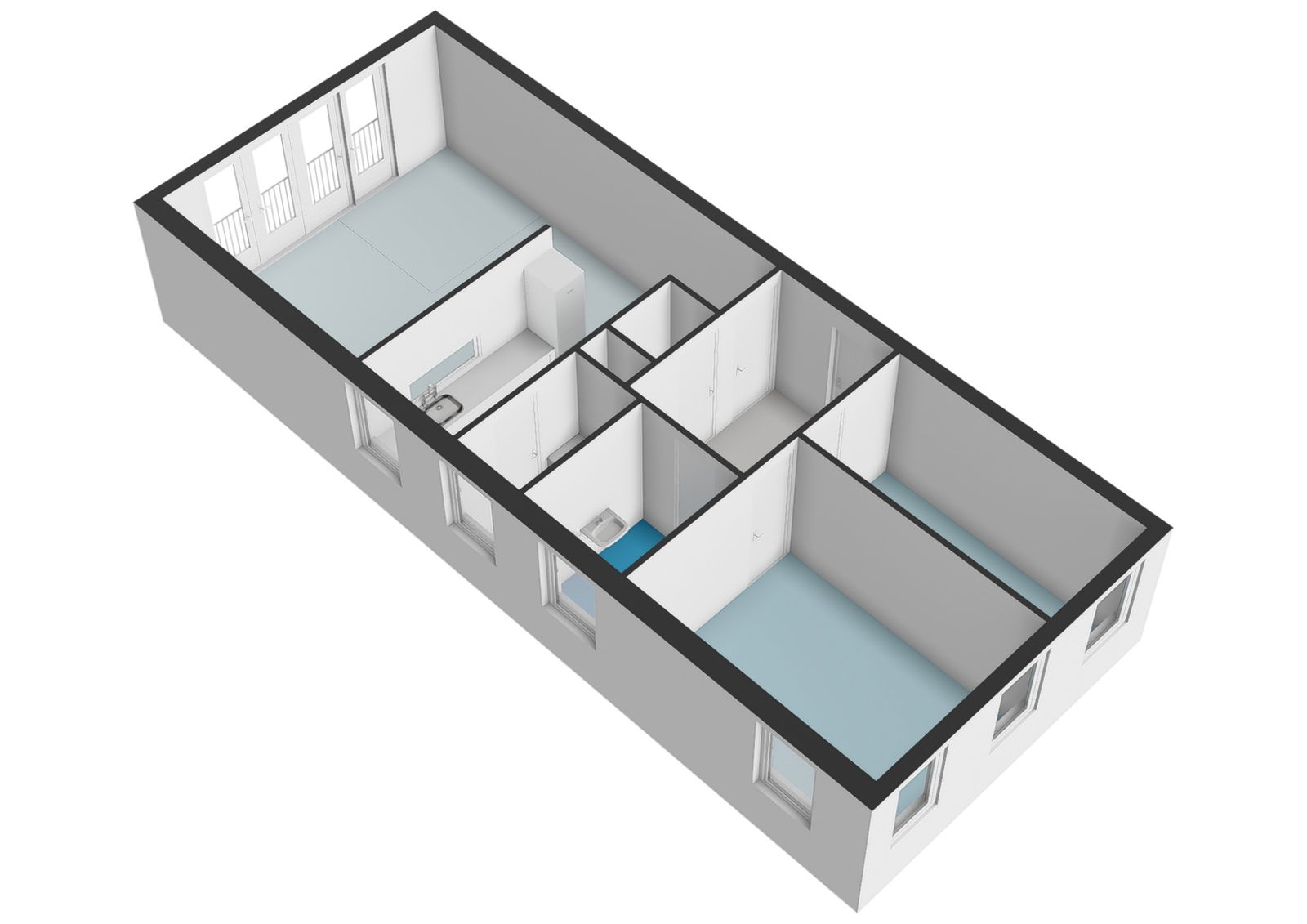 Appartement: entree voorzien van videofooninstallatie; eerste slaapkamer gelegen op het oosten; daarnaast de tweede slaapkamer, gesitueerd op het noordoosten; badkamer met douche en wastafel; separaat toilet met fontein; toegang tot de woonkamer gelegen op het zuidwesten met halfopen keuken voorzien van een keukenblok; ruime interne berging met wasmachineaansluiting.