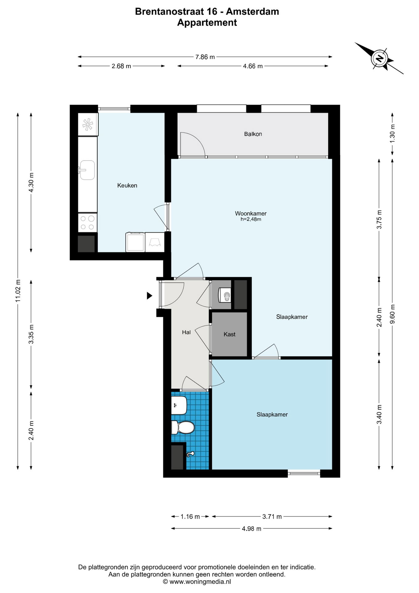 Via het gemeenschappelijk trappenhuis kom je op de tweede verdieping waar dit appartement gelegen is. Het appartement heeft een entreehal met toegang tot alle vertrekken. Aan je linkerhand bevindt zich de woonkamer, met deur naar het balkon, gelegen op het oosten. Rechts zijn de slaapkamer en de badkamer die voorzien is van een wastafel, douche en toilet. De dichte keuken bereikt je vanuit de woonkamer en is voorzien van een recht keukenblok met enkele losse appartuur. Op de begane grond is een berging aanwezig.