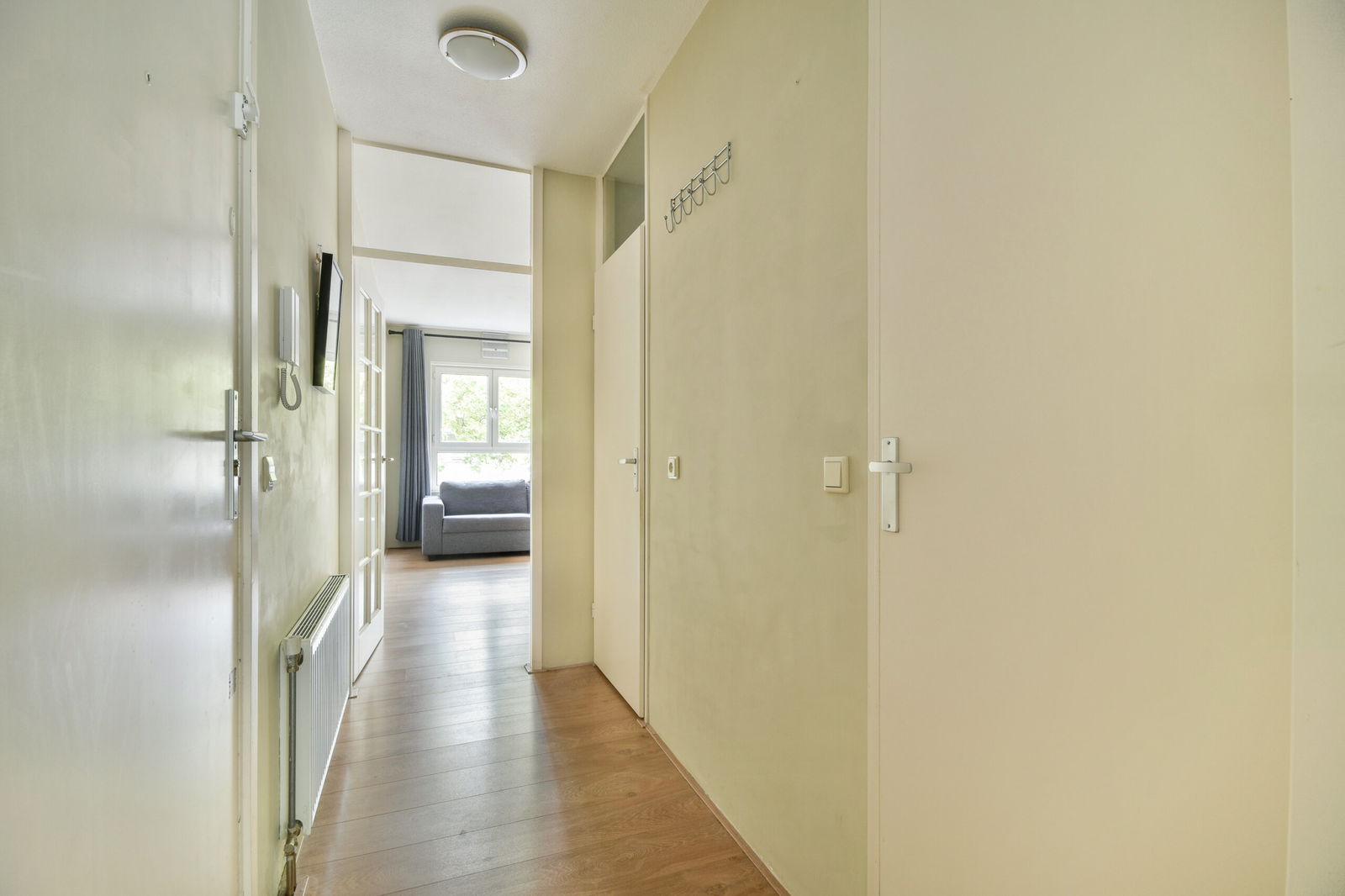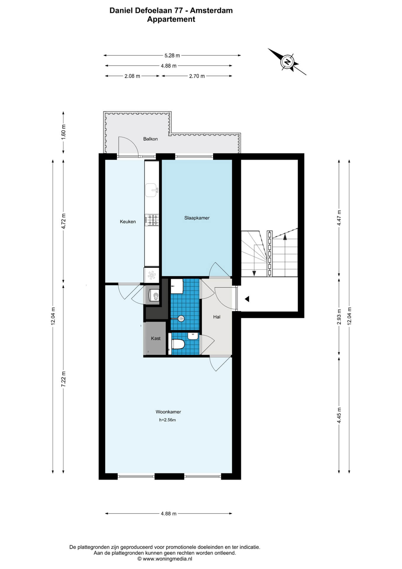 De entree van het appartement bevindt zich op de eerste verdieping. Vanuit de hal heeft u toegang tot bijna alle vertrekken. Aan de voorzijde, gelegen aan een rustige straat, bevindt zich de lichte woonkamer met voldoende ruimte voor een eethoek. Aansluitend ligt de keuken en de interne berging met wasmachineaansluiting, welke toegang biedt tot het balkon op het noordoosten. Aan de achterzijde van de woning ligt de ruime slaapkamer met uitzicht op de groene binnentuin. Centraal in de woning bevinden zich een apart toilet en de badkamer.