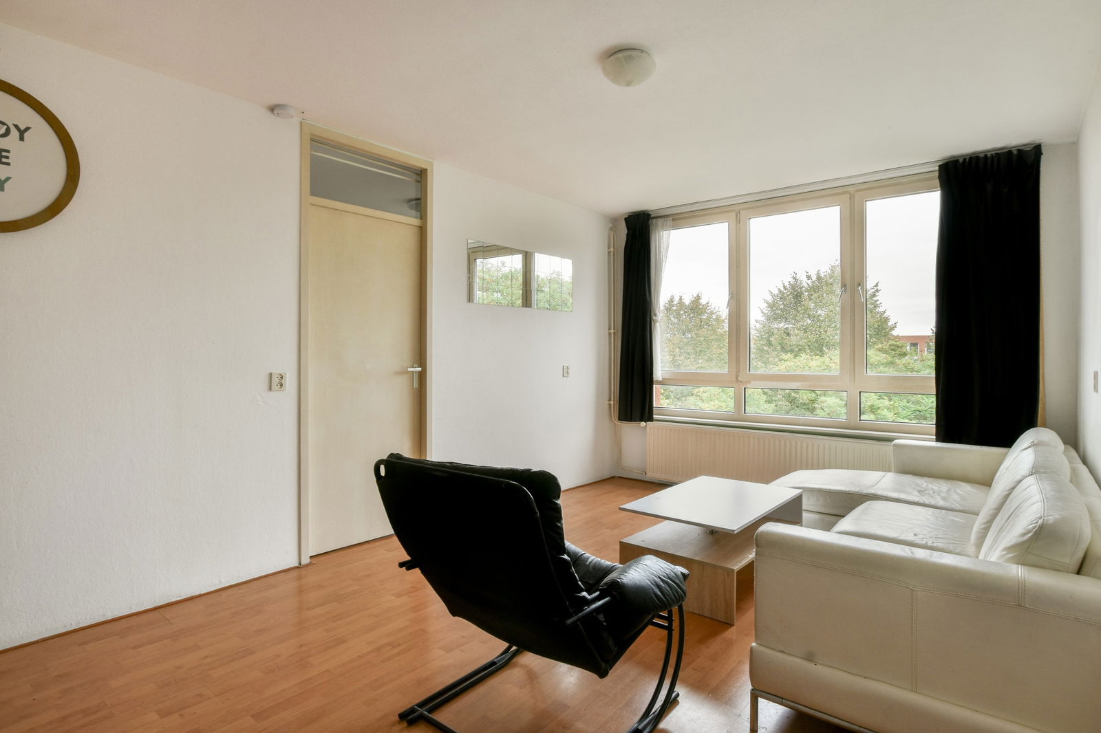 At the front is a spacious and bright bedroom. The living room at the rear features large windows, allowing plenty of natural light, and offers an open view over the green courtyard. Adjacent to the living area is the kitchen with access to a French balcony. The bathroom includes a shower, washbasin cabinet, and toilet.