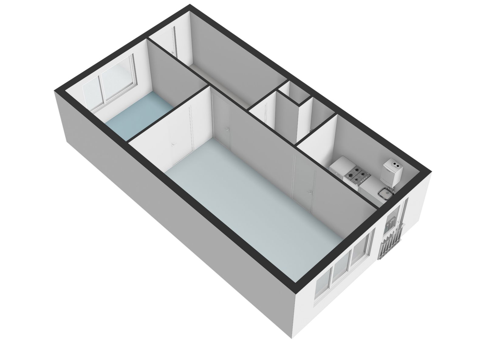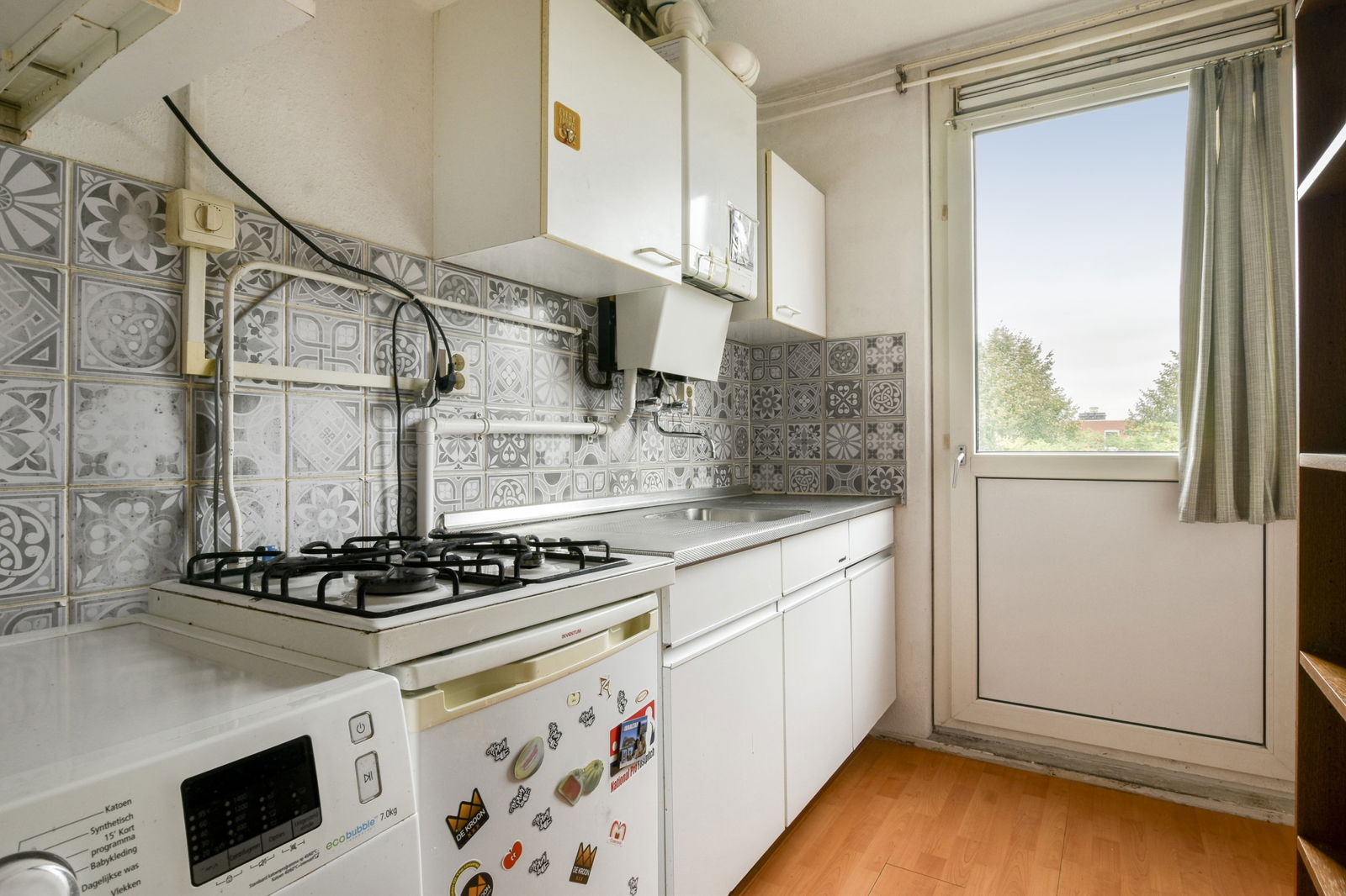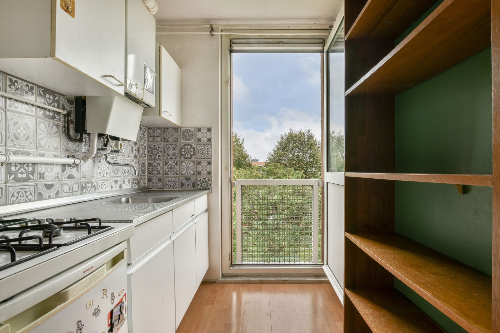Aan de voorzijde bevindt zich een ruime, lichte slaapkamer. De woonkamer aan de achterzijde heeft grote raampartijen en veel natuurlijke lichtinval, met een vrij uitzicht over de groene binnentuin. Aangrenzend ligt de keuken en toegang tot een Frans balkon. De badkamer is voorzien van een douche, wastafelmeubel en toilet.