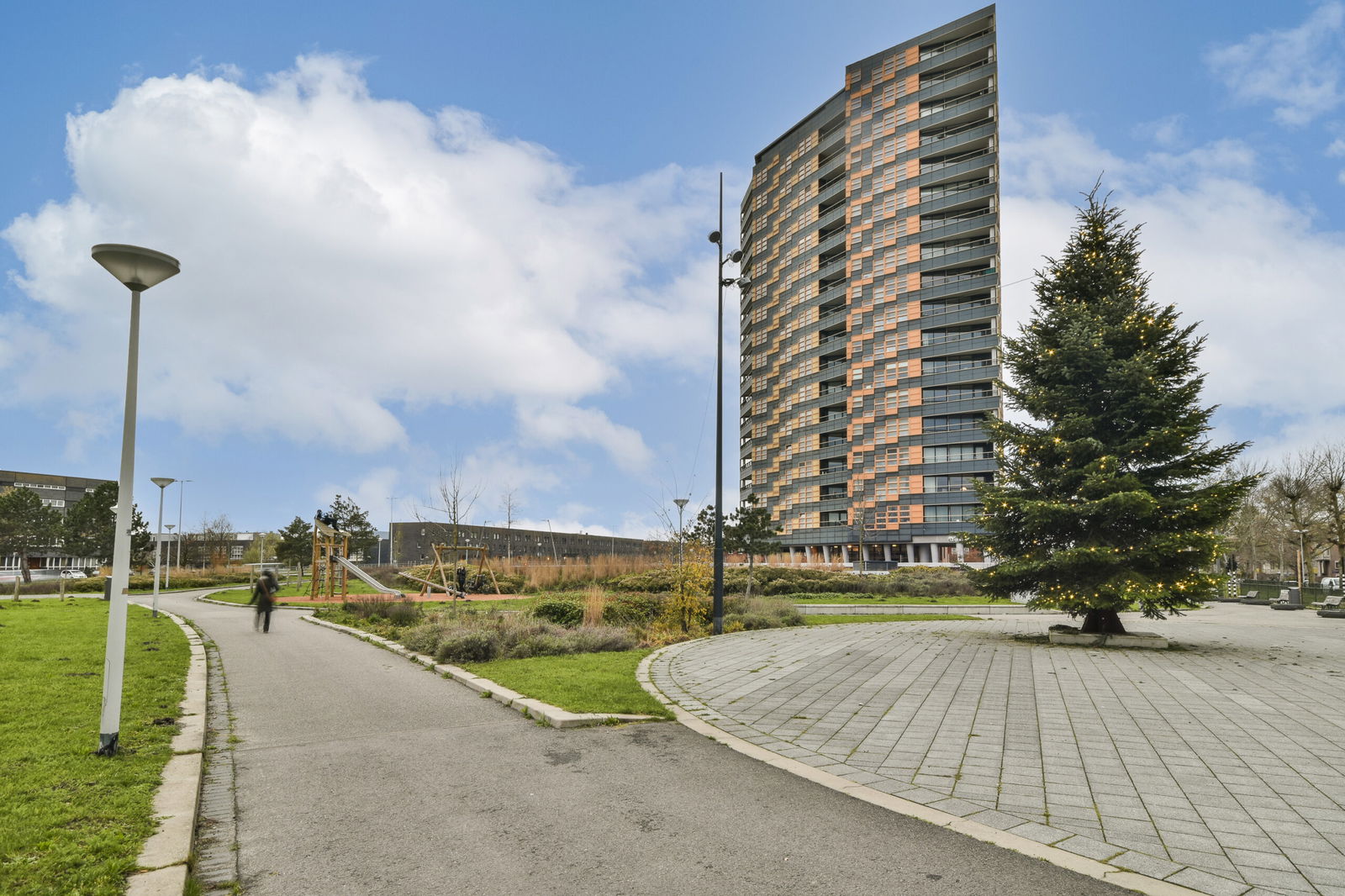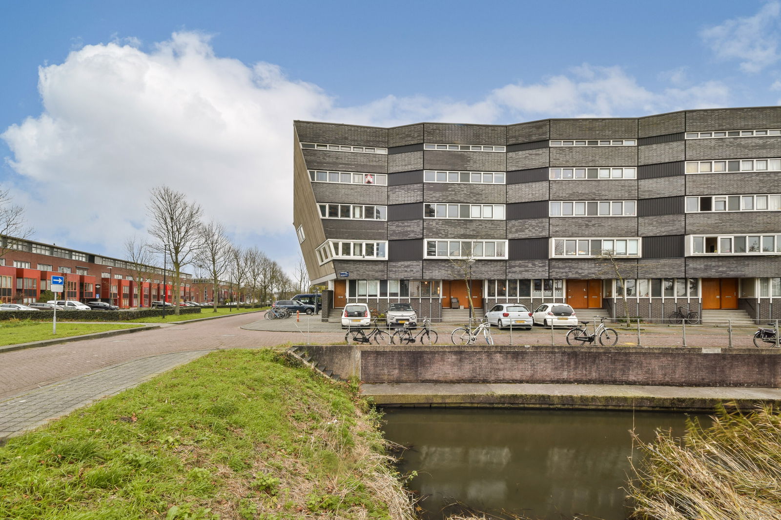 Bij het appartement hoort een ruime, gezamenlijke tuin waar je heerlijk kunt genieten van de zon. Aan de voorzijde kijk je uit over een open plein, wat een vrij gevoel en een rustige sfeer creëert.