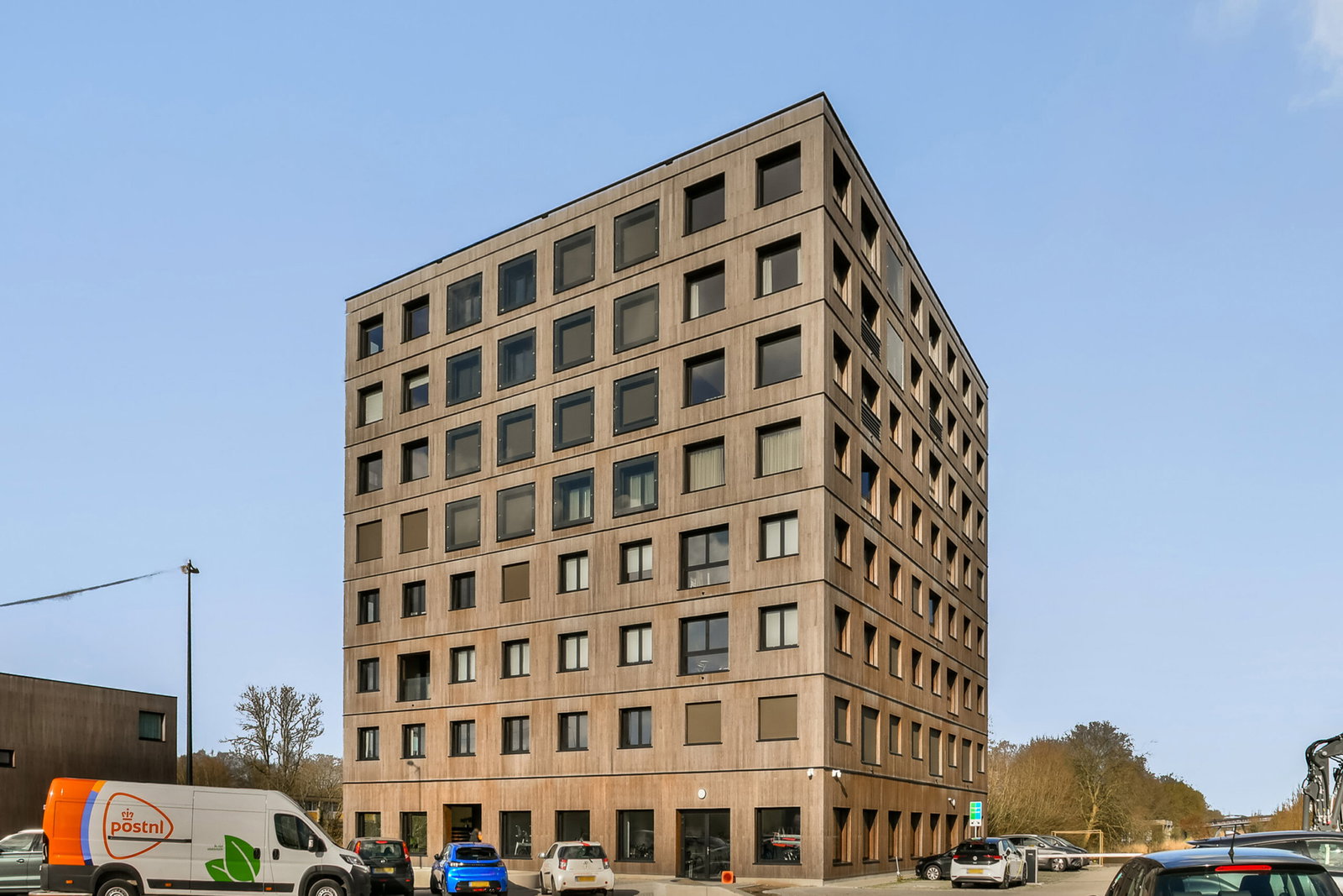 The new-build project Switi started in March 2023 and has now been successfully completed. The project is located along a green slope east of Gooiseweg, next to Nelson Mandelapark. Switi consists of family homes and 45 apartments, each with a separate storage unit on the same floor. In addition, a compact park has been created within the development, enhancing the green and peaceful living environment. The apartment building stands out for its unique and sustainable appearance, featuring a façade made of wood and bamboo—carefully chosen natural and eco-friendly materials.