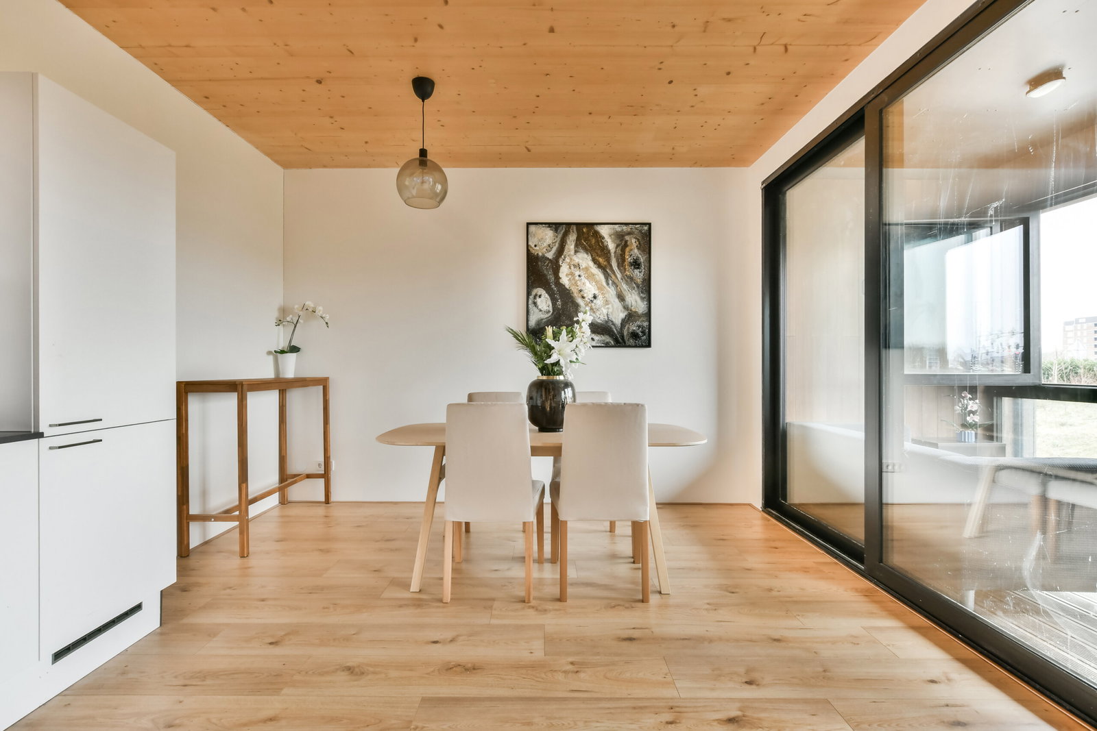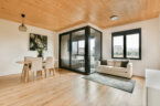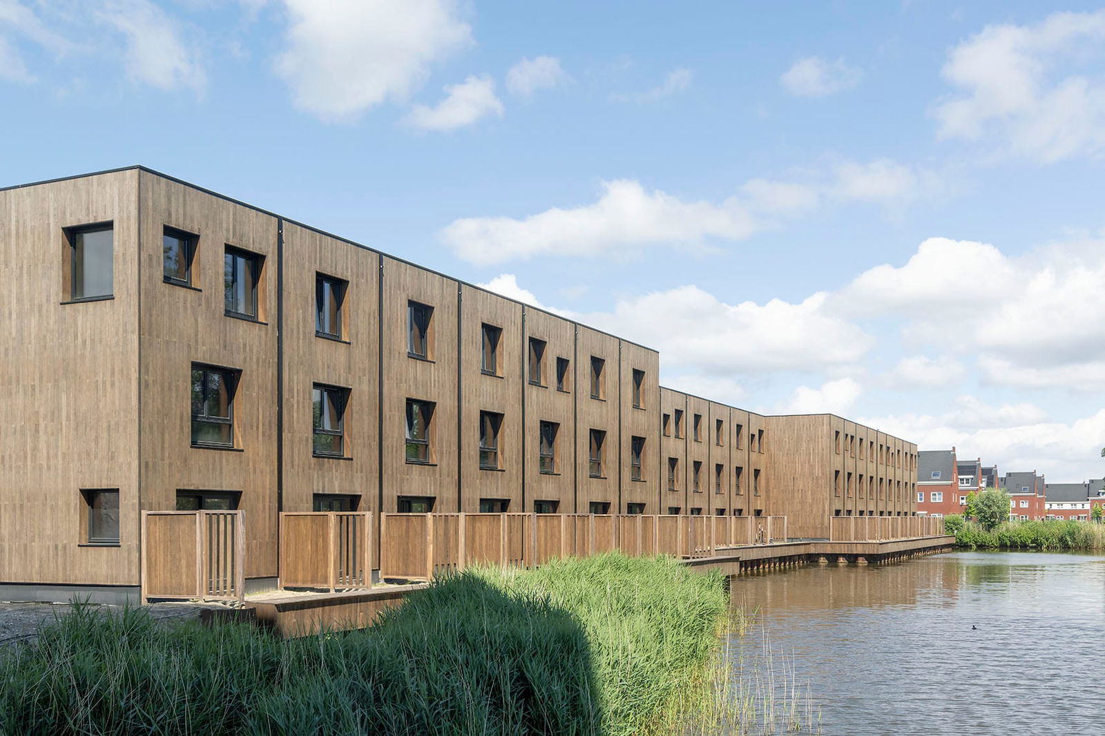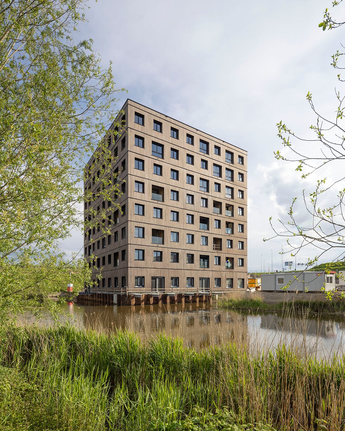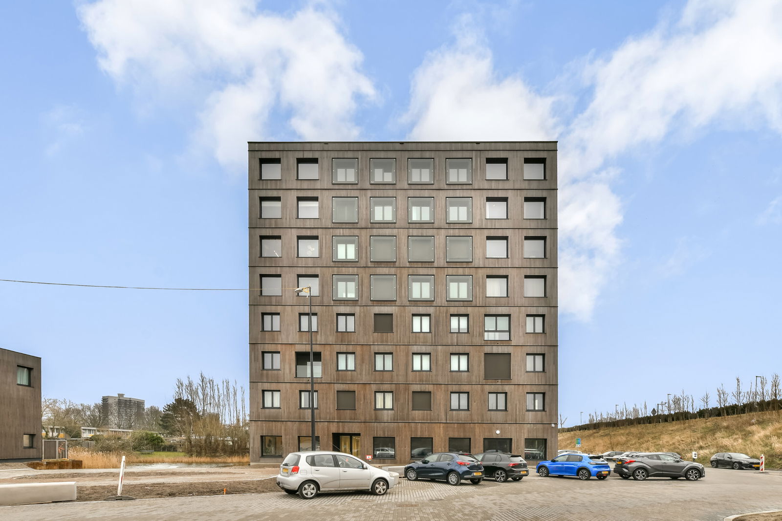 Within the development, a compact park has also been created, further enhancing the green surroundings. The apartment building has a unique and sustainable appearance thanks to its façade made of wood and bamboo, reflecting a conscious choice for natural and environmentally friendly materials.