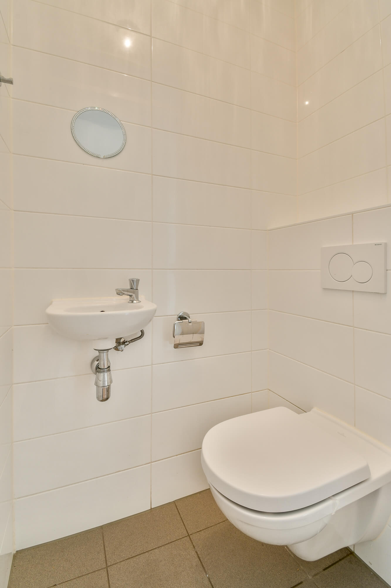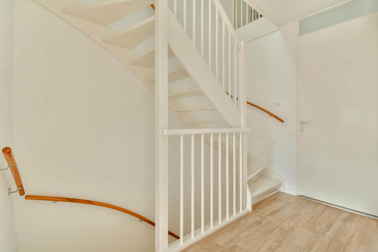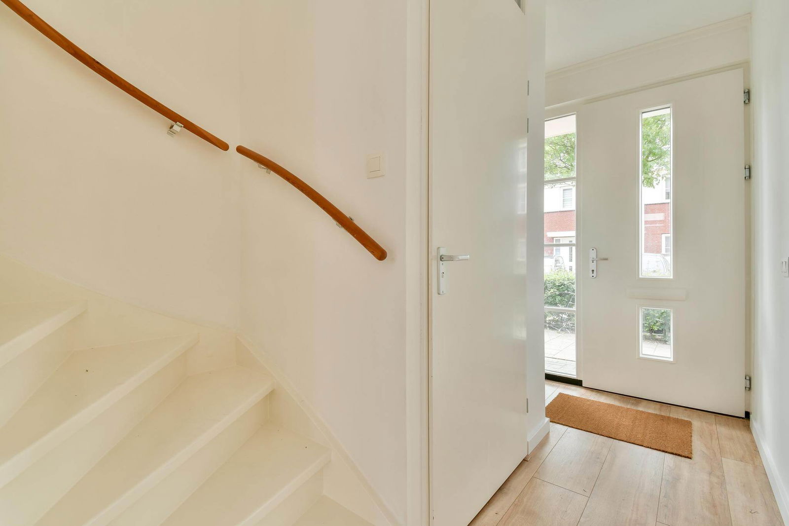 Entree via een ruime hal met meterkast, modern toilet met fonteintje, trapopgang naar de eerste verdieping en toegang tot de woonkamer.