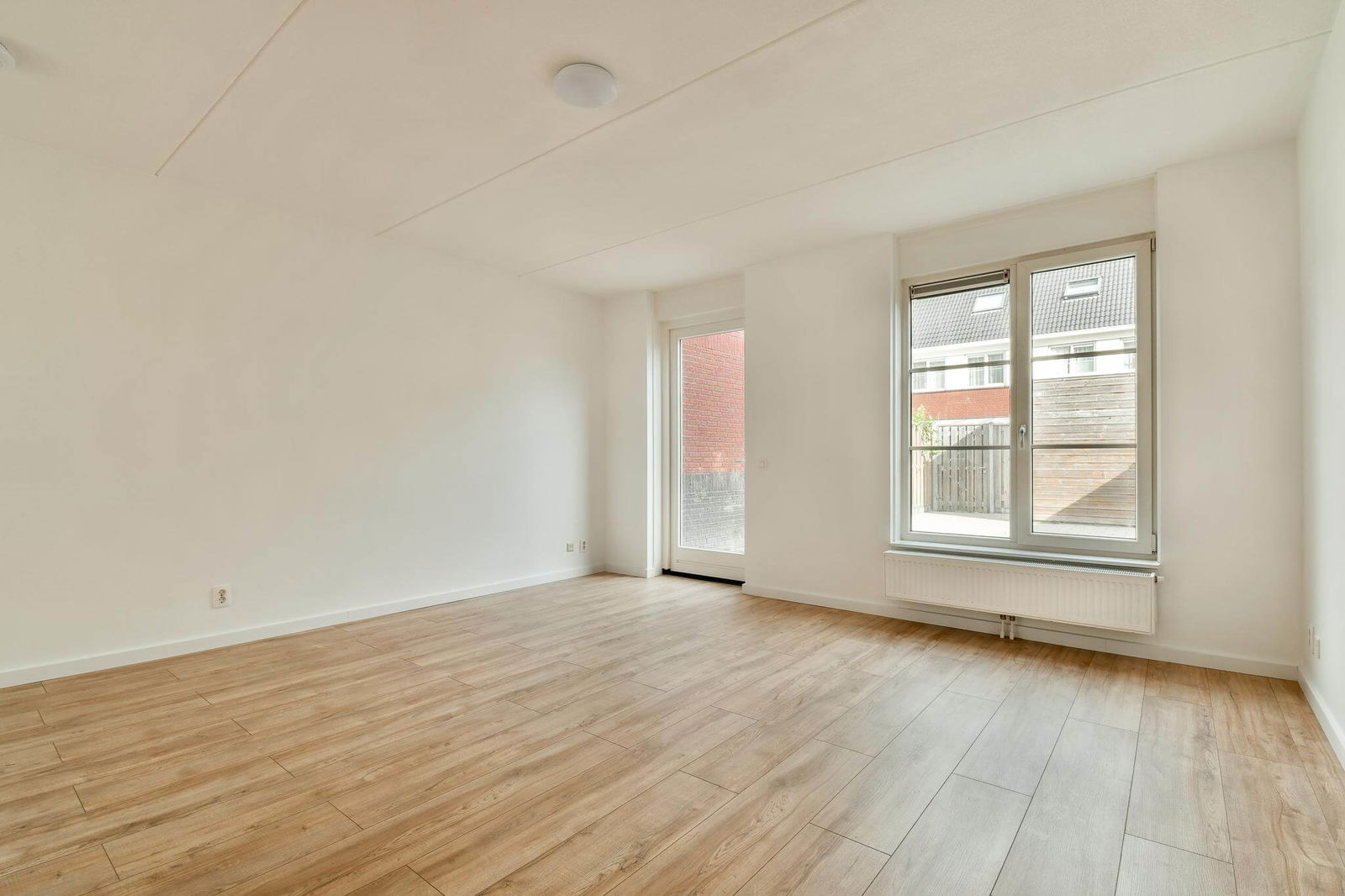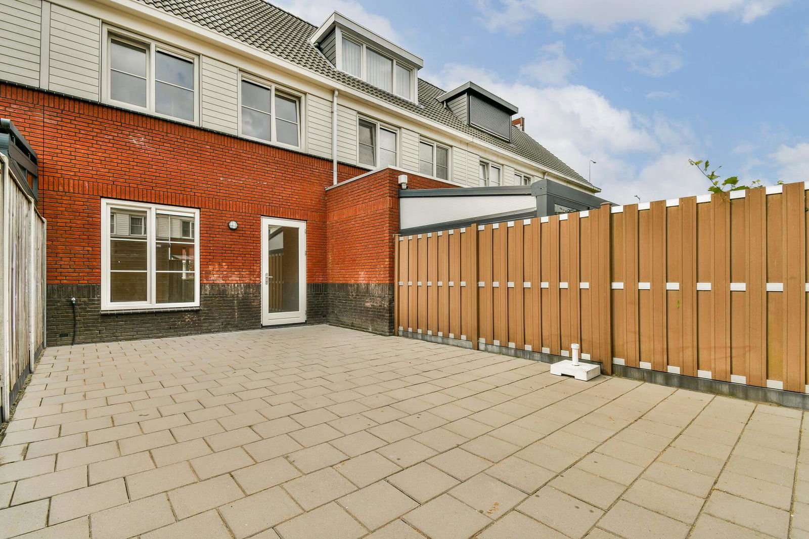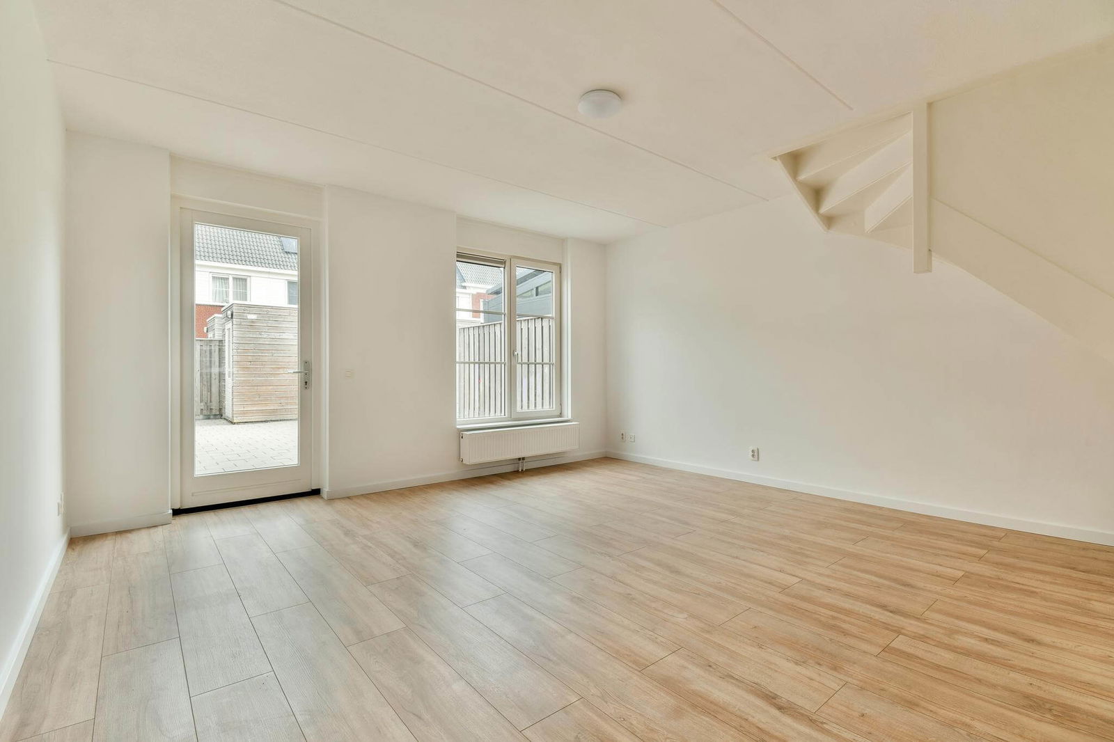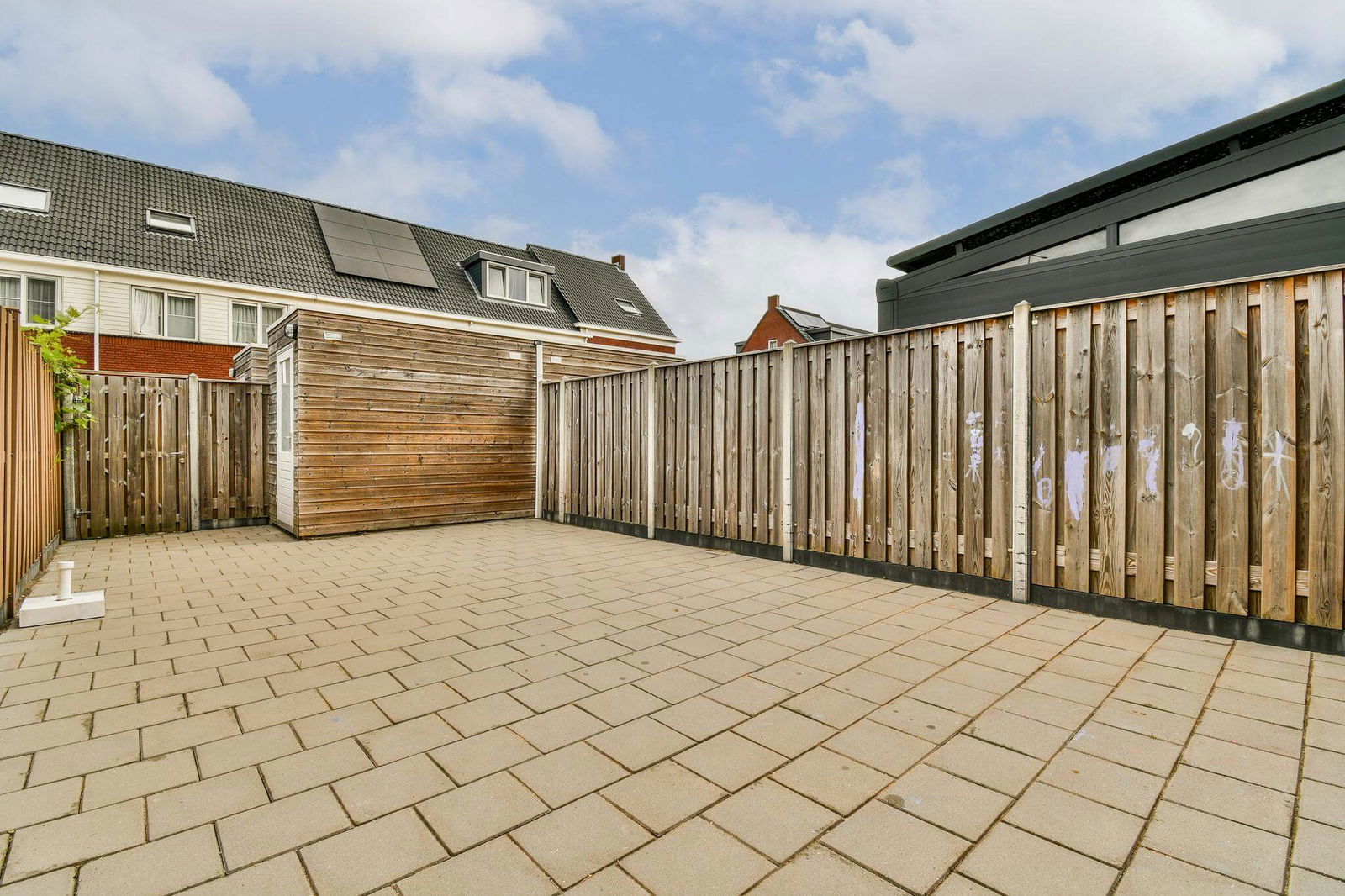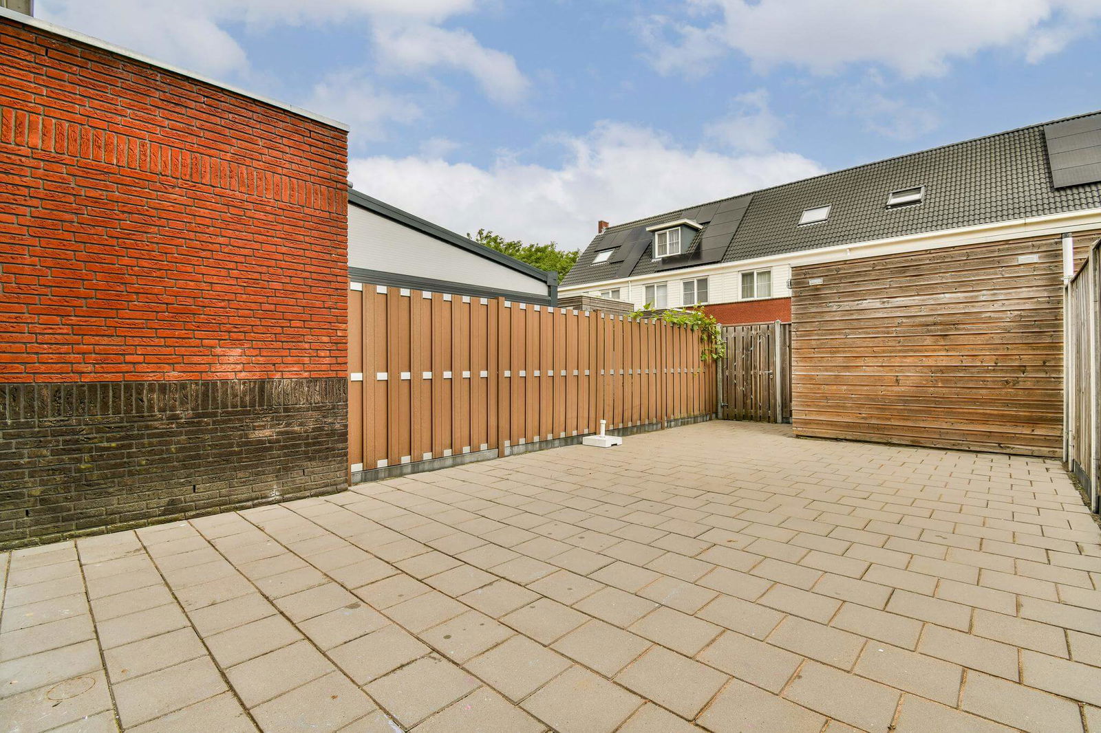 De lichte, tuingerichte woonkamer aan de achterzijde biedt toegang tot de verzorgde achtertuin van ca. 46 m², gelegen op het noordwesten. De tuin is netjes betegeld en voorzien van een houten berging, schuttingen en een achterom.