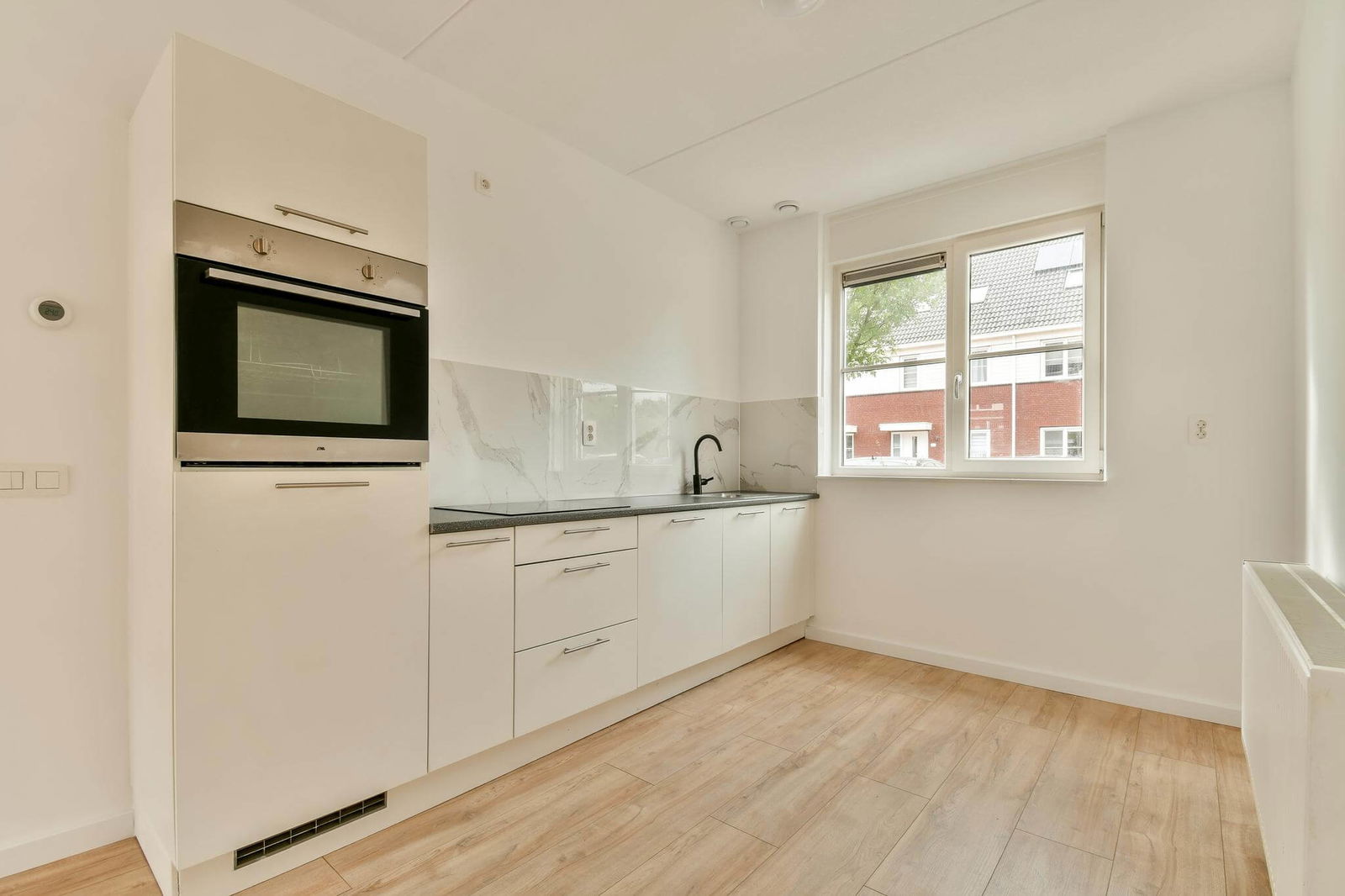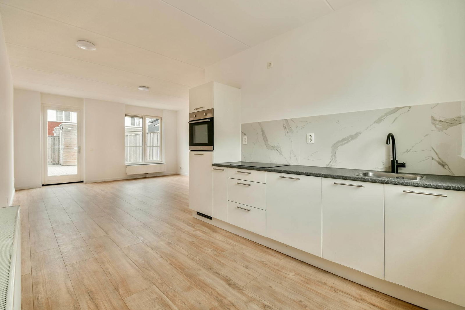 Aan de voorzijde bevindt zich de halfopen keuken, uitgerust met diverse inbouwapparatuur: een 4-pits inductiekookplaat, koel-/vriescombinatie, oven, vaatwasser en afzuigkap.