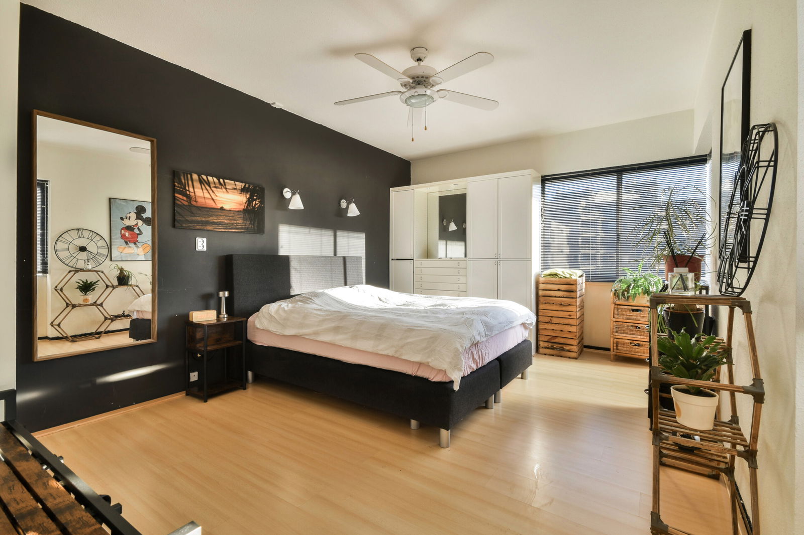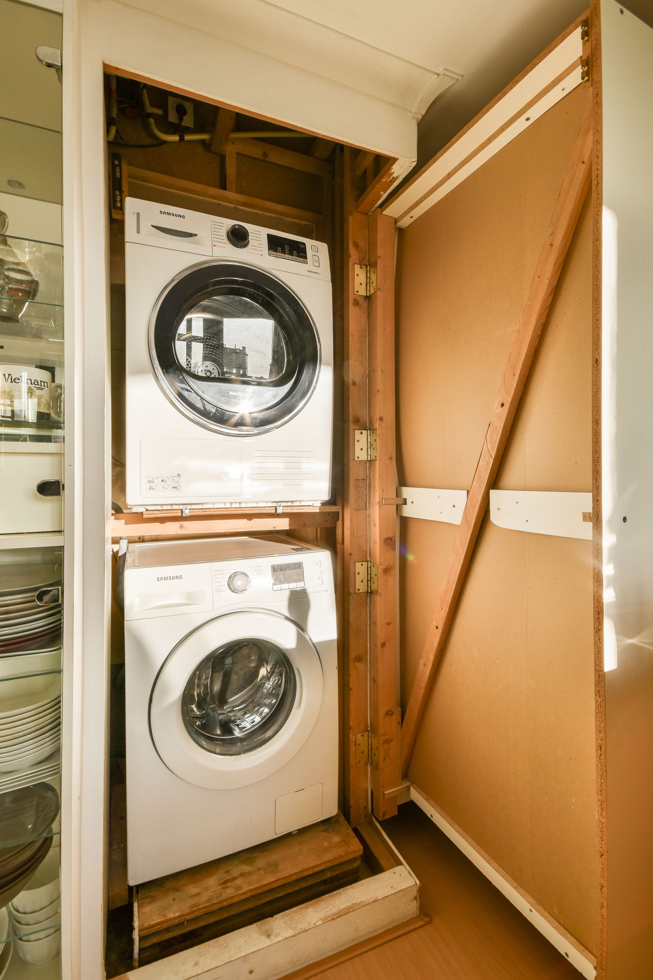 The living room also features a hidden closet for the washing machine and dryer, keeping them neatly out of sight. The apartment includes a spacious and bright bedroom. It is possible to place a wall in the bedroom to create an additional bedroom or workspace.