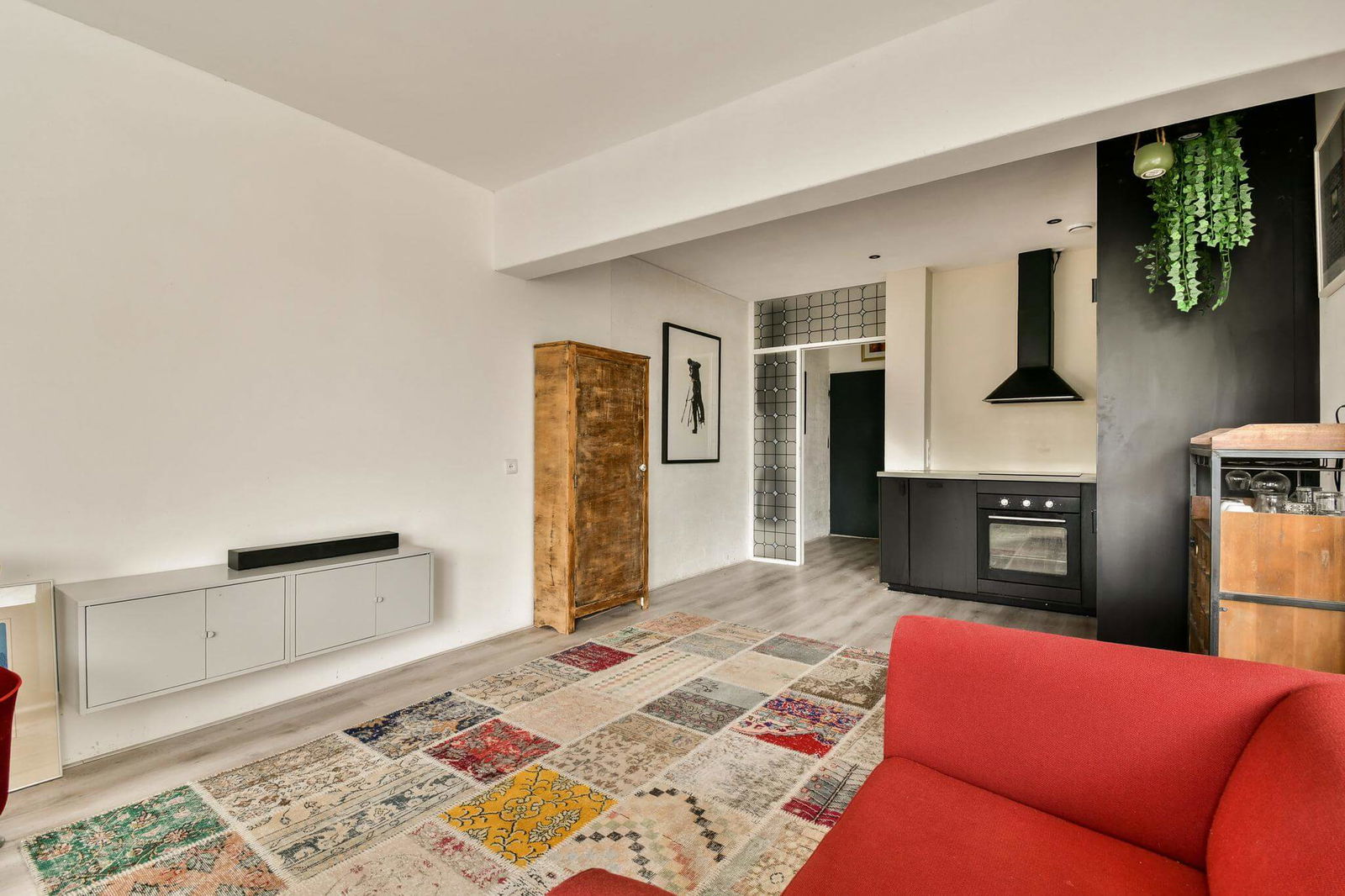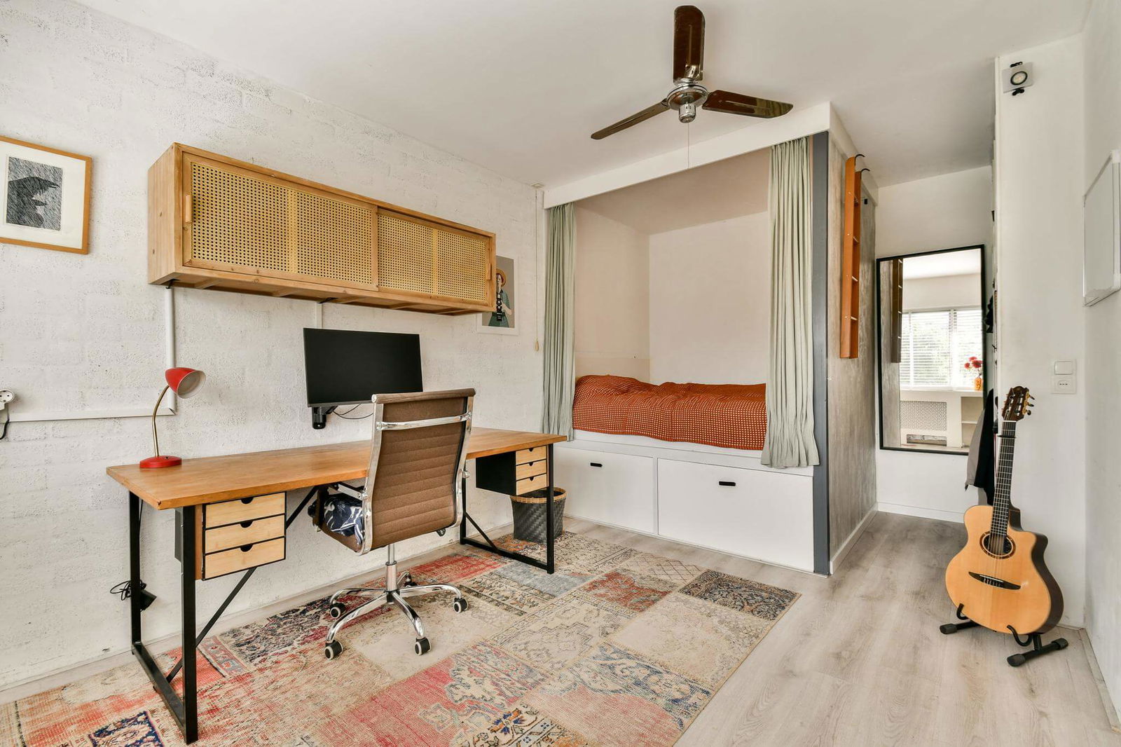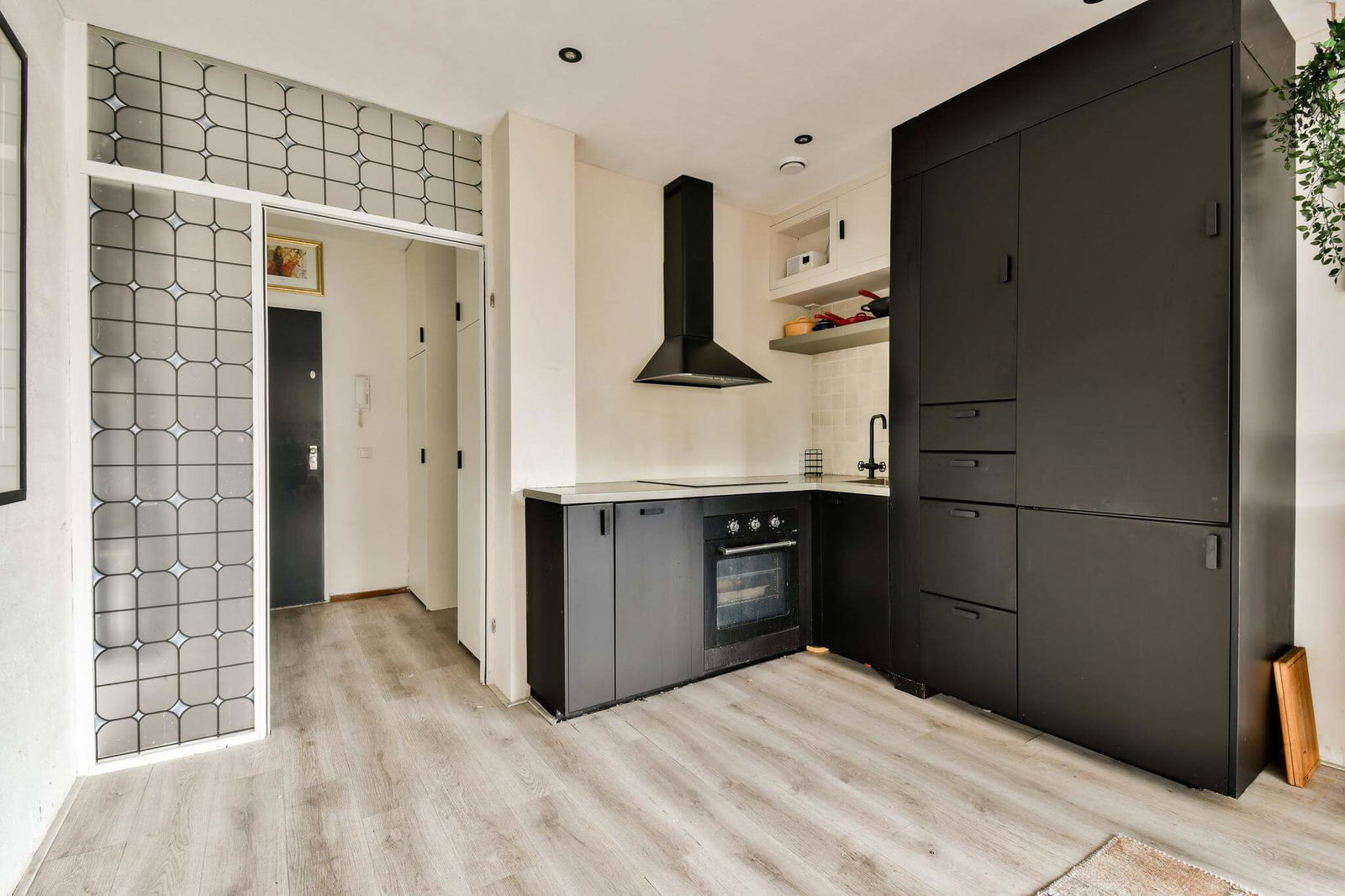 Upon entering the apartment through the hallway, you’ll find the meter cupboard. The bathroom is equipped with a shower, sink, toilet, and washing machine connection. The open kitchen offers ample cabinet space and built-in appliances, including a fridge-freezer, dishwasher, oven, and induction cooktop. The spacious living room provides access to the balcony through sliding doors. The bright and roomy bedroom comfortably accommodates a double bed, wardrobe, and desk.