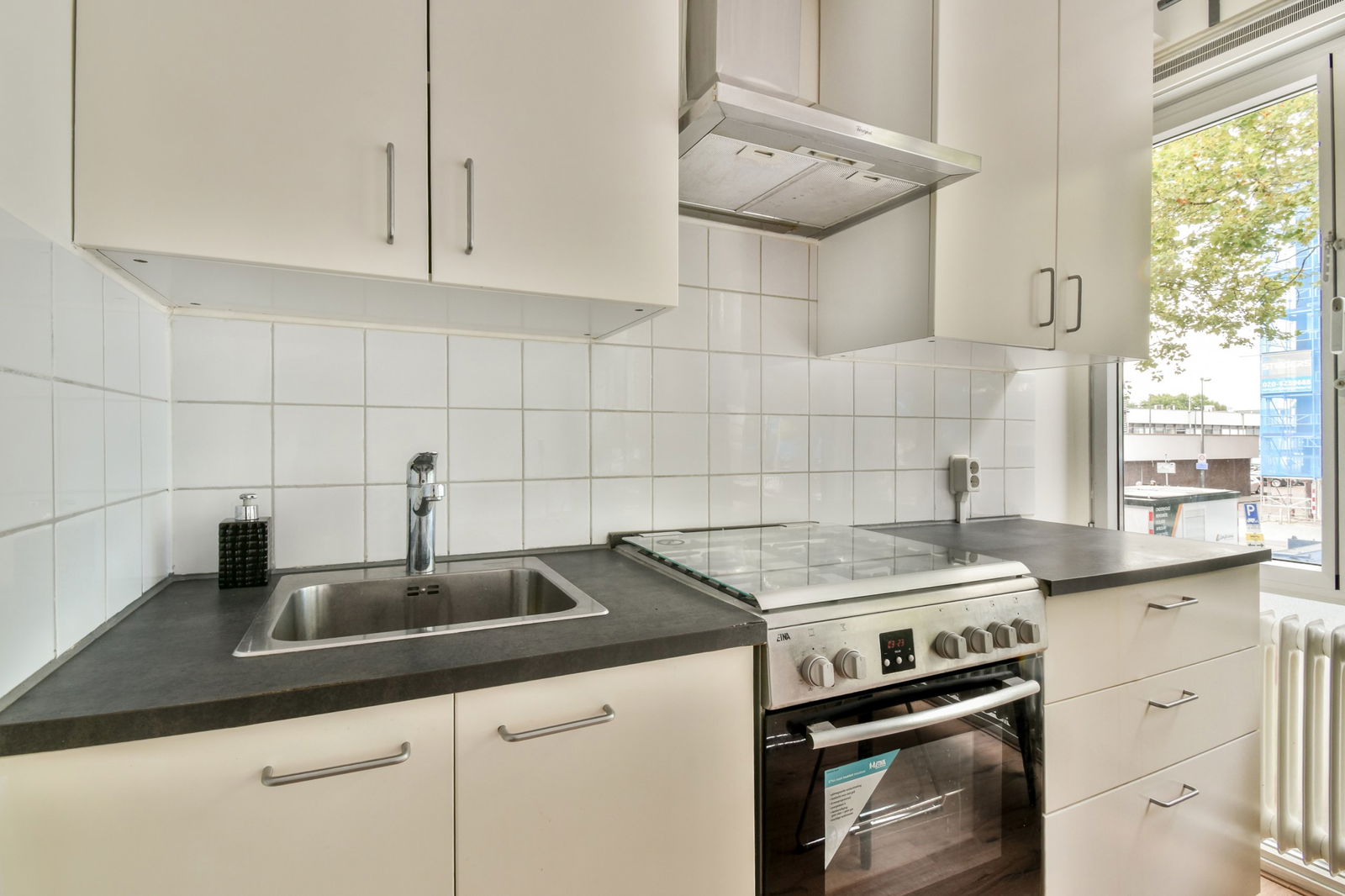 The bright living room with open kitchen forms the heart of the home and offers a view of the Boven ’t Y shopping center. Both the modern bathroom with walk-in shower and sink, and the separate toilet with wall-mounted toilet and sink, are accessible via a hallway from the studio.