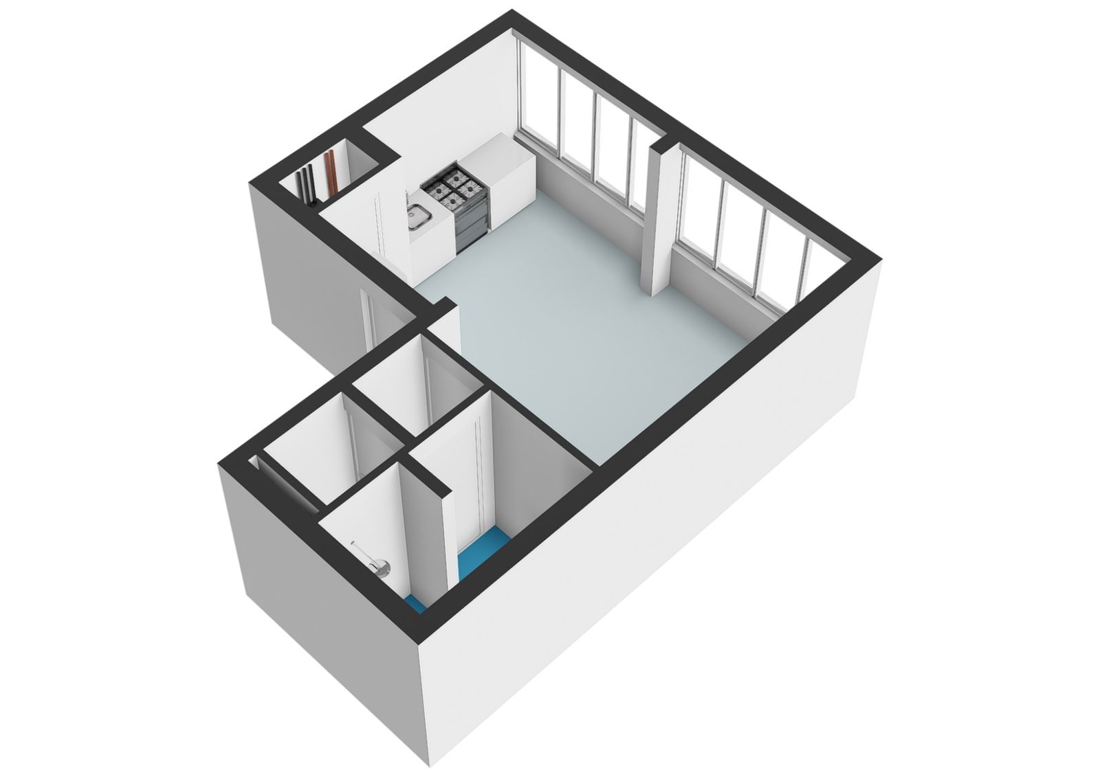 De lichte woonkamer met open keuken vormt het hart van de woning en biedt uitzicht op winkelcentrum Boven ’t Y. Zowel de moderne badkamer met inloopdouche en wastafel als het separate toilet met hangtoilet en wastafel bereik je via een hal vanuit de studio.