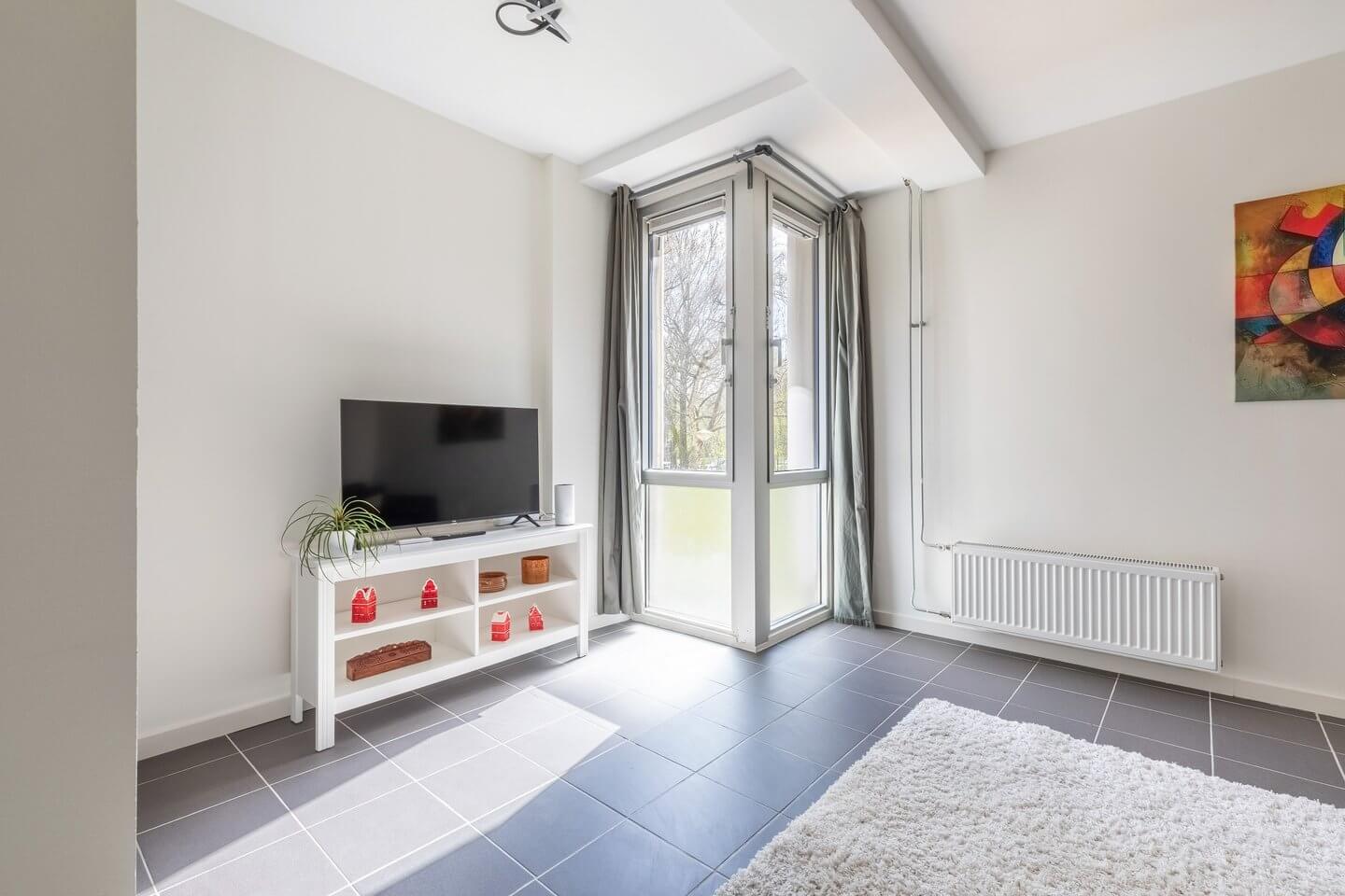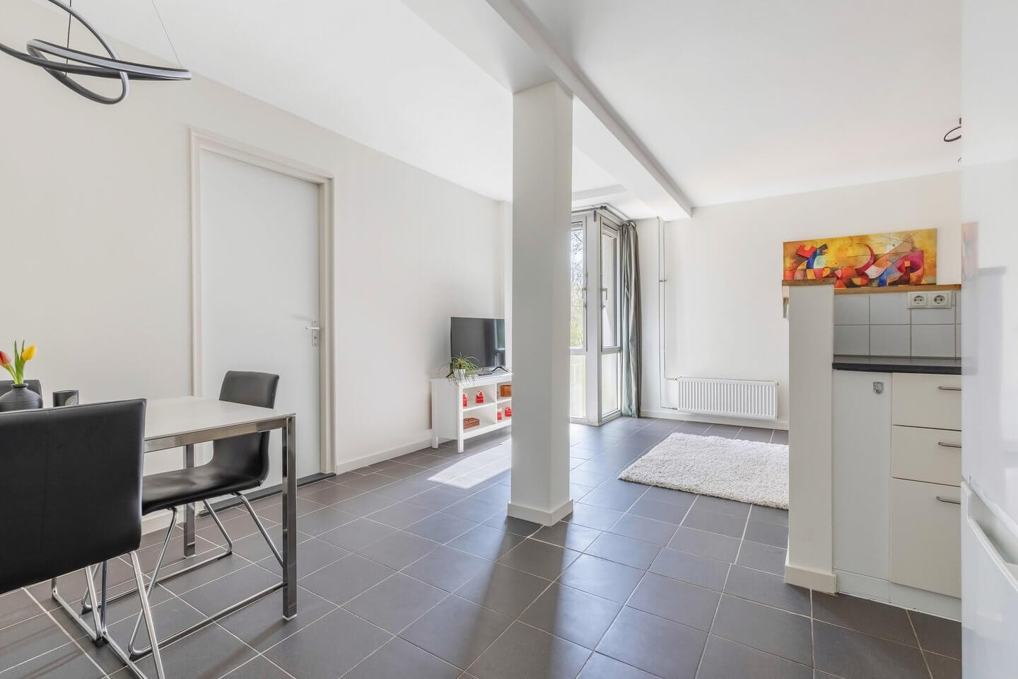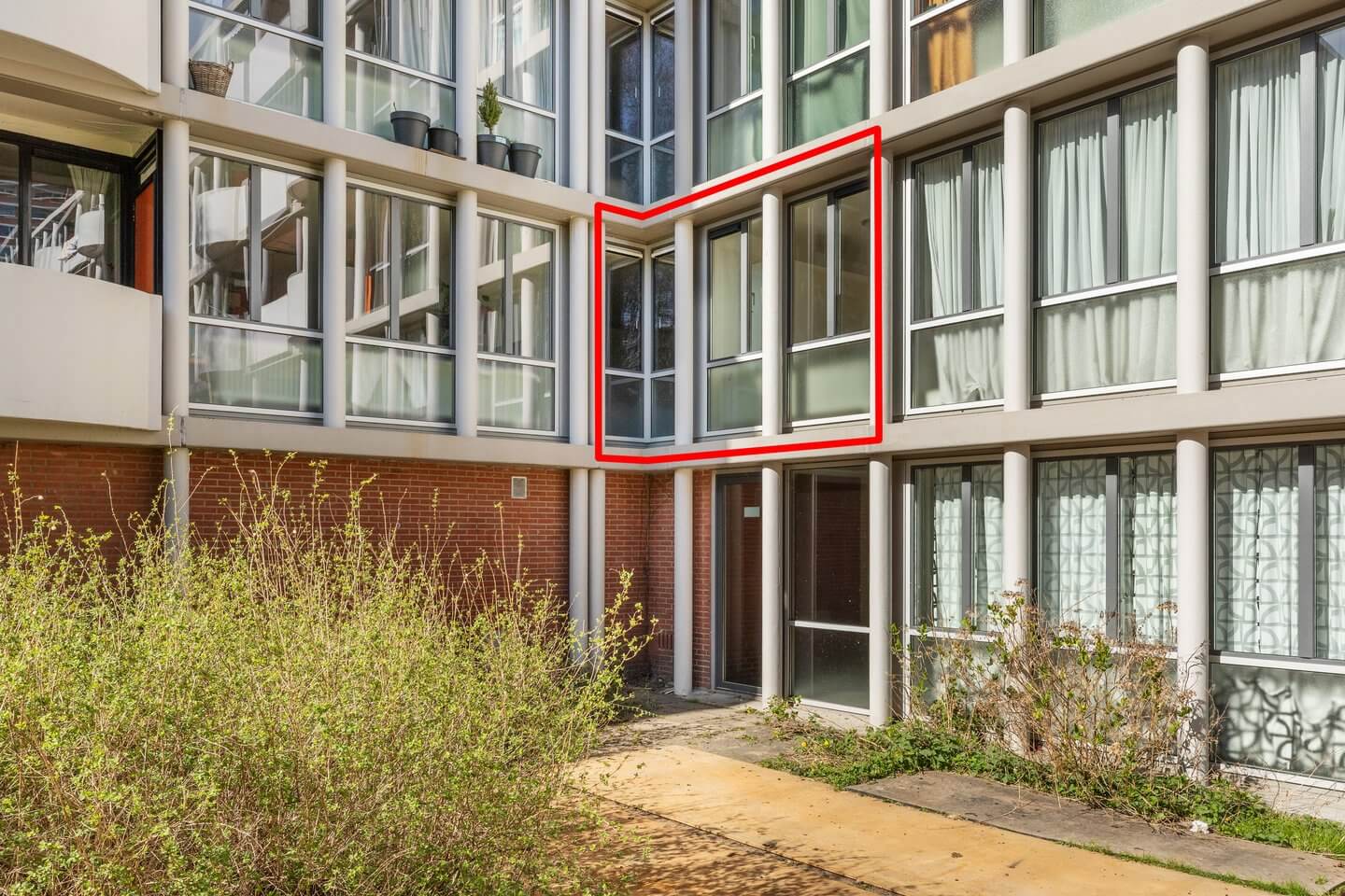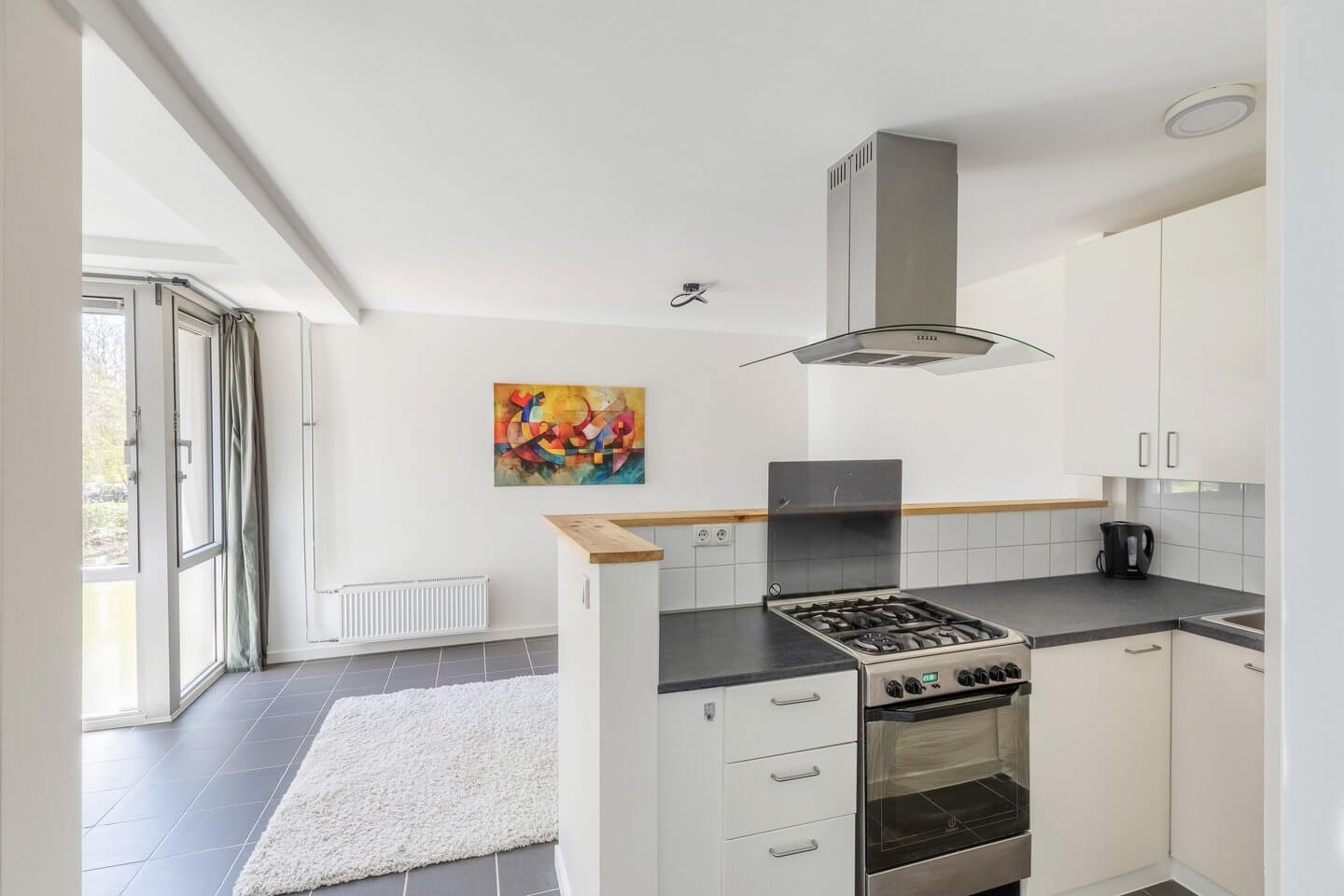 Het gebouw heeft een gezamenlijke entree met video-intercom. Op de eerste verdieping kom je binnen in de lichte woonkamer met open keuken en uitzicht op groen. De badkamer ligt naast de woonkamer, en de ruime slaapkamer beschikt over een brede glazen pui met openslaande ramen – ideaal op warme dagen.
