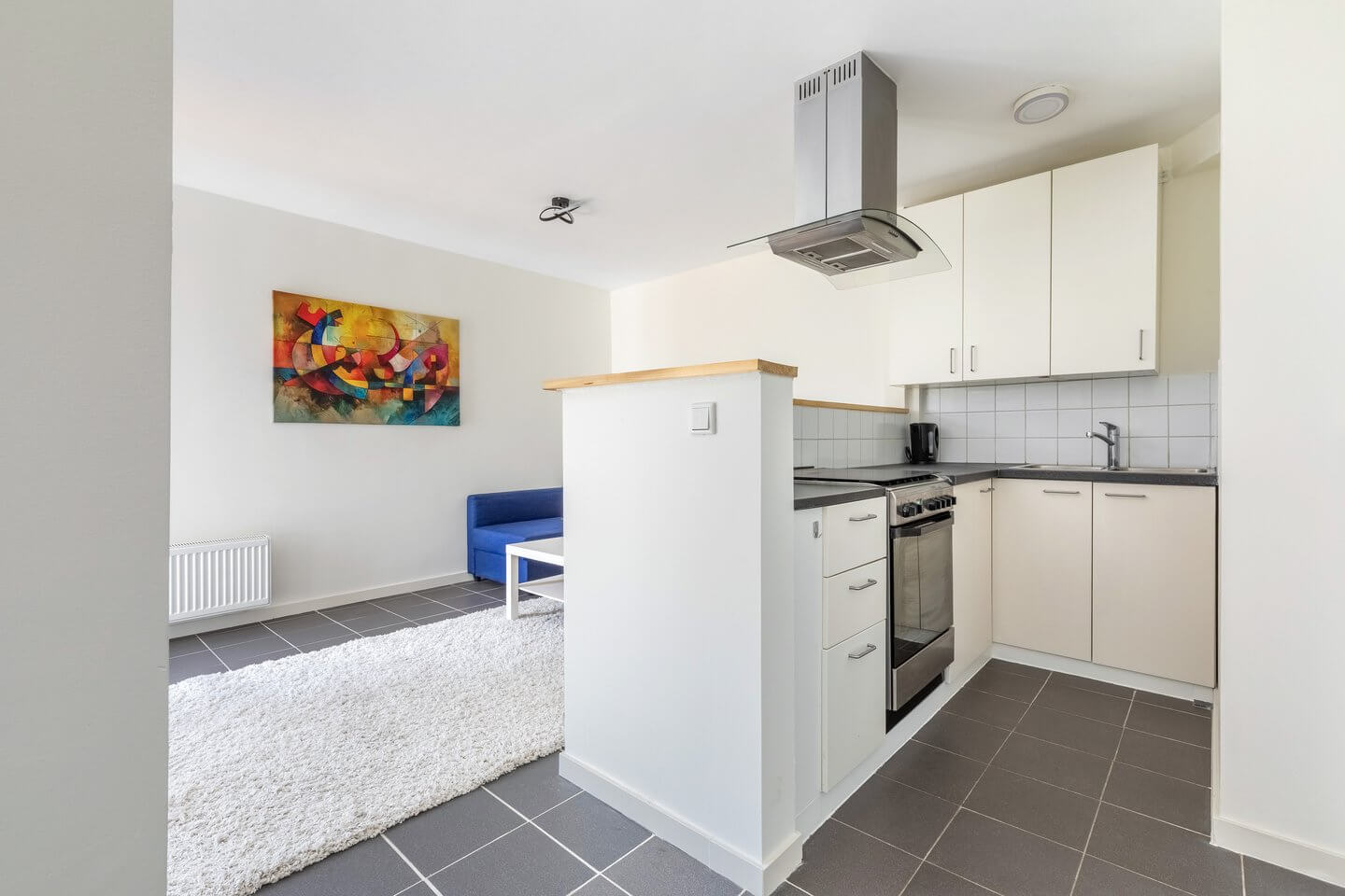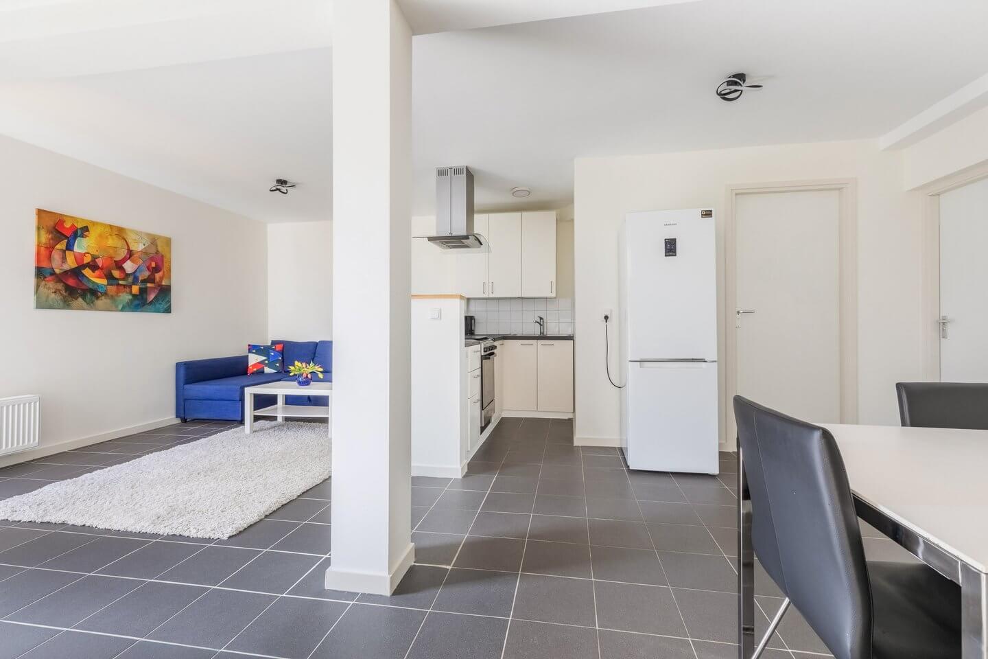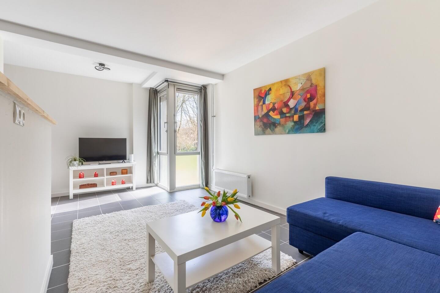 Het gebouw heeft een gezamenlijke entree met video-intercom. Op de eerste verdieping kom je binnen in de lichte woonkamer met open keuken en uitzicht op groen. De badkamer ligt naast de woonkamer, en de ruime slaapkamer beschikt over een brede glazen pui met openslaande ramen – ideaal op warme dagen.