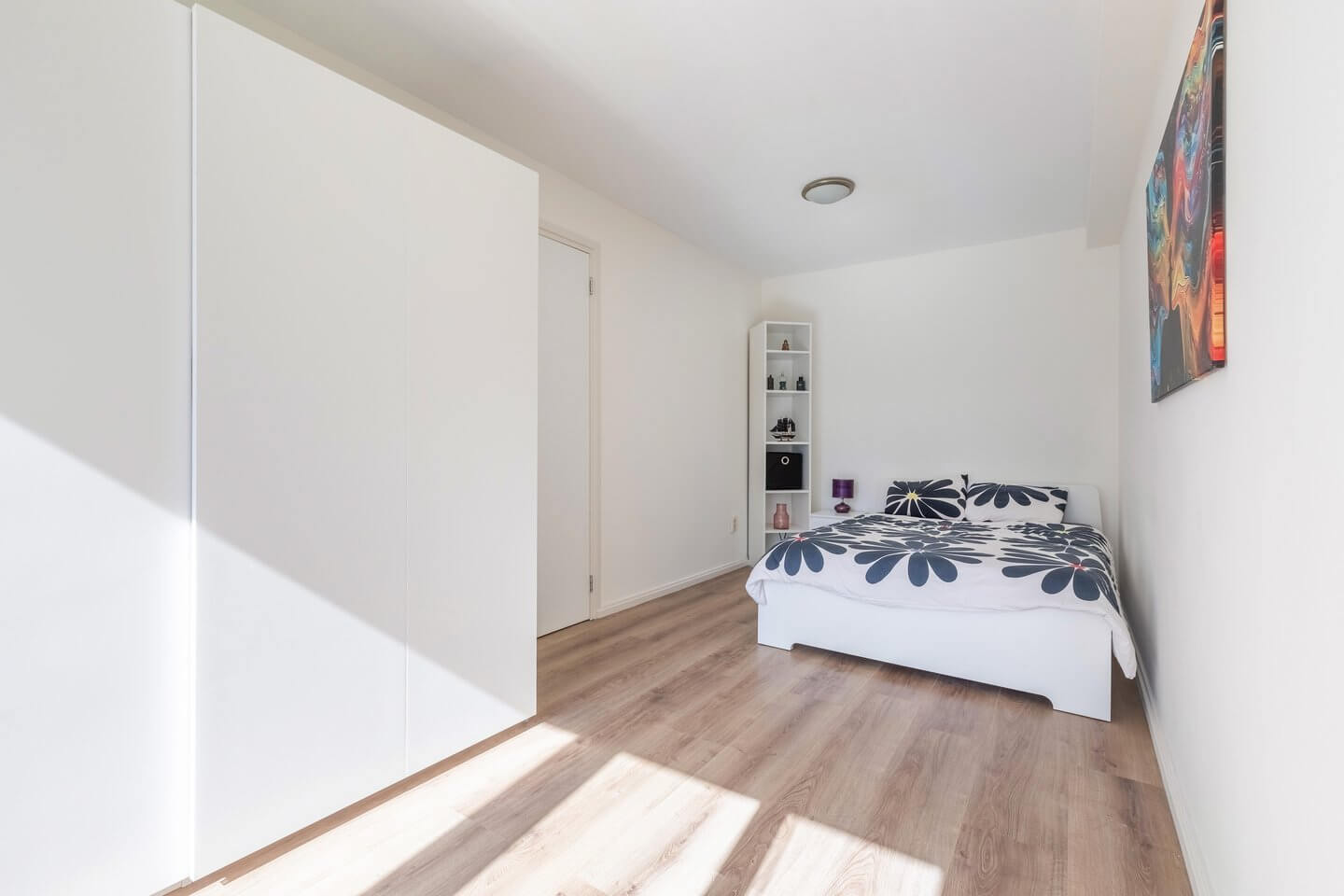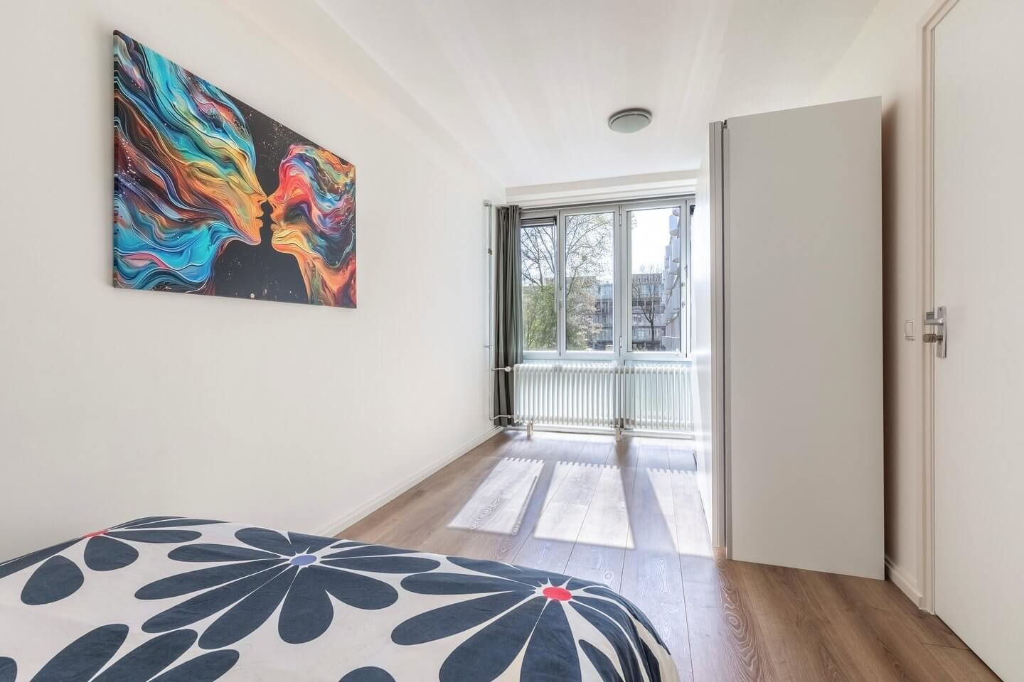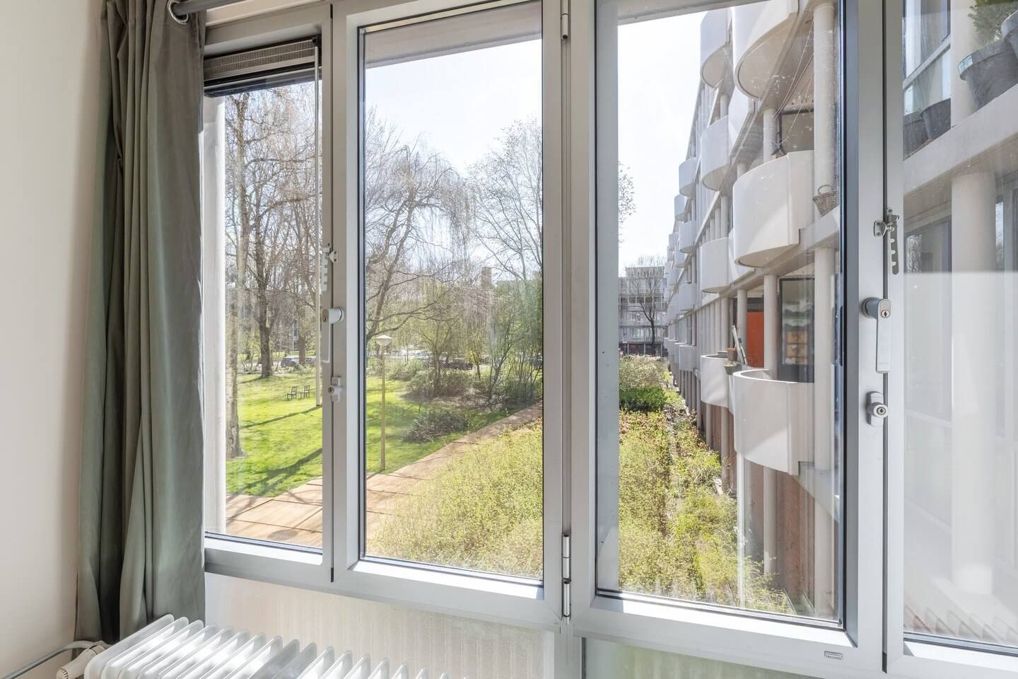 De woning is helemaal instapklaar en heeft een lichte woonkamer met een open keuken. Dankzij de grote ramen kijk je uit op het groene binnenterrein – zowel vanuit de woonkamer als de slaapkamer. De ramen kunnen kantelen of helemaal open, waardoor je binnen en buiten makkelijk laat samensmelten. De slaapkamer is ruim en voelt heerlijk rustig aan, mede door de bomen die voor verkoeling en een groene sfeer zorgen. Bonus: je wordt hier wakker met het gezang van vogels zoals merels en tjiftjaffen.