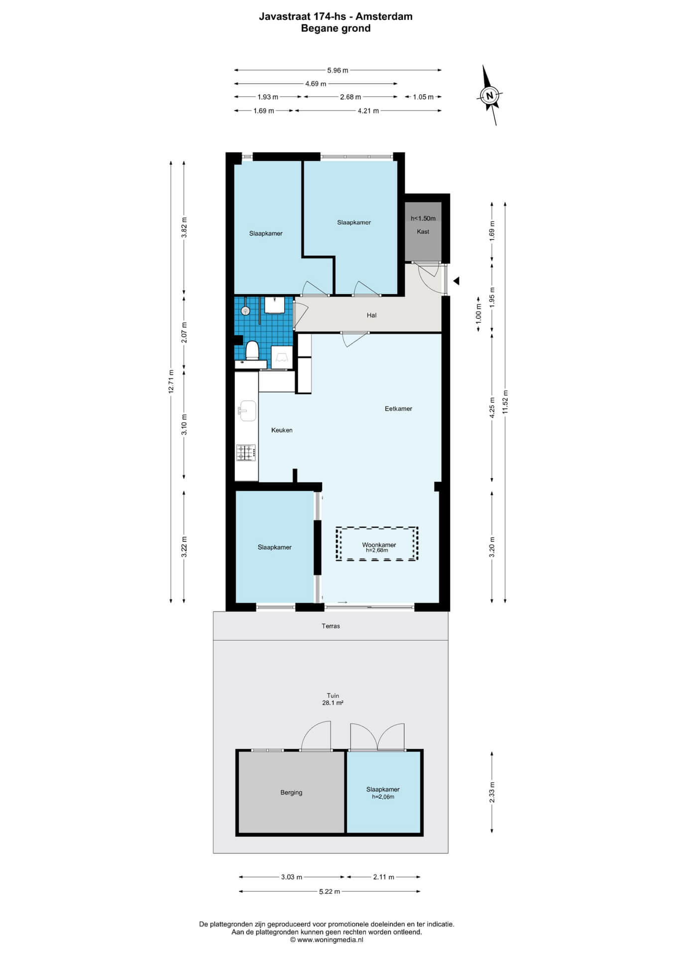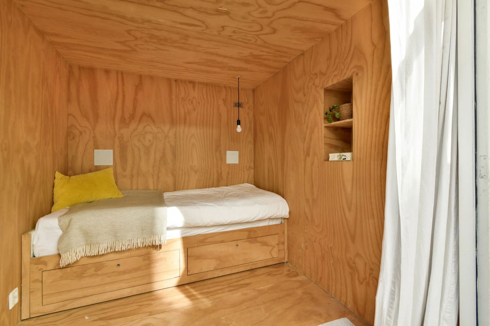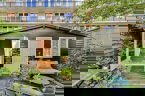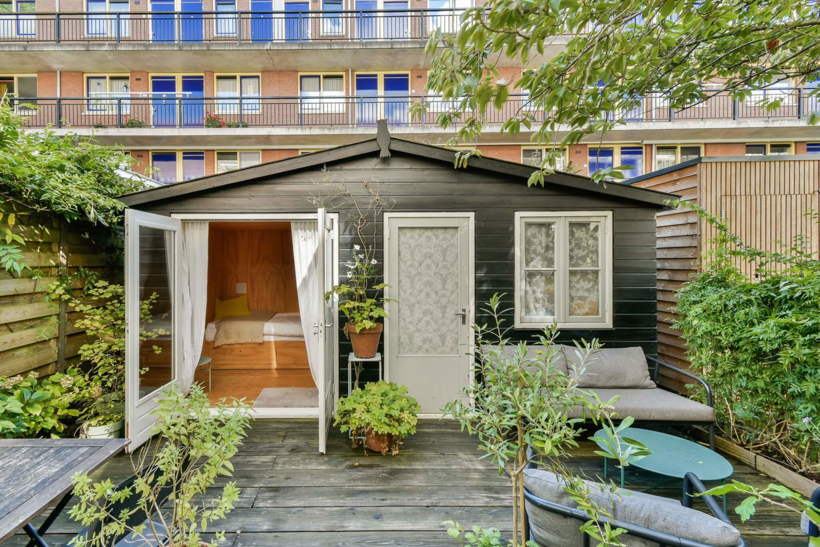 The sunny garden of approximately 28 m² faces southwest and includes a (piled) terrace of one meter deep, as well as a garden house with an additional insulated bedroom and a separate storage room with electricity.