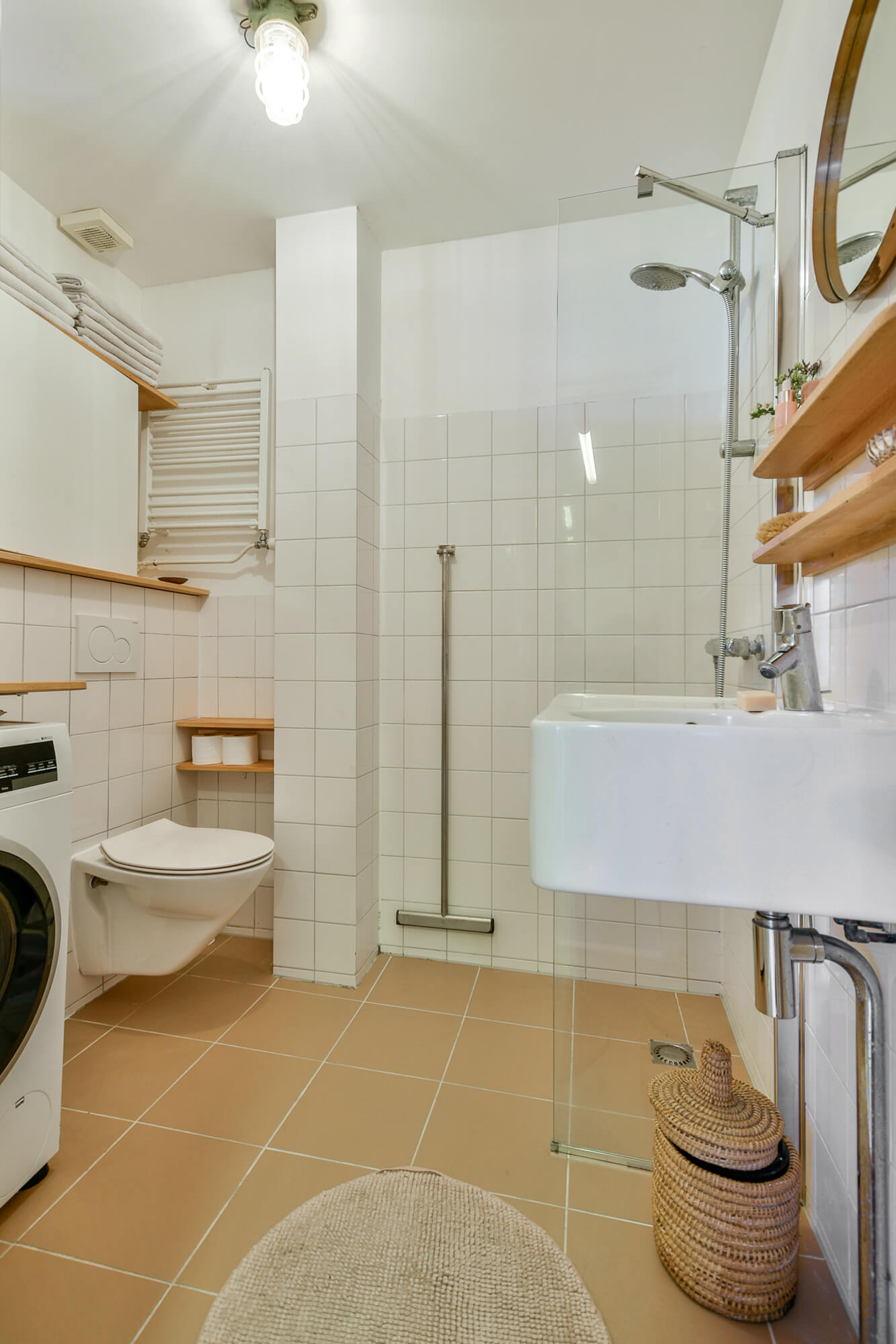 At the front are two well-sized bedrooms, both large enough for a comfortable double bed. The third bedroom at the rear is versatile—ideal as a home office, or you can choose to extend the living area instead. The bathroom is neatly finished and features a walk-in shower, washbasin, toilet, heated towel rack, and washing machine connection.