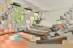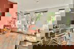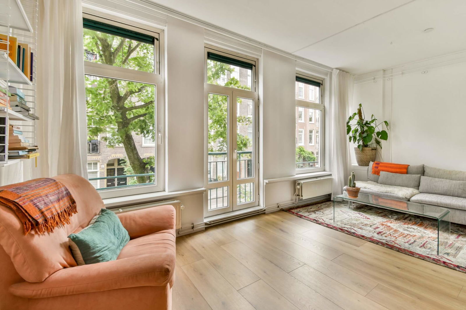 Lichte woonkamer met een Frans balkon aan de voorzijde en grote ramen die de hele dag zonlicht vangen.