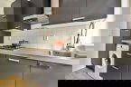 Kitchen at the rear, fitted with appliances, with access to the balcony.