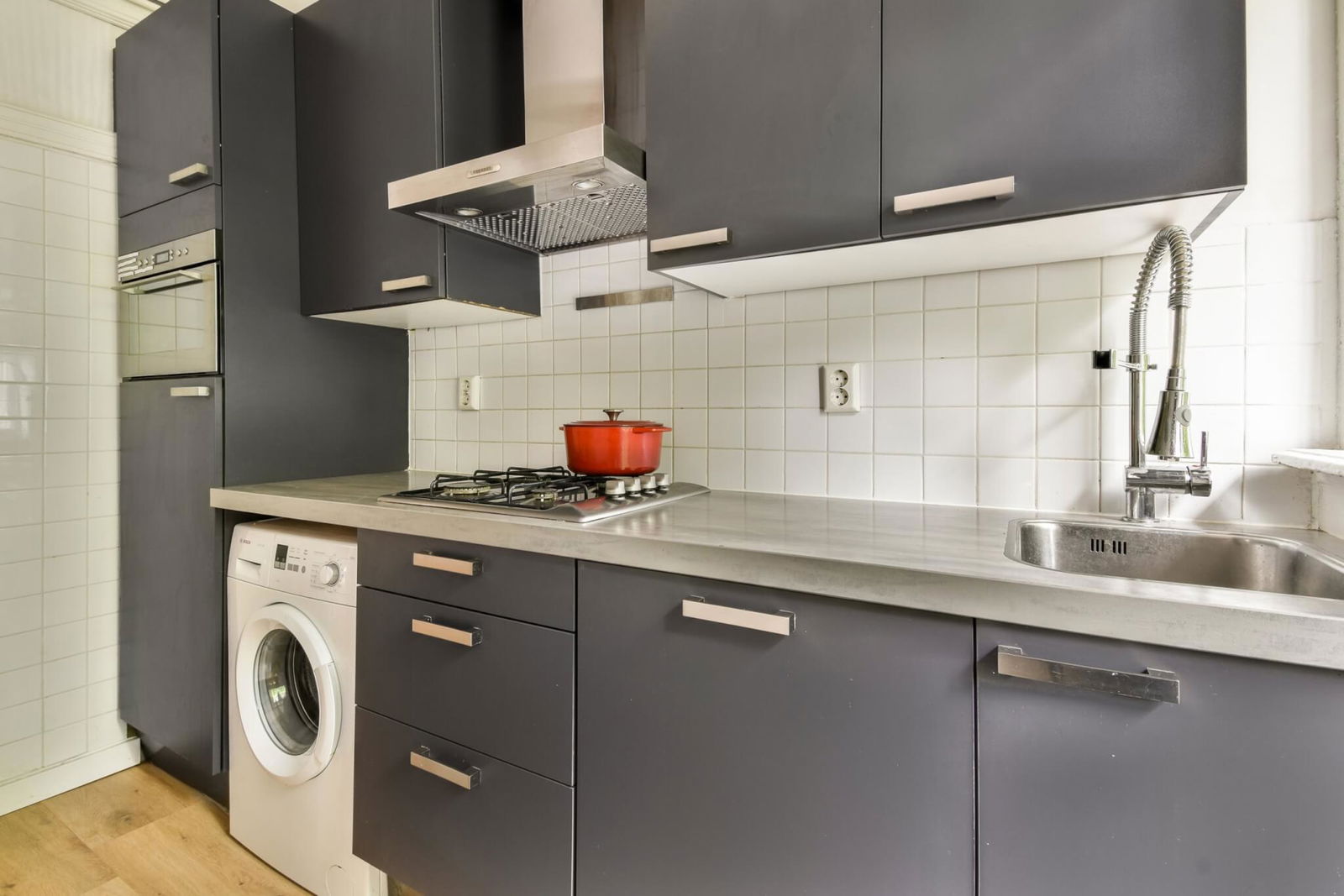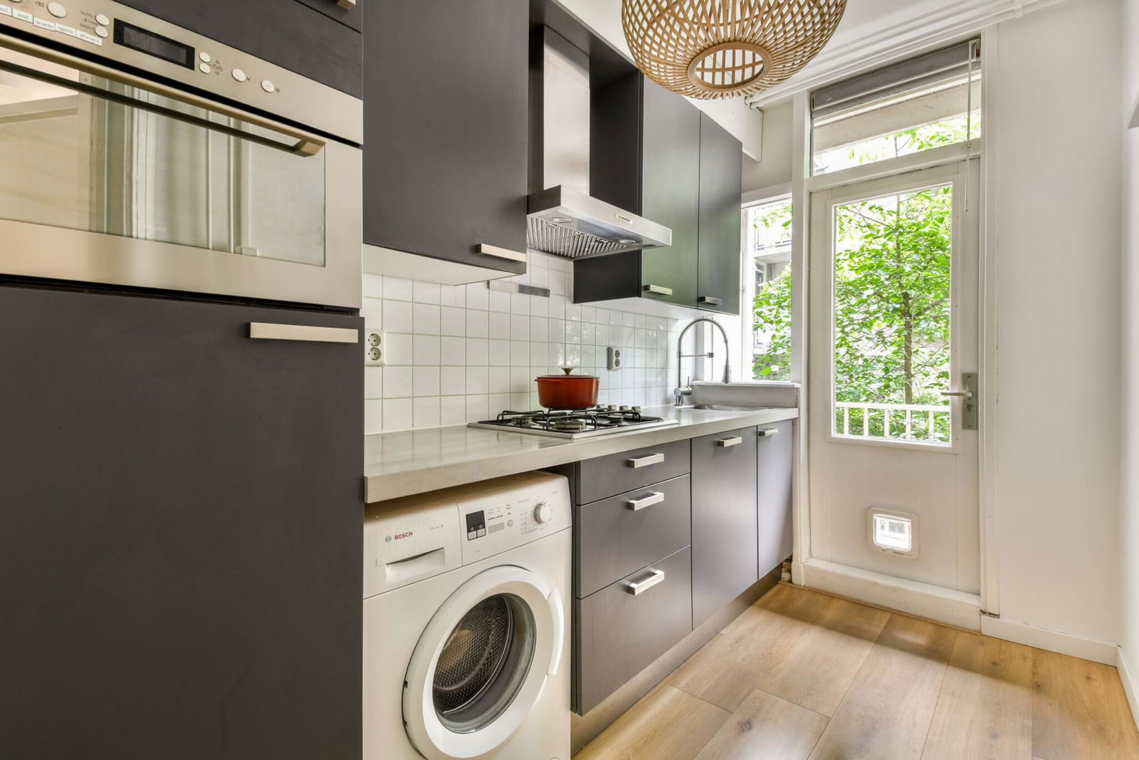 Keuken aan de achterzijde, met inbouwapparatuur en toegang tot het balkon.