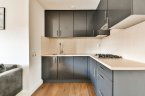 The apartment is located on the third floor and features an entrance hall with toilet, a bright living room with open kitchen equipped with built-in appliances (oven, dishwasher, fridge-freezer combination, and hob).