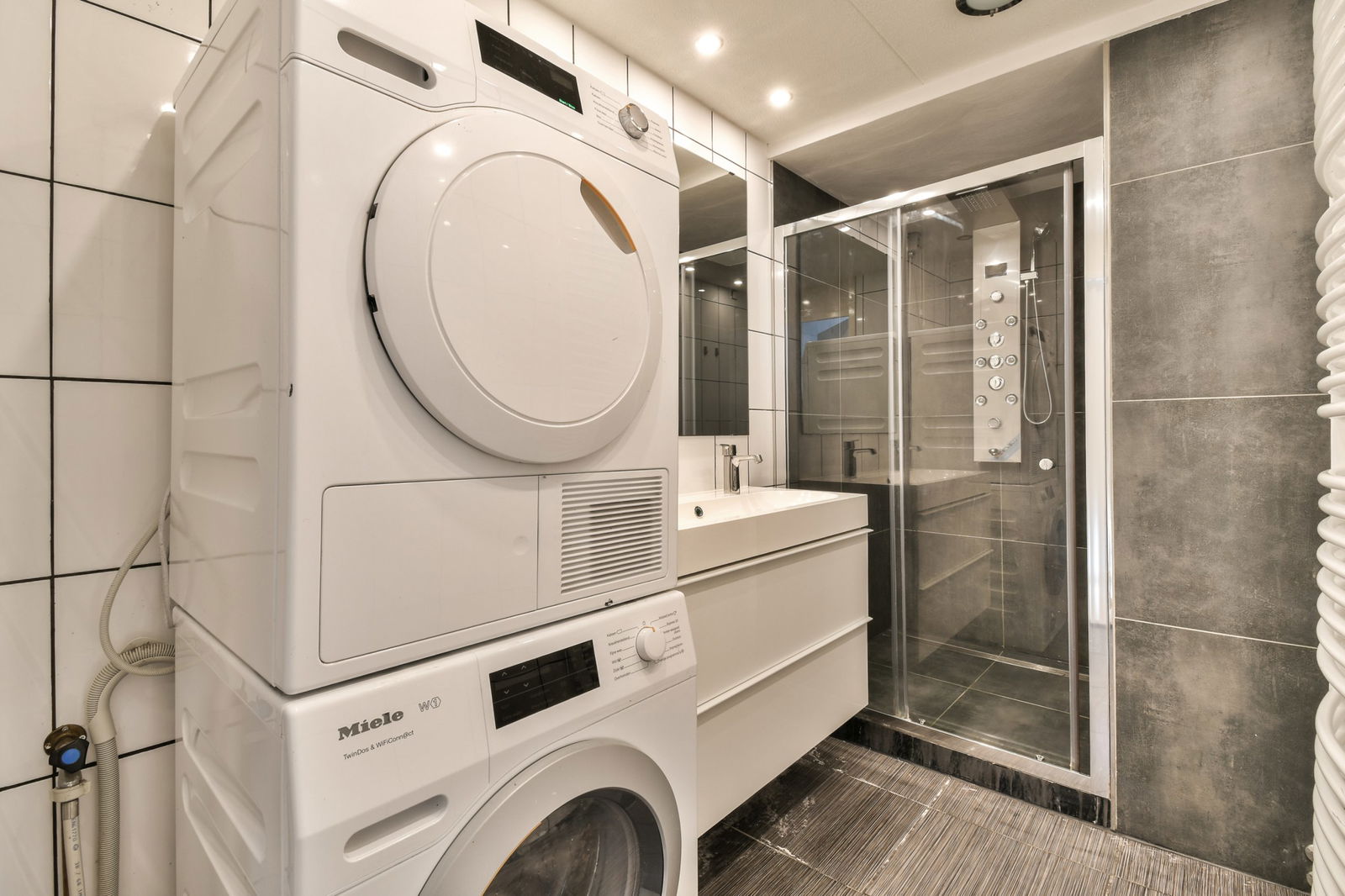 From the bedroom, you have direct access to the sunny rooftop terrace. The bathroom includes a shower, washbasin, and washing machine connection.