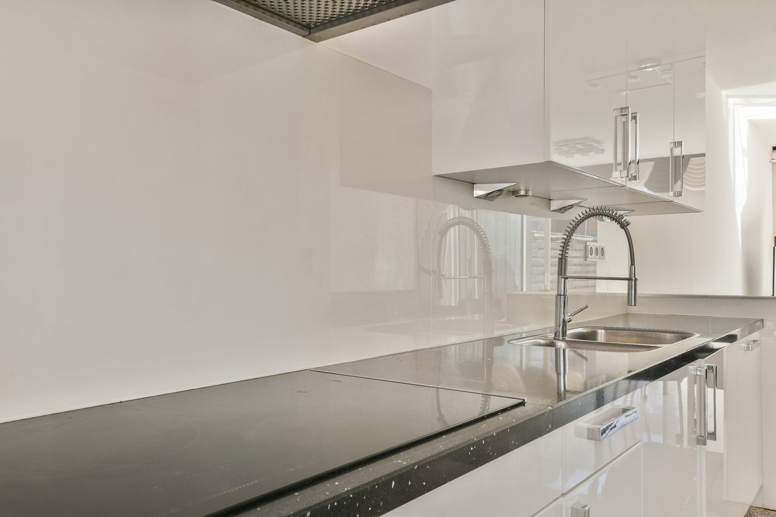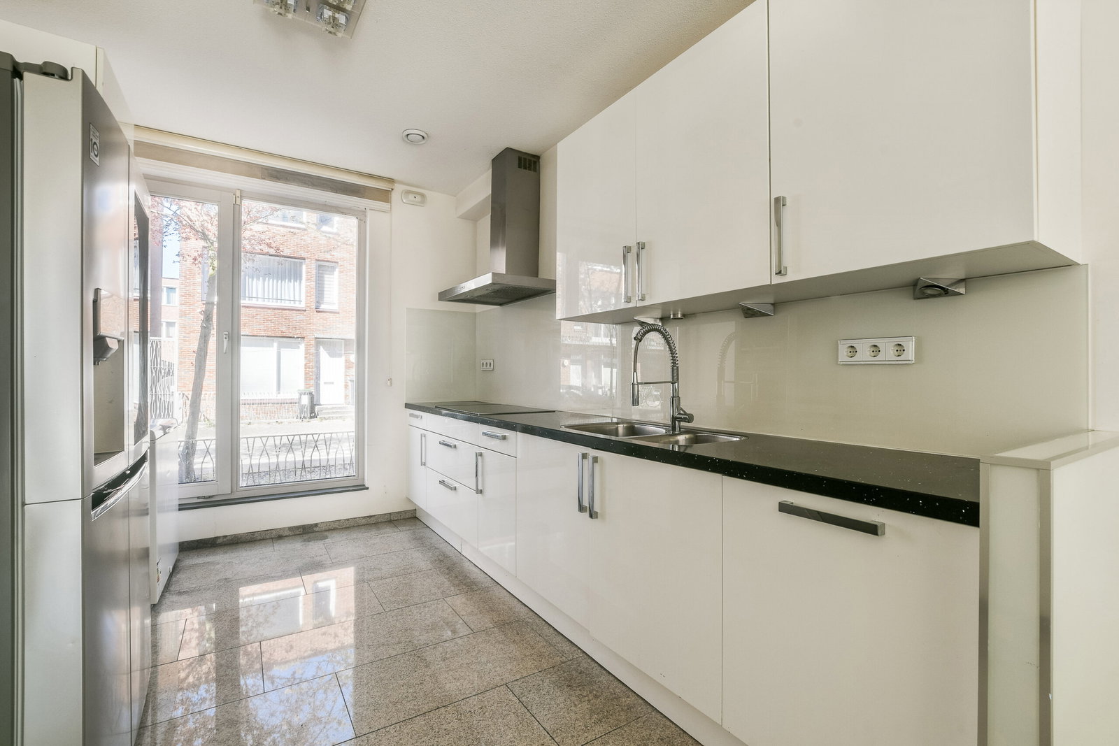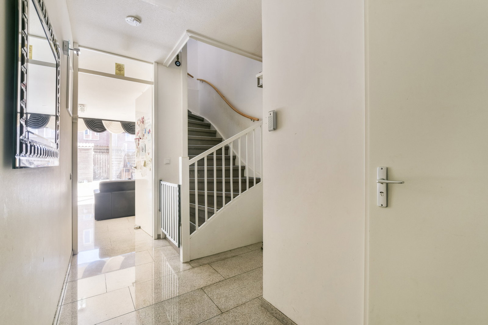 Voortuin, entree van de woning, hal, zwevend toilet met fonteintje. De doorzon woonkamer met trapkast is heerlijk licht en biedt middels een schuifpui toegang tot de achtertuin met houten berging en achterom. De moderne open keuken is voorzien van diverse (inbouw)apparatuur.