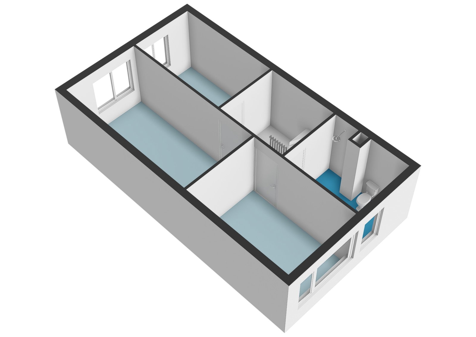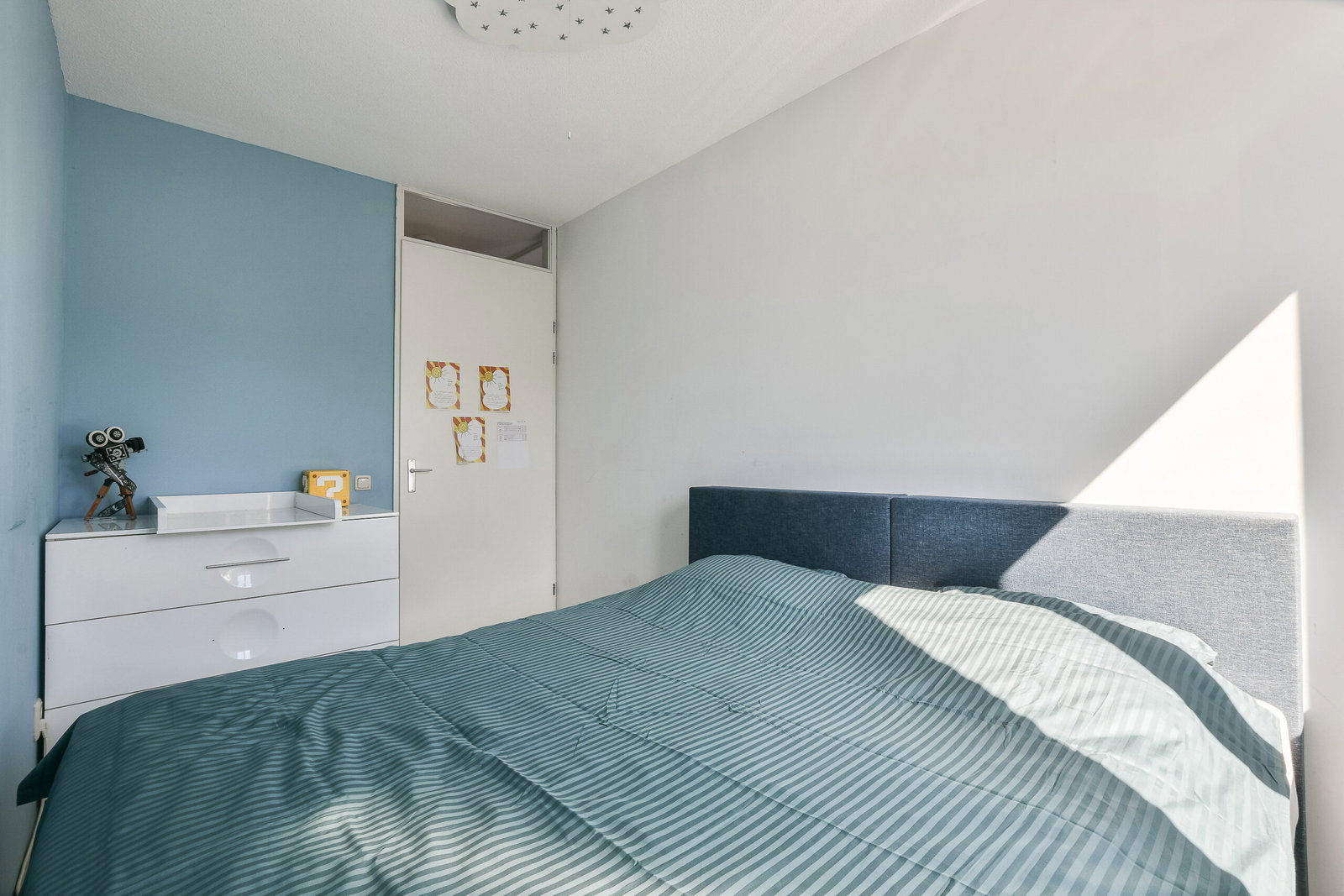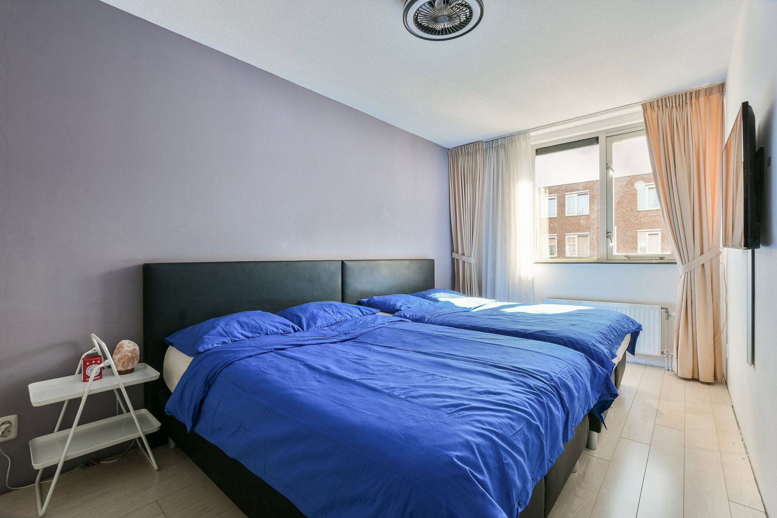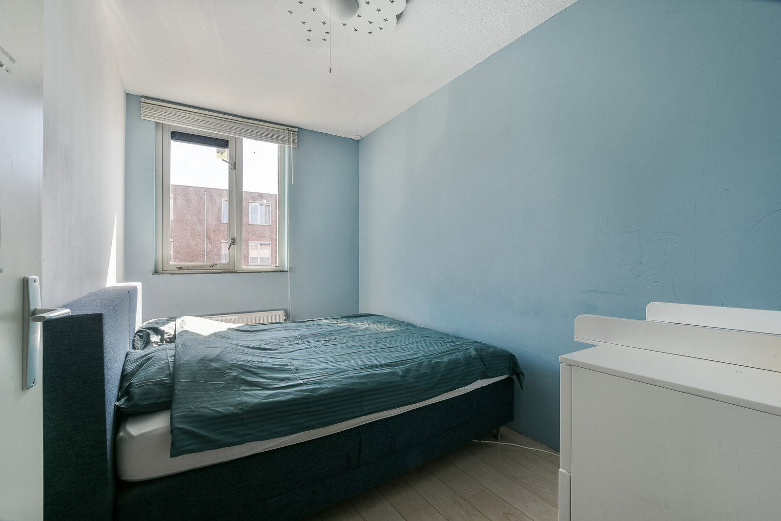 Twee royale slaapkamers waarvan er 1 momenteel open is gemaakt en een inpandige berging met wasmachine aansluiting, kitchenette en mechanische ventilatie unit. Met het terugplaatsen van het wandje heeft u weer beschikking over de tweede slaapkamer op deze verdieping.