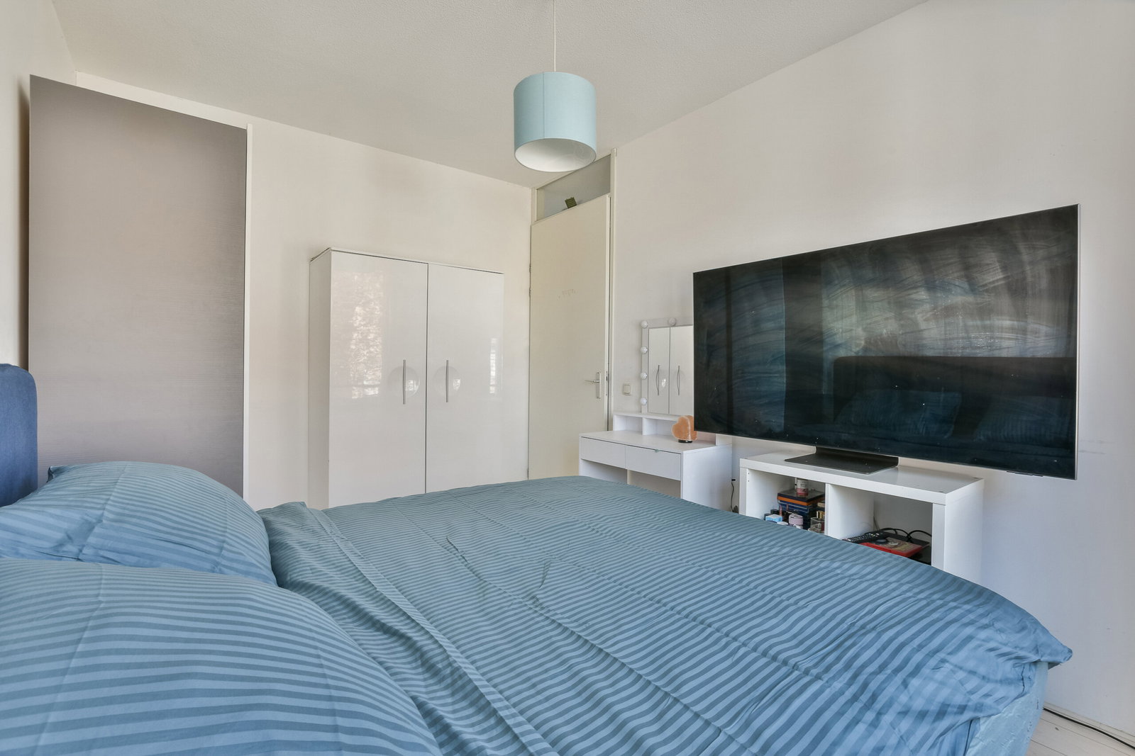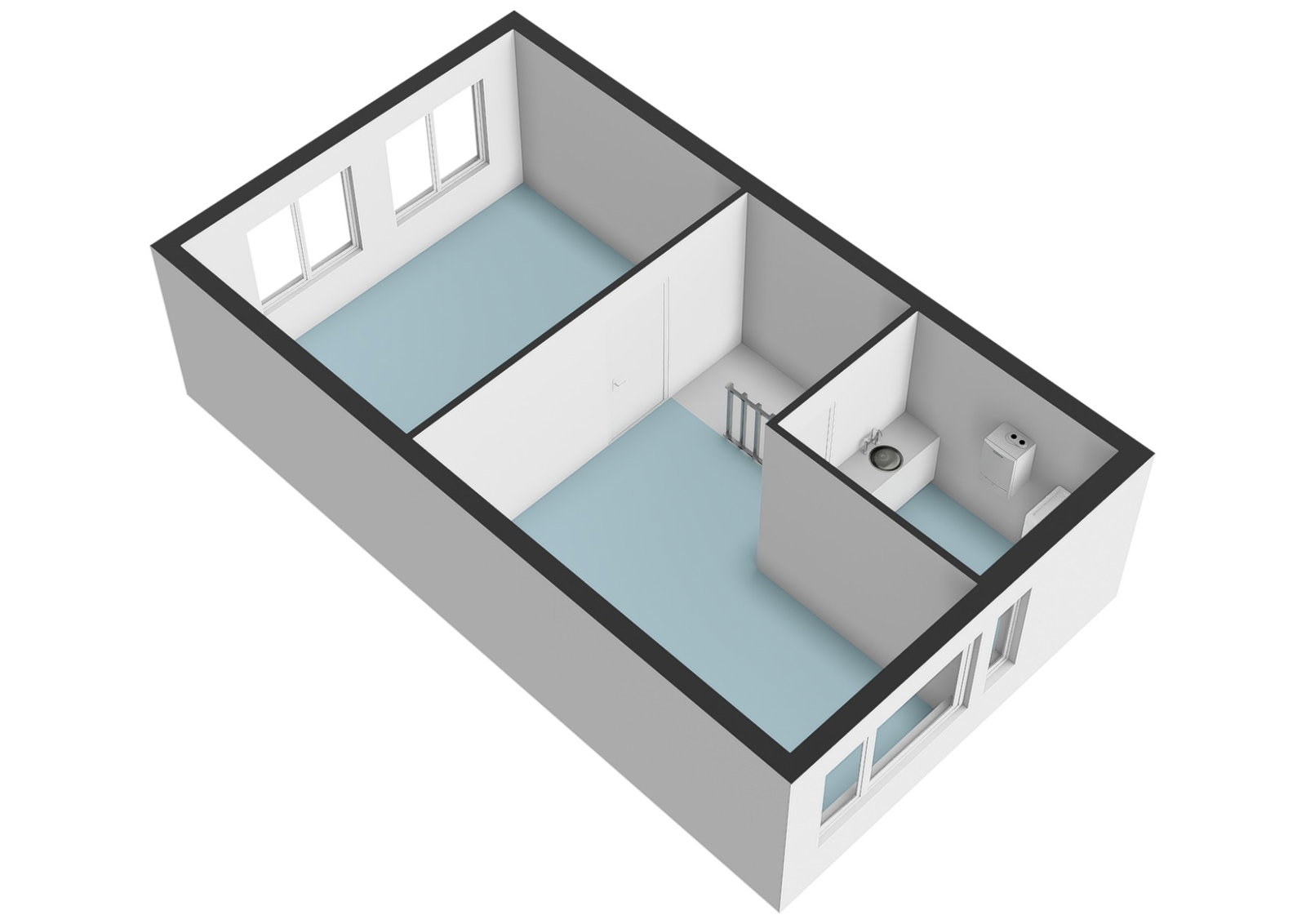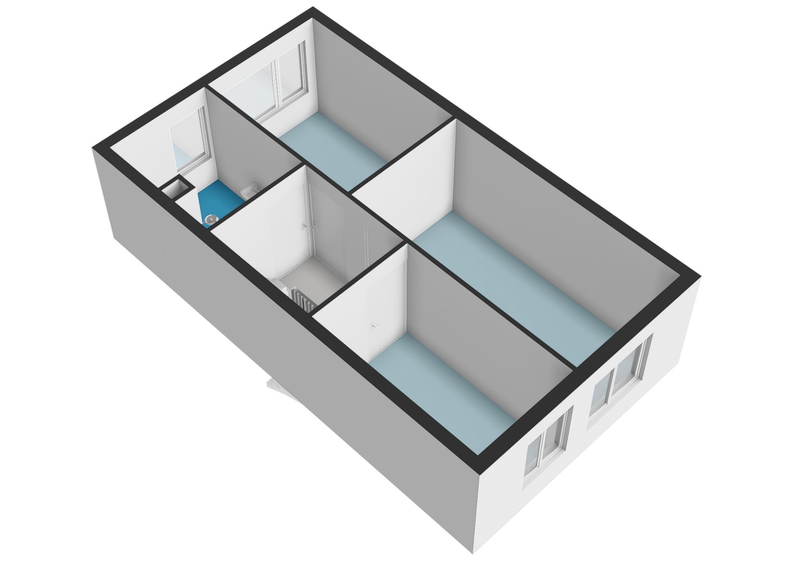 Twee royale slaapkamers waarvan er 1 momenteel open is gemaakt en een inpandige berging met wasmachine aansluiting, kitchenette en mechanische ventilatie unit. Met het terugplaatsen van het wandje heeft u weer beschikking over de tweede slaapkamer op deze verdieping.