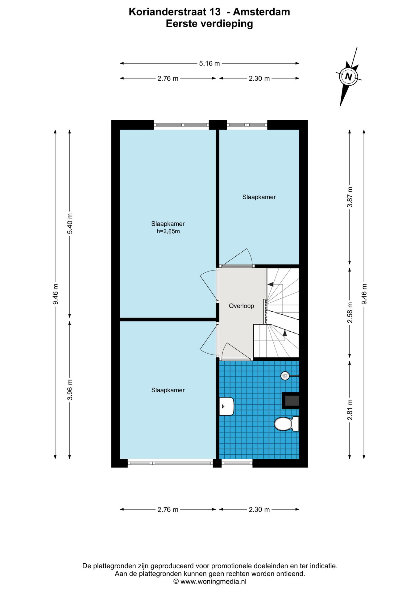 Overloop met toegang tot alle vertrekken. De geheel betegelde badkamer is uitgevoerd en voorzien van douche, zwevend toilet en een wastafel. Op deze verdieping zijn drie slaapkamers gevestigd.