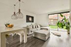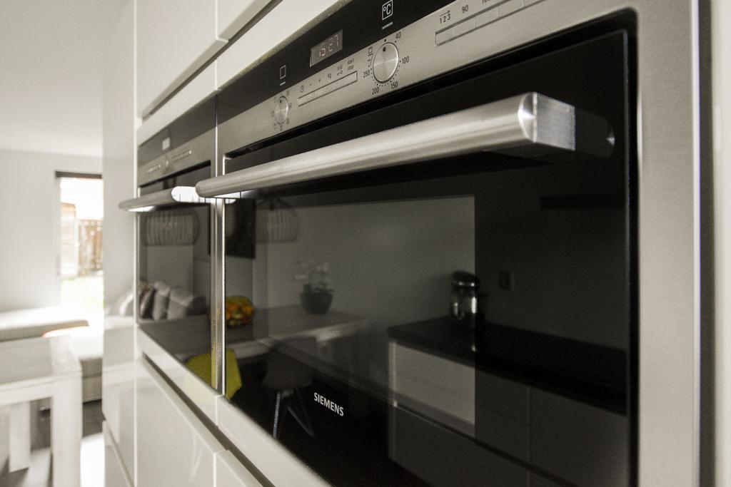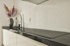 Front garden, entrance to the house, hall, floating toilet with sink. The living room with understairs cupboard is wonderfully light and offers access to the backyard with wooden shed and back entrance through sliding doors. The modern open kitchen is equipped with a sink, dishwasher, refrigerator, freezer, oven, microwave, electric hob and extractor hood.