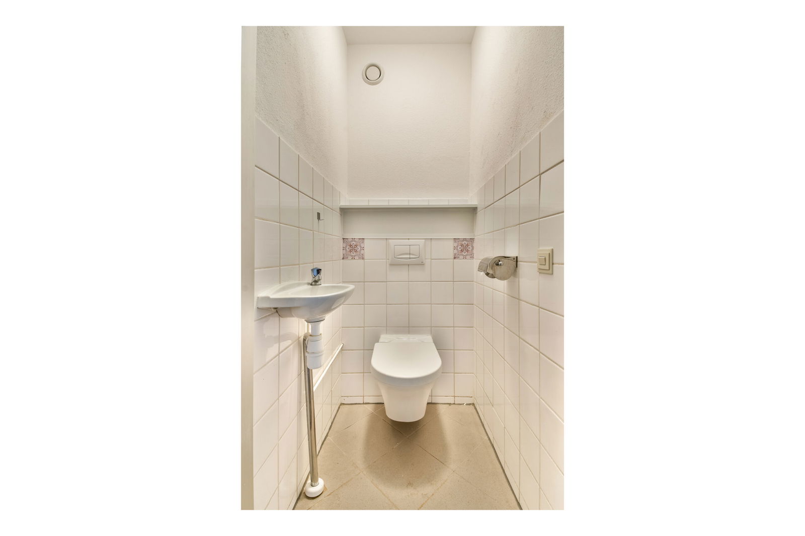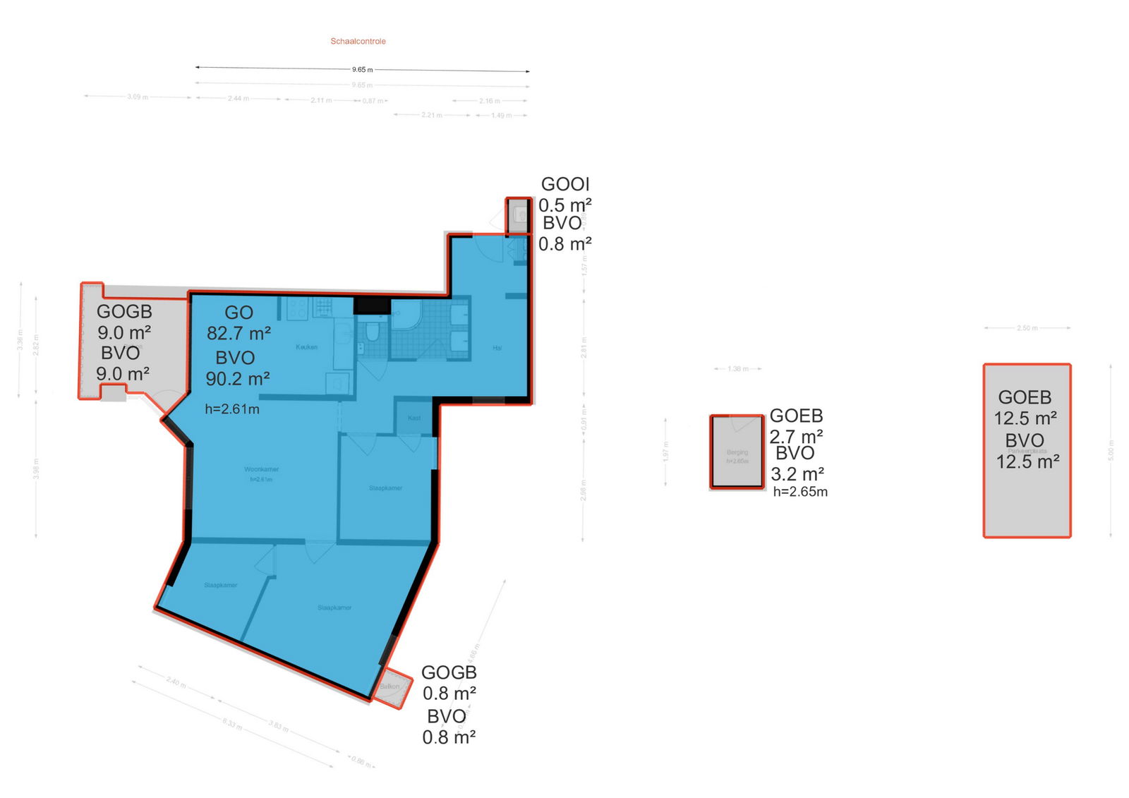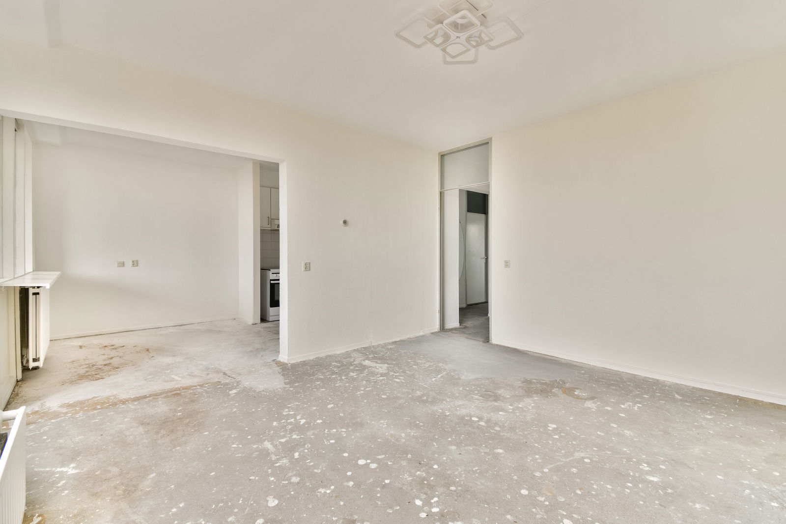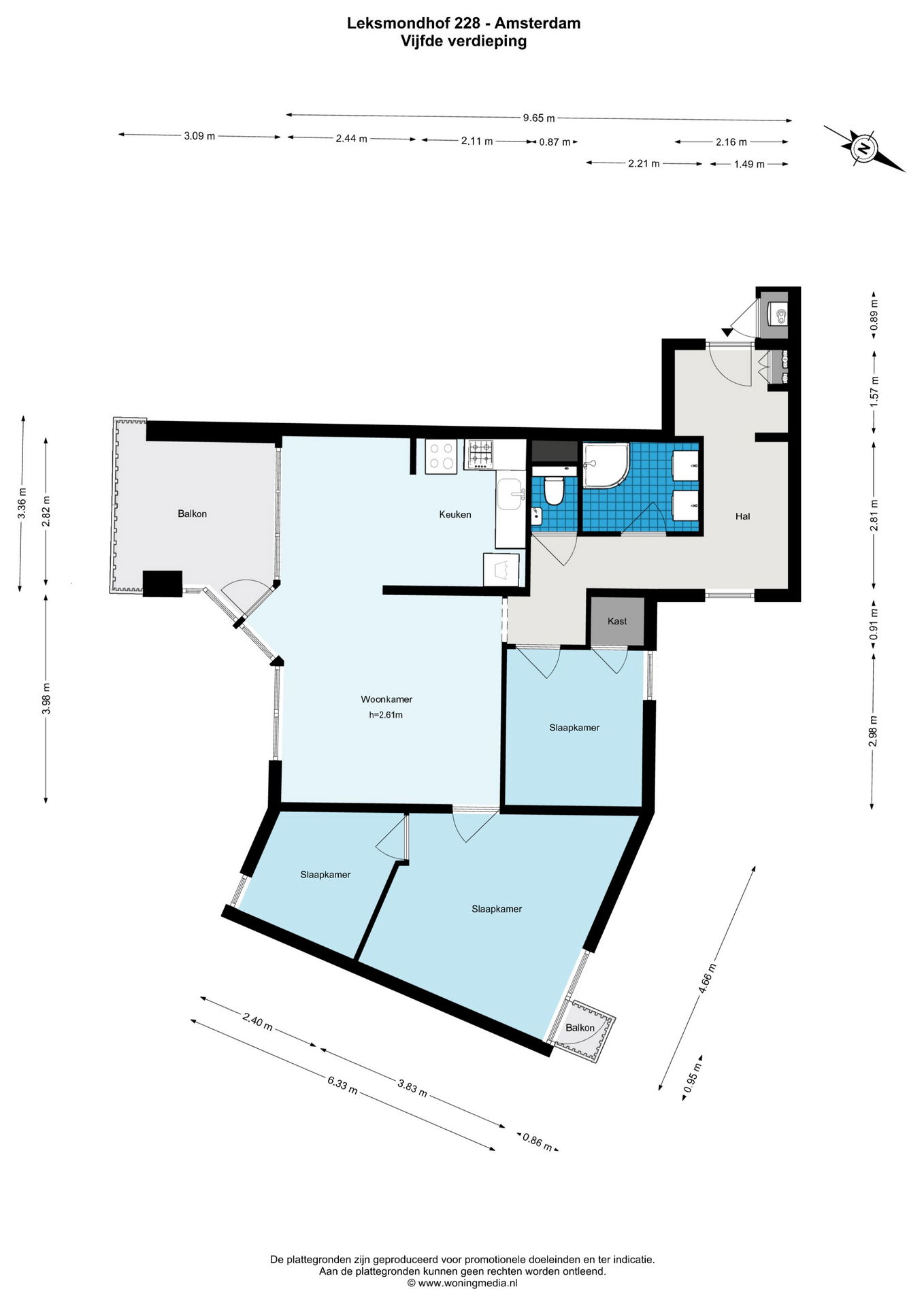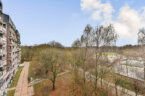 Entrance on the 5th floor. Hallway with meter cupboard, separate toilet with small sink and access to the various rooms. Bathroom with shower and washbasin unit. Bedroom 1. Spacious living room with semi-open kitchen and access to the large southeast-facing balcony. Bedroom 2 with adjoining storage room/extra (home office) room.