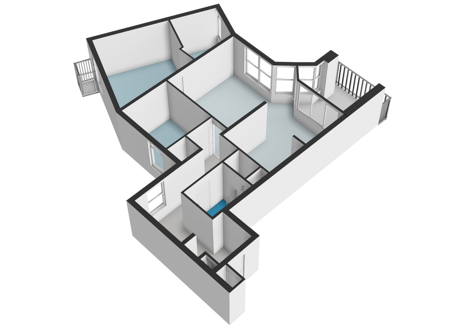 Entree op de 5e verdieping. Hal met meterkast, separaat toilet met fontein en toegang tot de verschillende vertrekken. Badkamer voorzien van douche en wastafelmeubel. Slaapkamer 1. Ruime woonkamer met halfopen keuken en toegang tot het grote balkon op het zuidoosten. Slaapkamer 2 met aangrenzende berging/extra (werk)kamer.