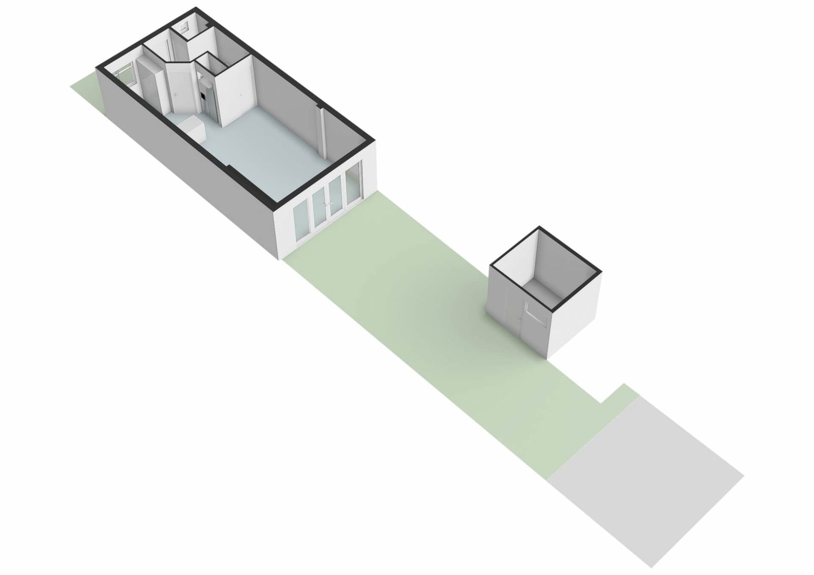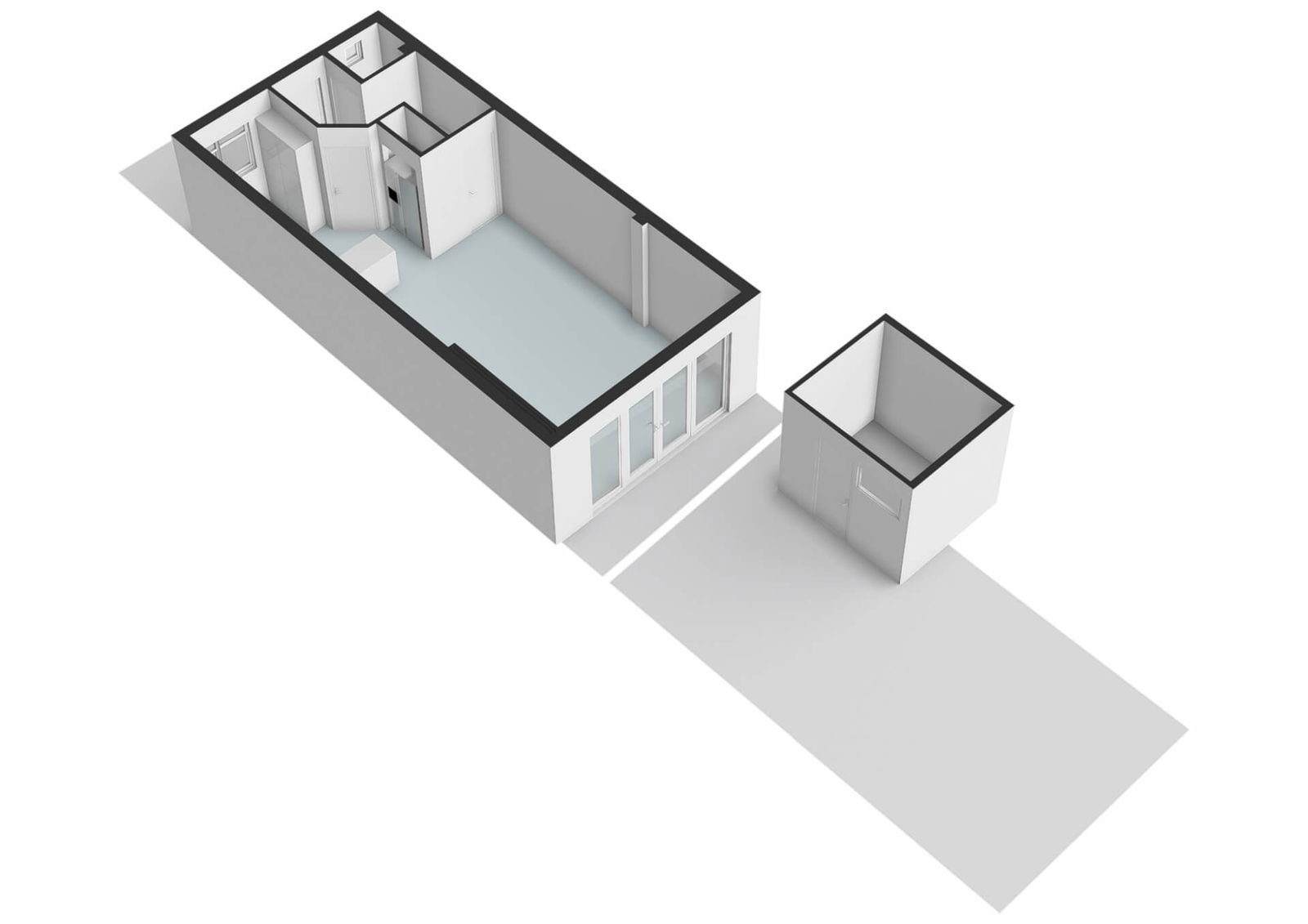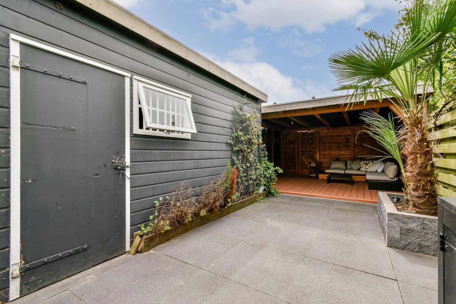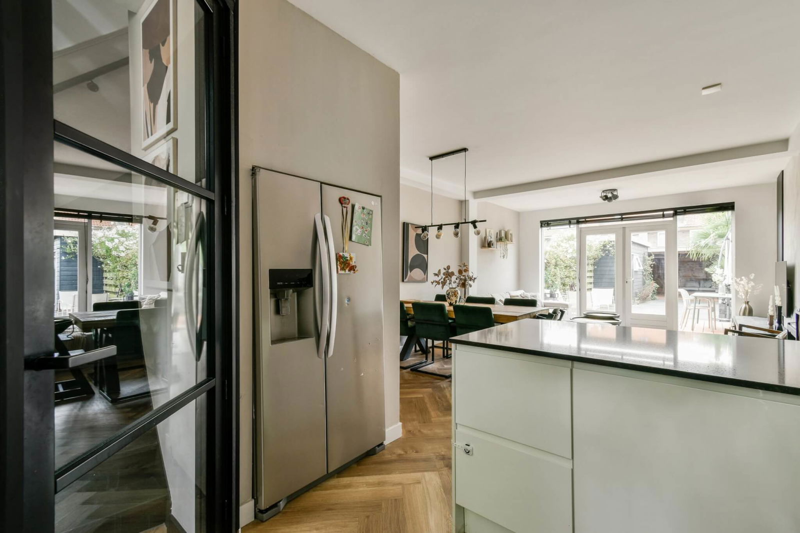 Entree, hal met toilet en toegang tot de woonkamer met moderne open keuken, voorzien van inbouwapparatuur. Door de uitbouw aan de achterzijde is de woonkamer heerlijk ruim en licht. Vanuit hier bereikt u de zonnige, diepe tuin op het zuidwesten, compleet met schuur.