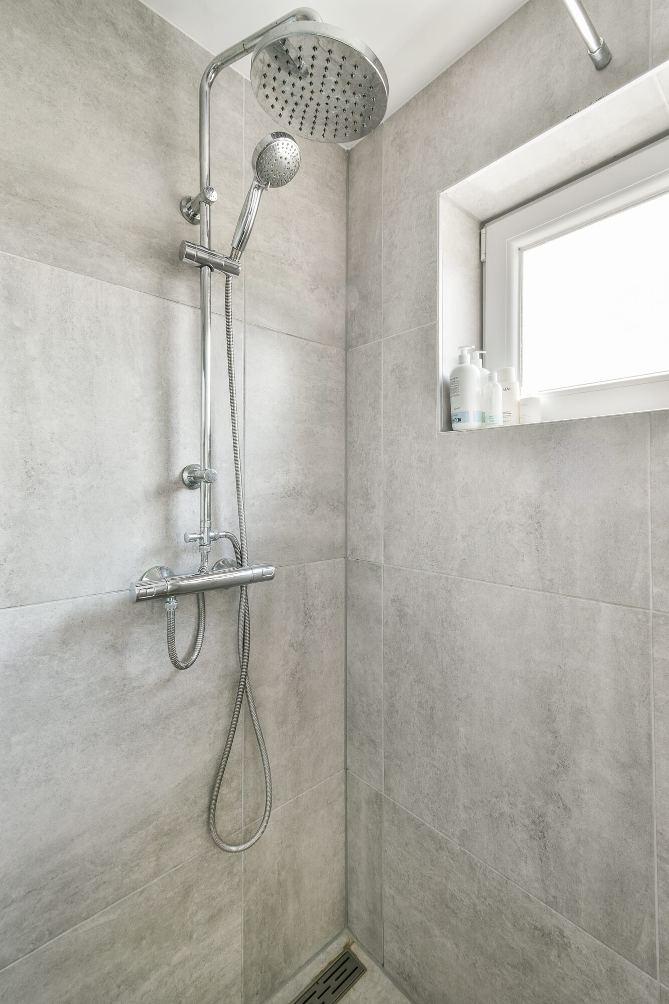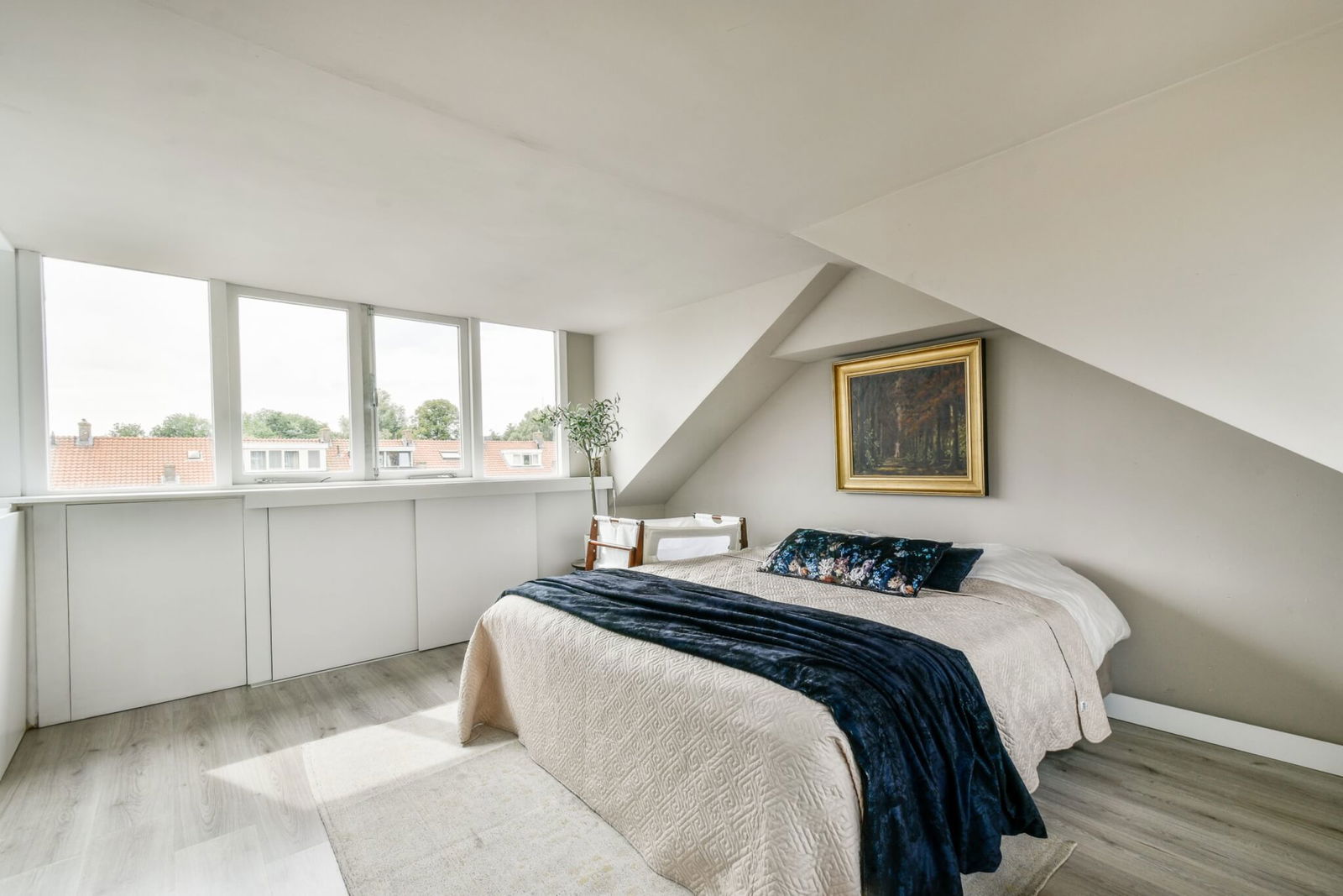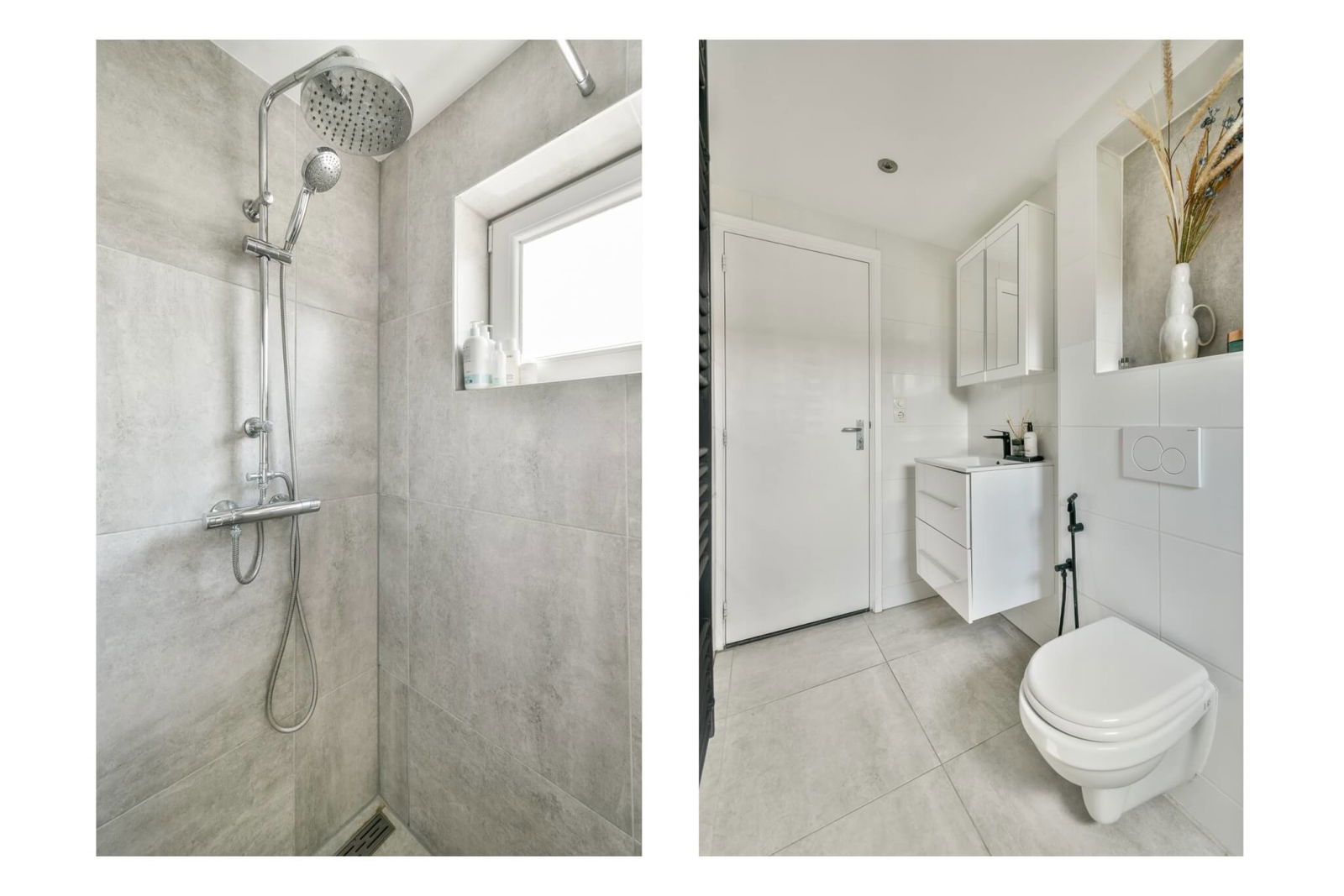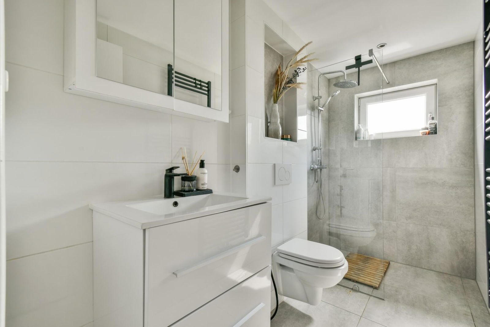 Overloop, twee ruime slaapkamers en een luxe badkamer met inloopdouche, tweede toilet en wastafel.