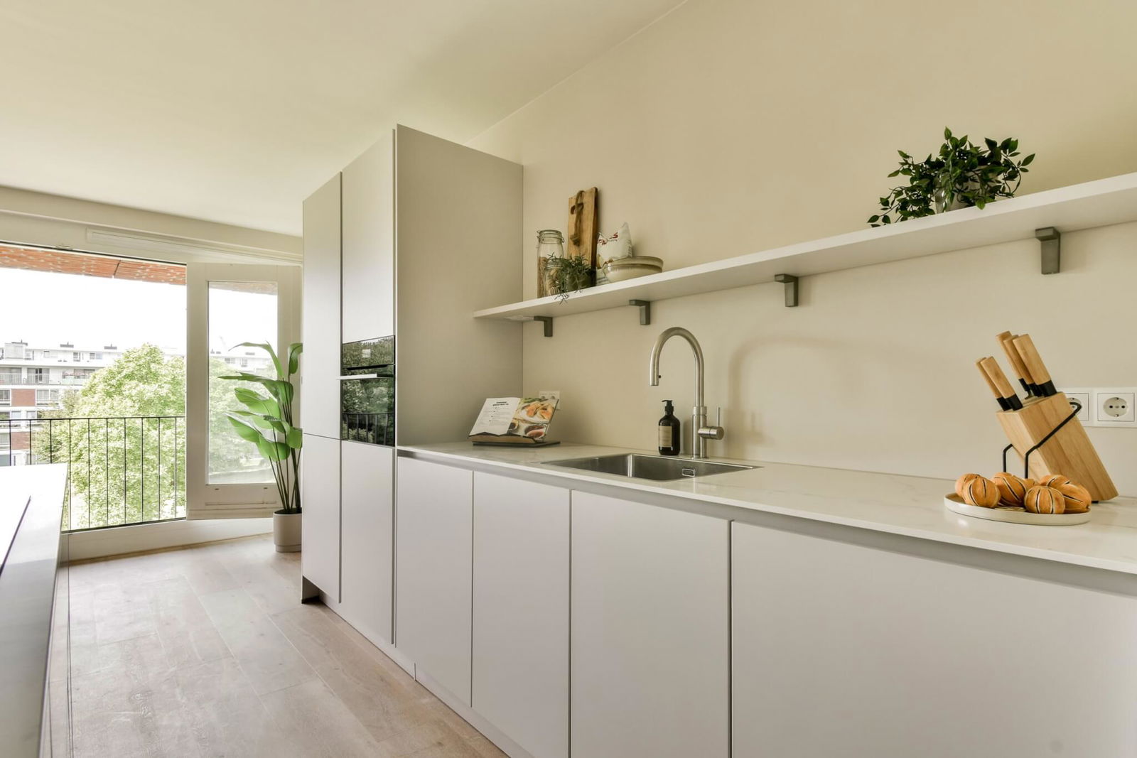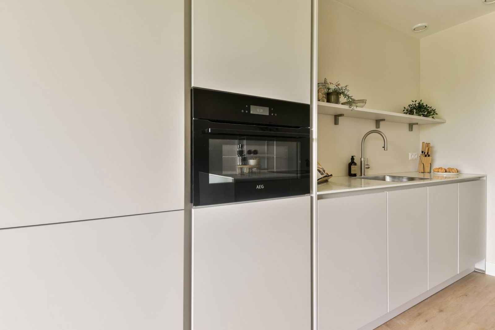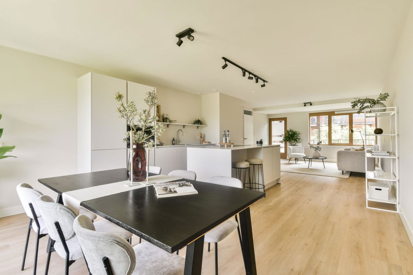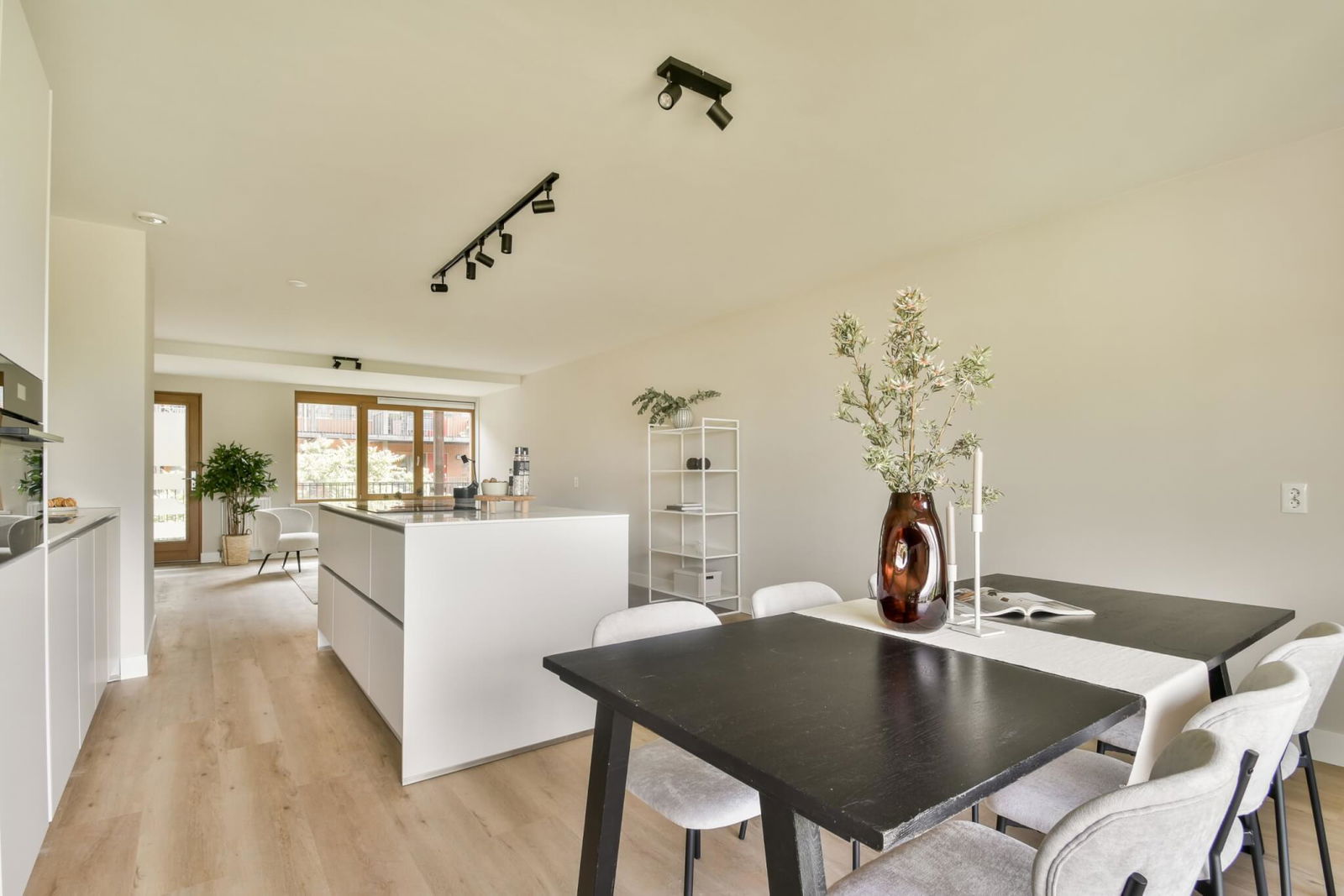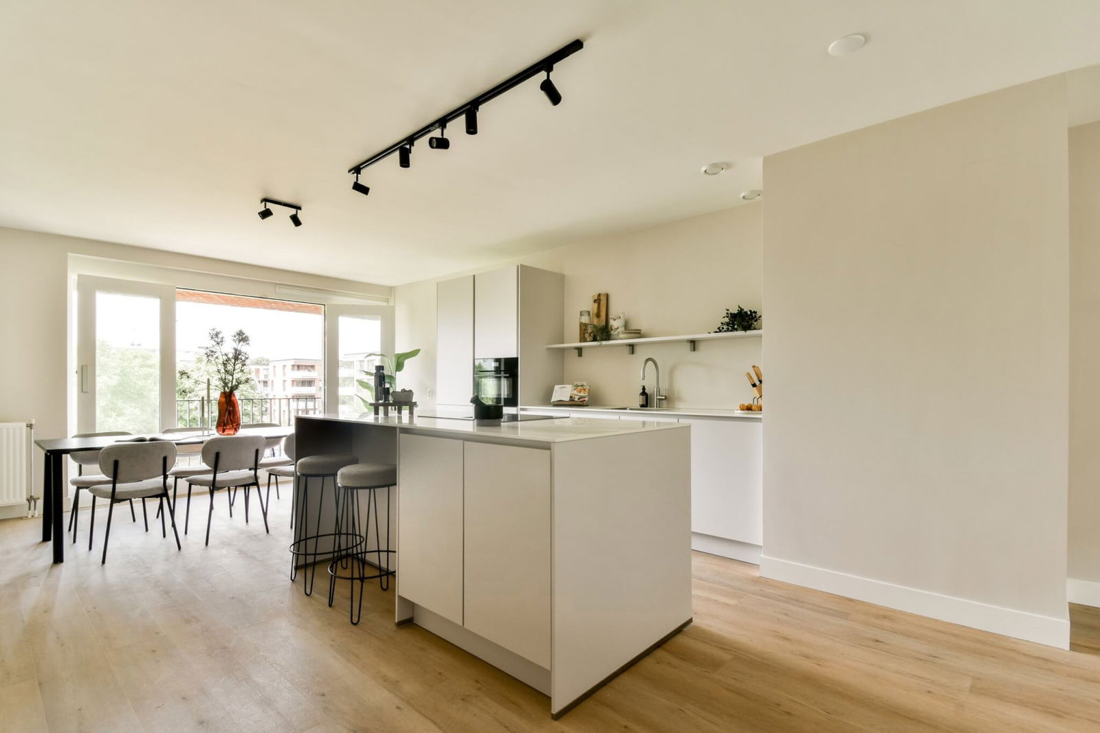 Entree, hal, zeer ruime doorzon woonkamer met luxe open keuken met kookeiland en bargedeelte. Aan deze keukenbar is het heerlijk borrelen met vrienden of voor een gezellig ontbijt. De woonkamer is zo groot dat er voldoende ruimte is voor een eethoek en zithoek en het is er heerlijk licht door de grote raampartijen. Vanuit de achterzijde van de woning (met Franse balkons) heb je een prachtig vrij uitzicht zicht op het parkje achter het complex. Hier kan je genieten van de middag- en avondzon.