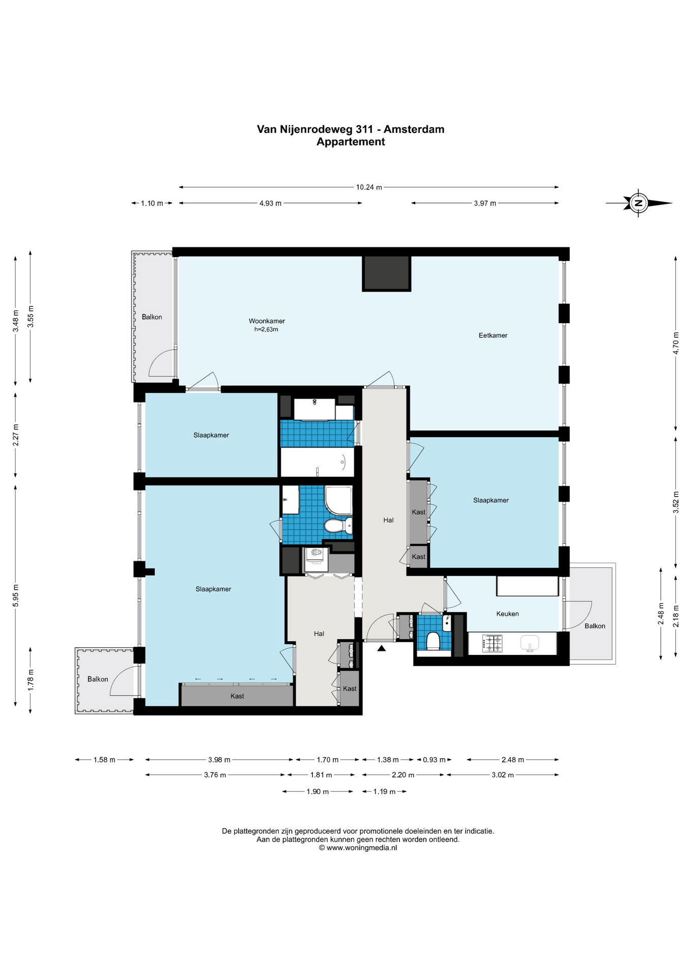 De woning beschikt over drie slaapkamers, twee badkamers, twee bergingen en een zonnig balkon op het zuiden.