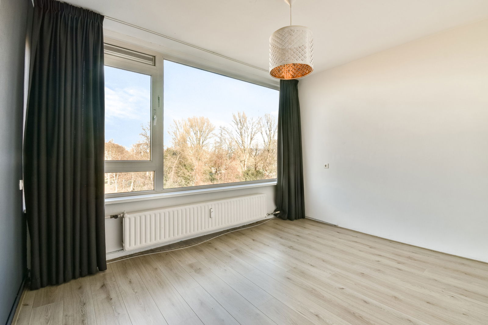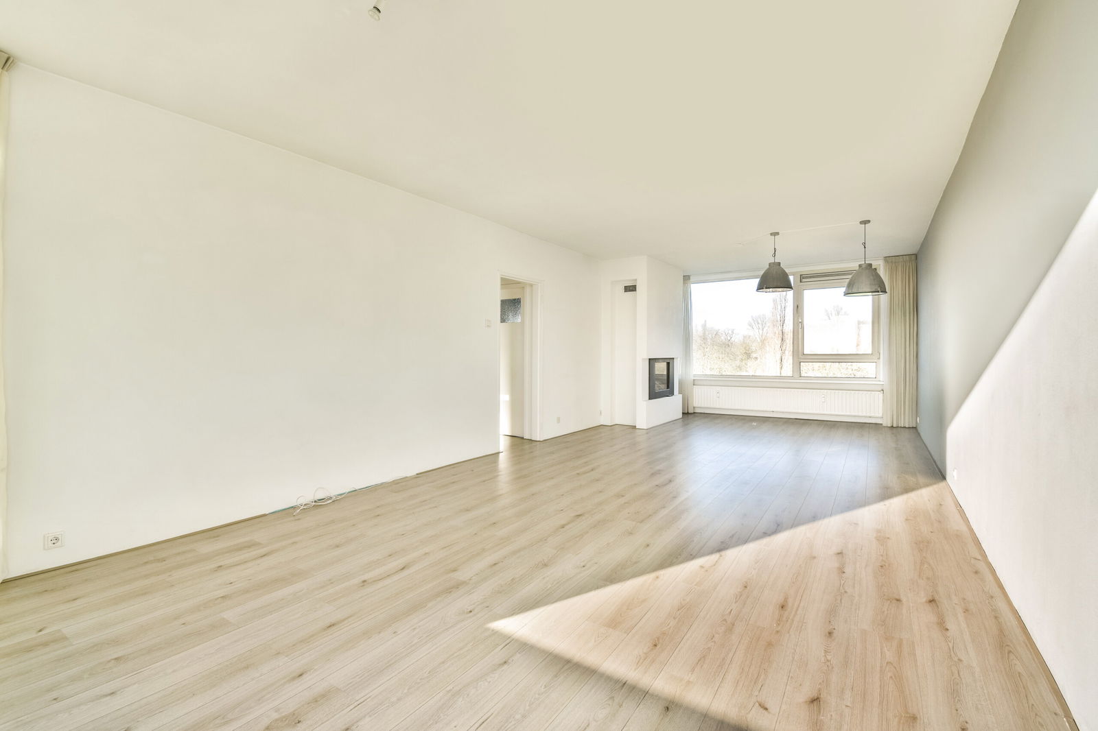 Heerlijk ruime en lichte woonkamer (40m2) met geheel vrij uitzicht op het groene Weizigtpark. Er is een schouw met elektrische sfeerhaard en een toegangsdeur naar het balkon gelegen op het zuiden.