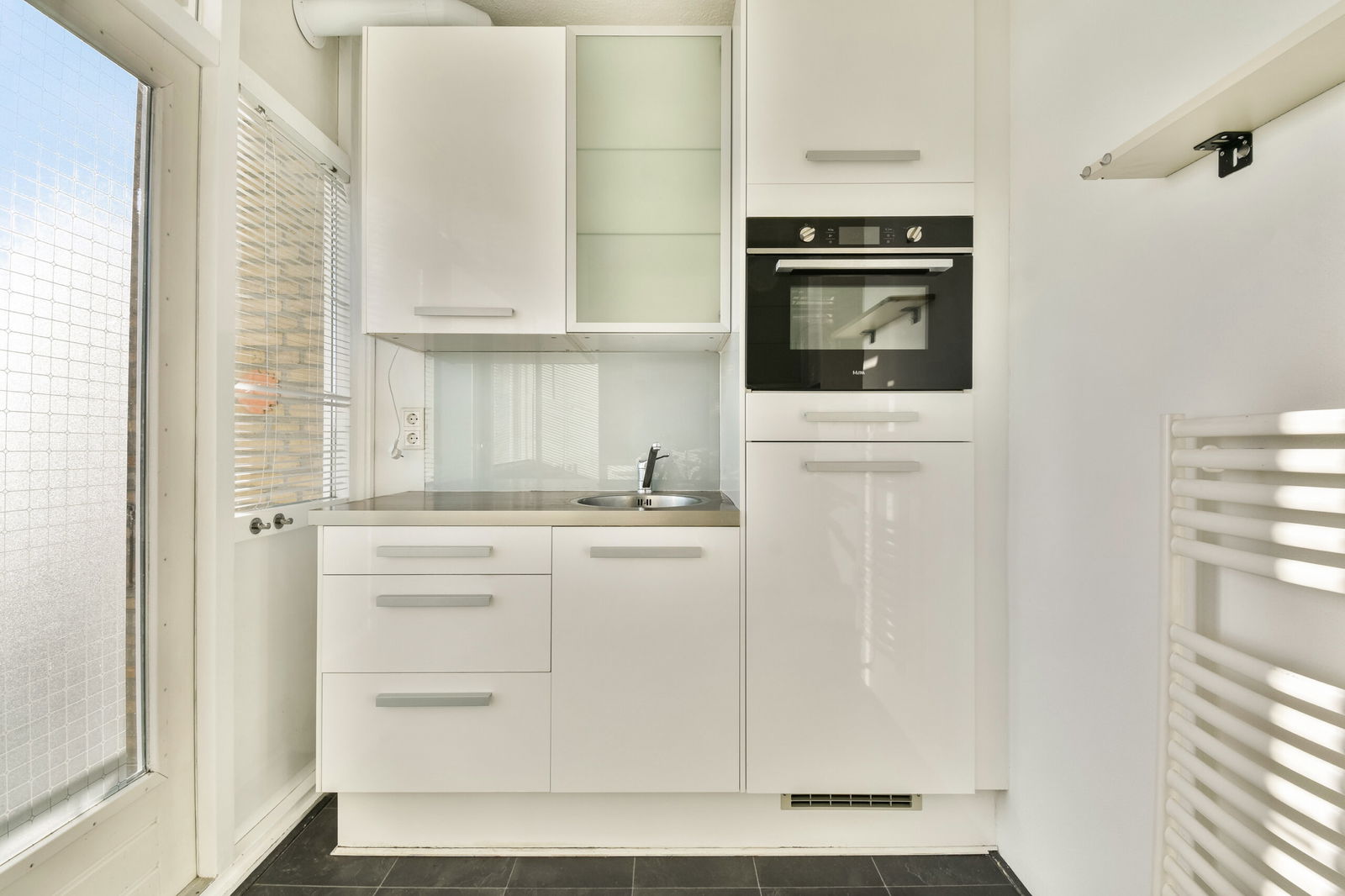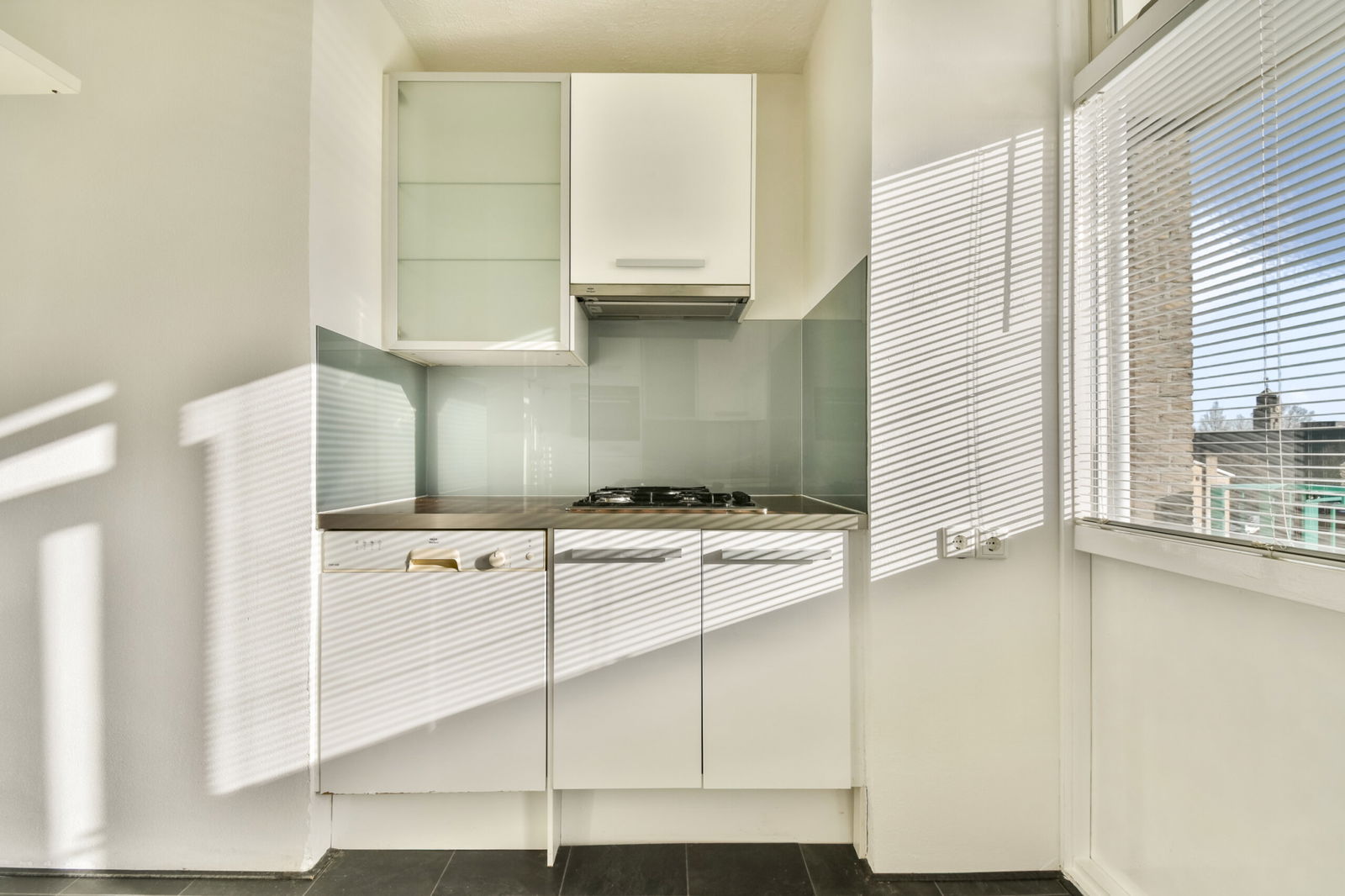Dichte keuken v.v. vlakscherm afzuigkap, glazen spatwand, combi-oven, 4-pits gaskookplaat, koel-/vriescombinatie en balkondeur) de keuken heeft nog houten kozijnen v.v. dubbel glas.