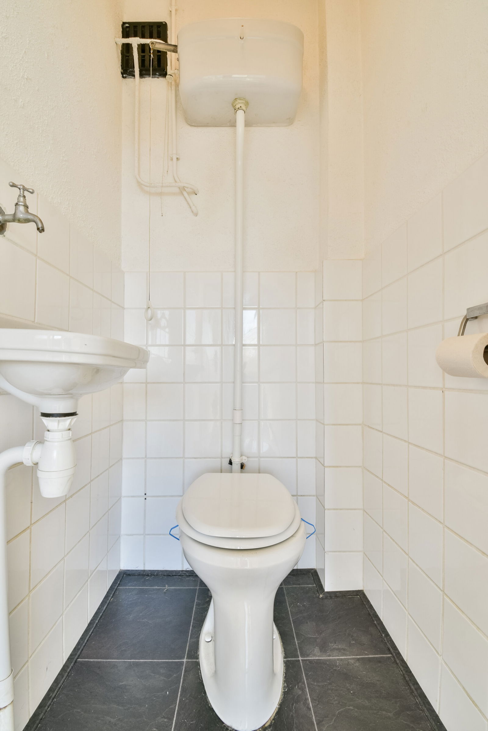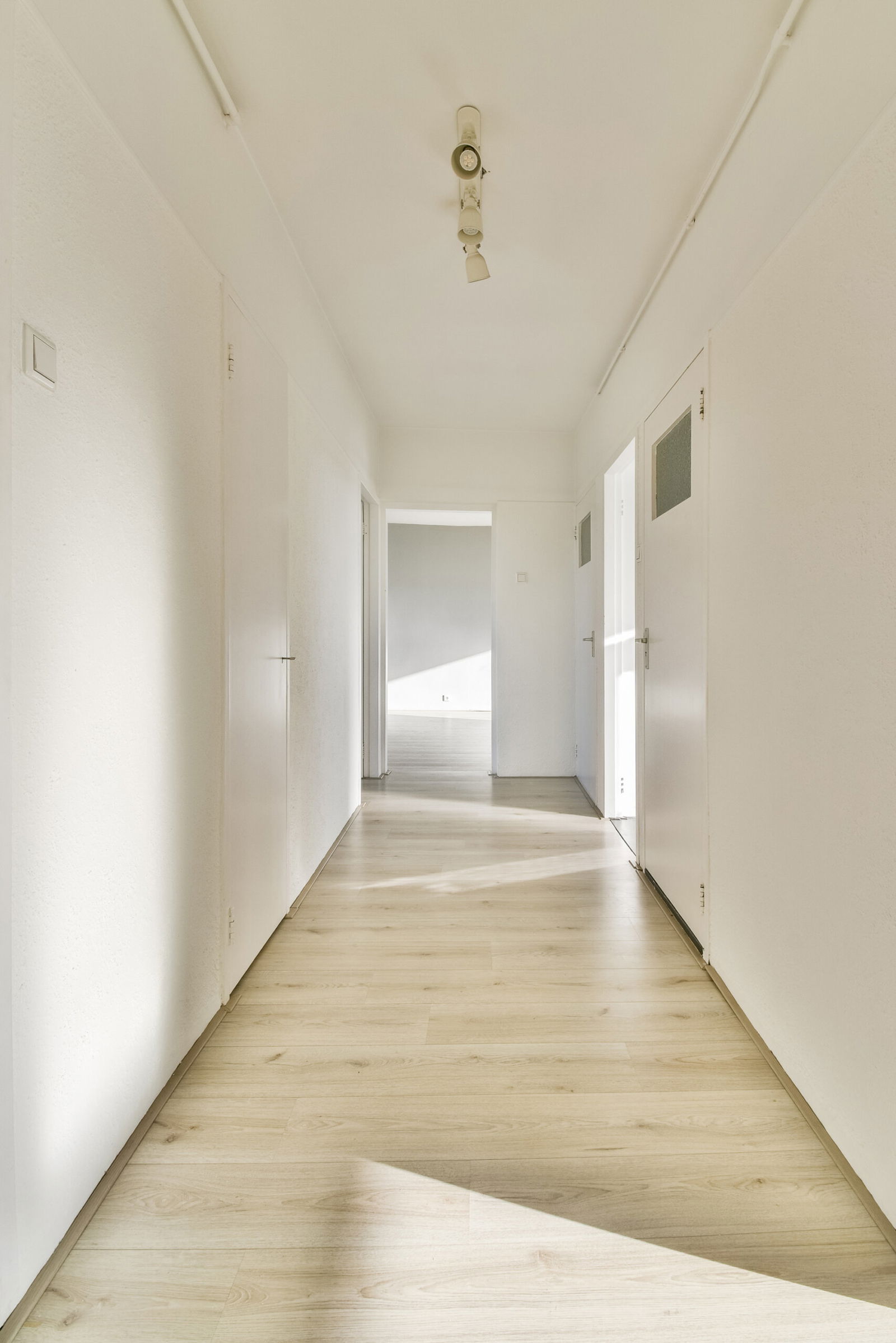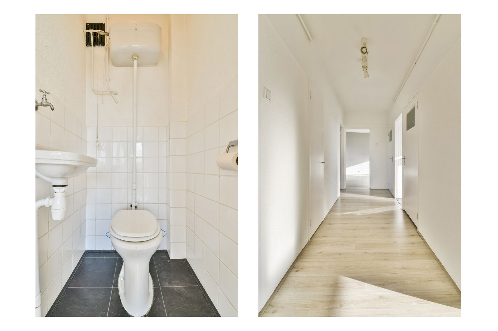 Entree/hal v.v. deuropener, de groepenkast (5 groepen, 2x aardlek-en 1x hoofdschakelaar), toegang tot een voorraadkast en de half betegelde toiletruimte. Vanuit hier bereikt u verder alle ruimtes en overal ligt houtlook laminaat.