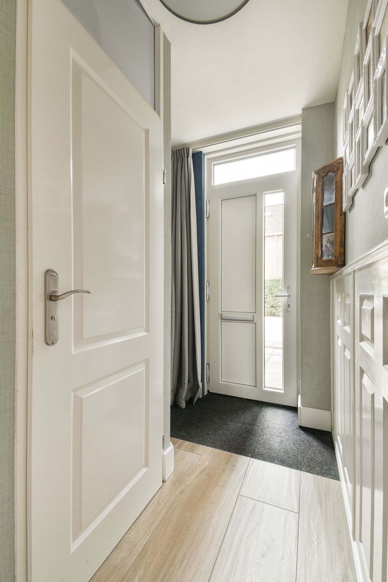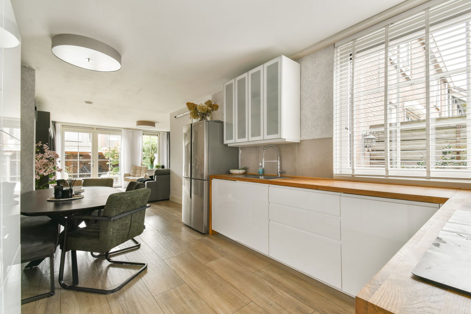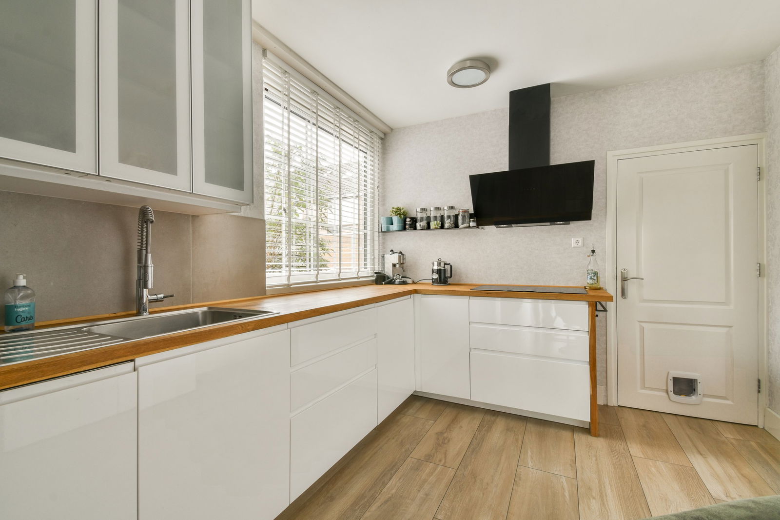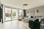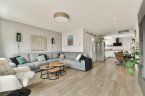 Entree met hal, toilet en toegang tot de lichte woonkamer met open keuken. De moderne keuken is praktisch ingericht en voorzien van de nodige inbouwapparatuur. Aansluitend bevindt zich een handige wasruimte. De woonkamer heeft grote ramen en openslaande deuren naar de tuin, wat zorgt voor veel lichtinval en een fijne leefruimte.